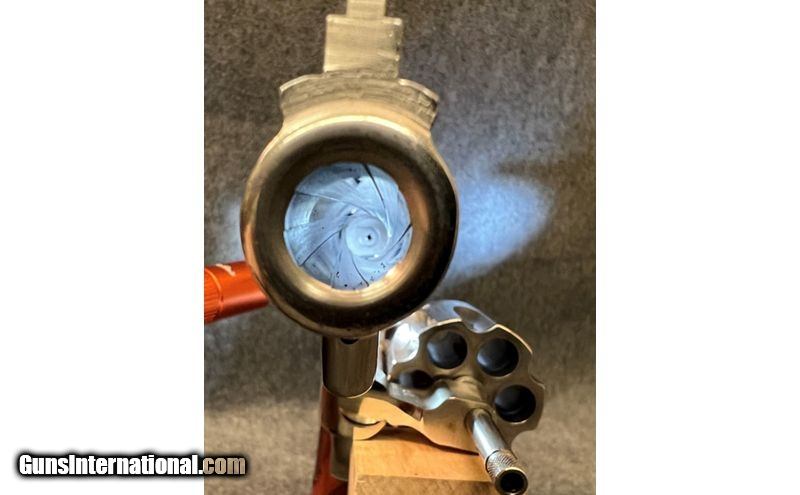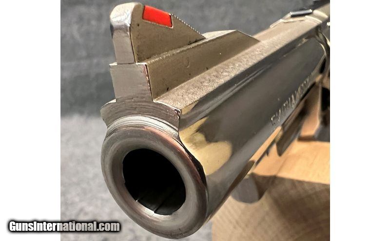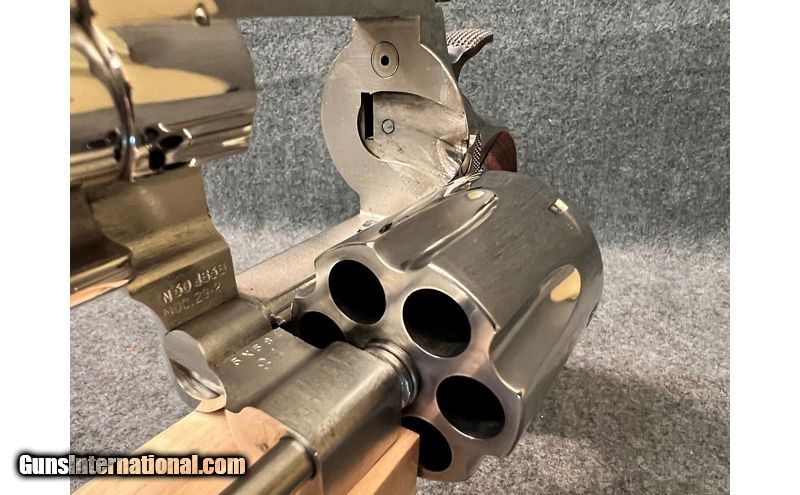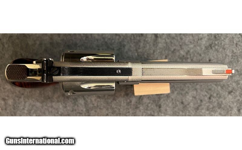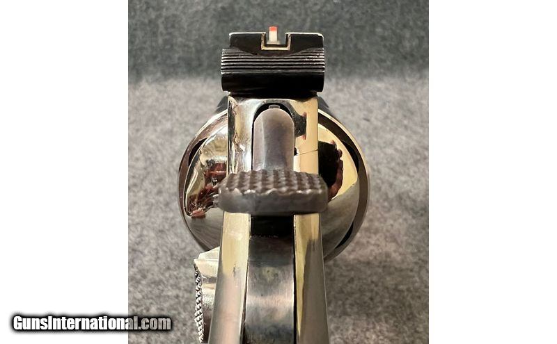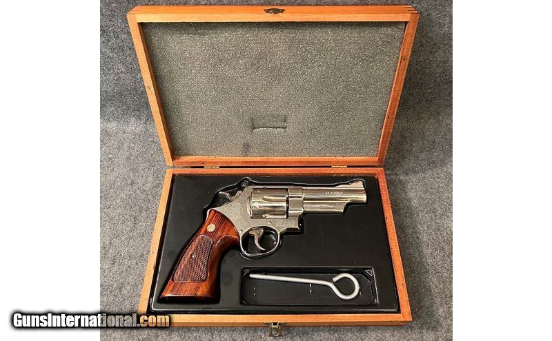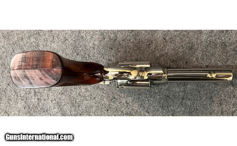 Description: This six-shot double action revolver is a Smith & Wesson Model 29-2 chambered in .44 Magnum. The Model 29-2 is a "pinned and recessed" revolver. "Pinned" means that the barrel is screwed in, and secured by a pin driven through the frame and a notch in the barrel. "Recessed" denotes the rear of the bored cylinder holes being countersunk, so that, when loaded, the cartridge rims are fully enclosed by the cylinder. This is an N-prefix model. This revolver is in very good condition overall, furniture and metal. It comes with the original wood display case. .44 Magnum SOLD Chambers: 6 Round cylinder Metal Condition: Light observable handling wear to the metal Wood Condition: Checkered wood grips are in very good condition Bore Condition: "Bright and shiny, crisp rifling Barrels: 4 inch barrel Triggers: Wide Target Trigger with Wide Target Hammer Stock Dimensions: 9¾ inch overall length Weight: 2 lb 12 oz Sights: Ramp Front Sight with Orange Insert - White Outline Square Notch Adjustable Rear Sight Item Location: Wichita, KS |