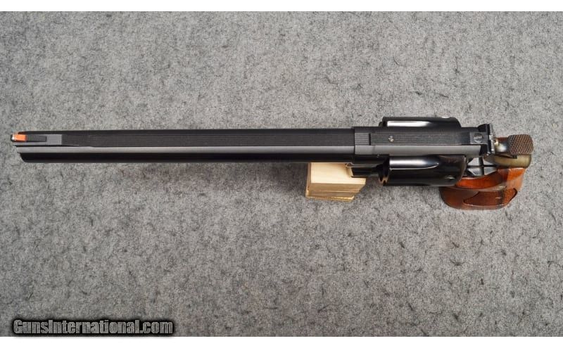 Description: This double action revolver is a Smith & Wesson 29-2 chambered in .44 Magnum. It has a 1.74" fluted, counterbored cylinder, special oversize target type stocks of checked Goncalo Alves wood with S&W monograms, S&W Bright Blue with sandblasting and serrations on top of sighting area to break up light reflection, ½" wide target type trigger with S&W grooving and with internal trigger stop, a pinned and ribbed barrel, and a square butt with 10 groove tangs. This revolver has an "N" prefix serial number which makes it a post-1969 model. The bluing on this specimen is immaculate showing no discernable wear or loss. The wood stocks are in pristine condition with no discernable wear or marks. The bore is mirror shiny clean with factory condition rifling. This revolver comes with velvet lined wood presentation case, all tools, owner's instructions for use paperwork, wax paper, and additional paperwork as pictured. .44 Magnum SOLD Chambers: Six round fluted cylinder Metal Condition: S&W Bright Blue is in immaculate condition Wood Condition: Wood stocks are in pristine condition with no discernable wear or marks Bore Condition: Bore is mirror bright and shiny with excellent rifling Barrels: 8⅜" barrel Triggers: ½" wide target type trigger with S&W grooving and with internal trigger stop Stock Dimensions: Overall length 14 inches Fore End: Shrouded ejector rod Butt Pad: Special oversize target type of checked Goncalo Alves stocks with S&W monograms Weight: 3 lb 4 oz Sights: "⅛"" wide S&W Red serrated ramp front sight, S&W Micrometer Click rear sight, adjustable for windage and elevation. White outline sight slide notch. Item Location: Wichita, KS |