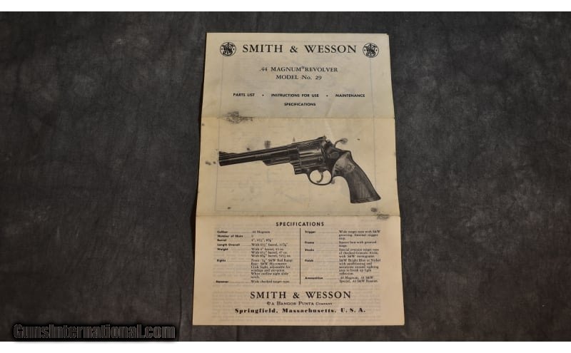 Description: Smith & Wesson 29-2 revolver chambered in .44 magnum. Includes the box, manual, and original cleaning tools. This firearm is in great shape. Three screw varient. SN: N472953 .44 Magnum SOLD Chambers: .44 Magnum Metal Condition: Great Wood Condition: Great Bore Condition: Excellent Barrels: "6"", Good Bluing Triggers: Approximatly 2lbs trigger pull Stock Dimensions: N/A Fore End: N/A Butt Pad: N/A Weight: 4lbs Sights: Sights are aligned and in great shape. Chokes: N/A Item Location: Colorado Springs, CO |