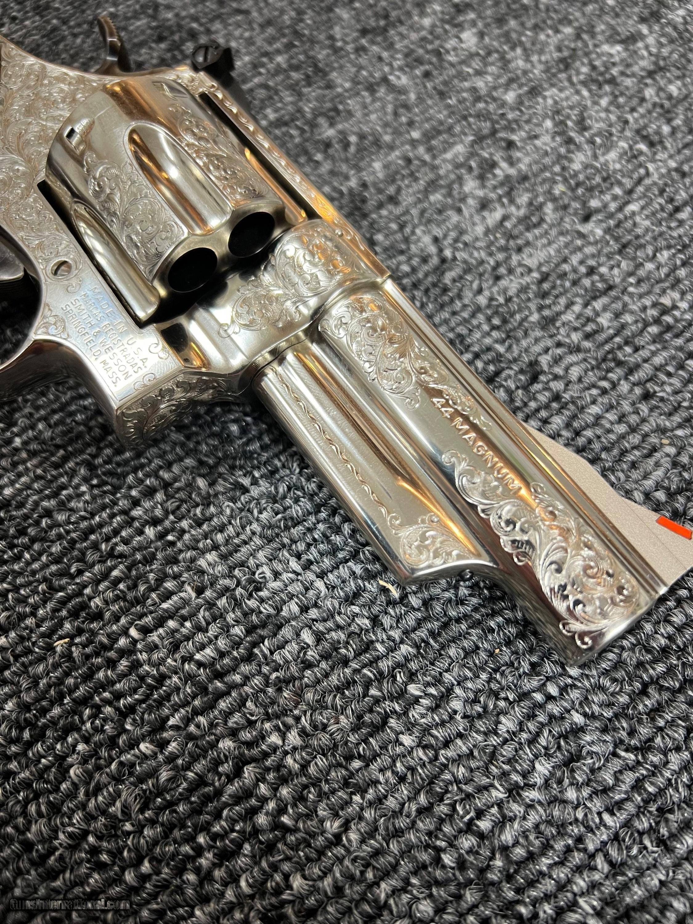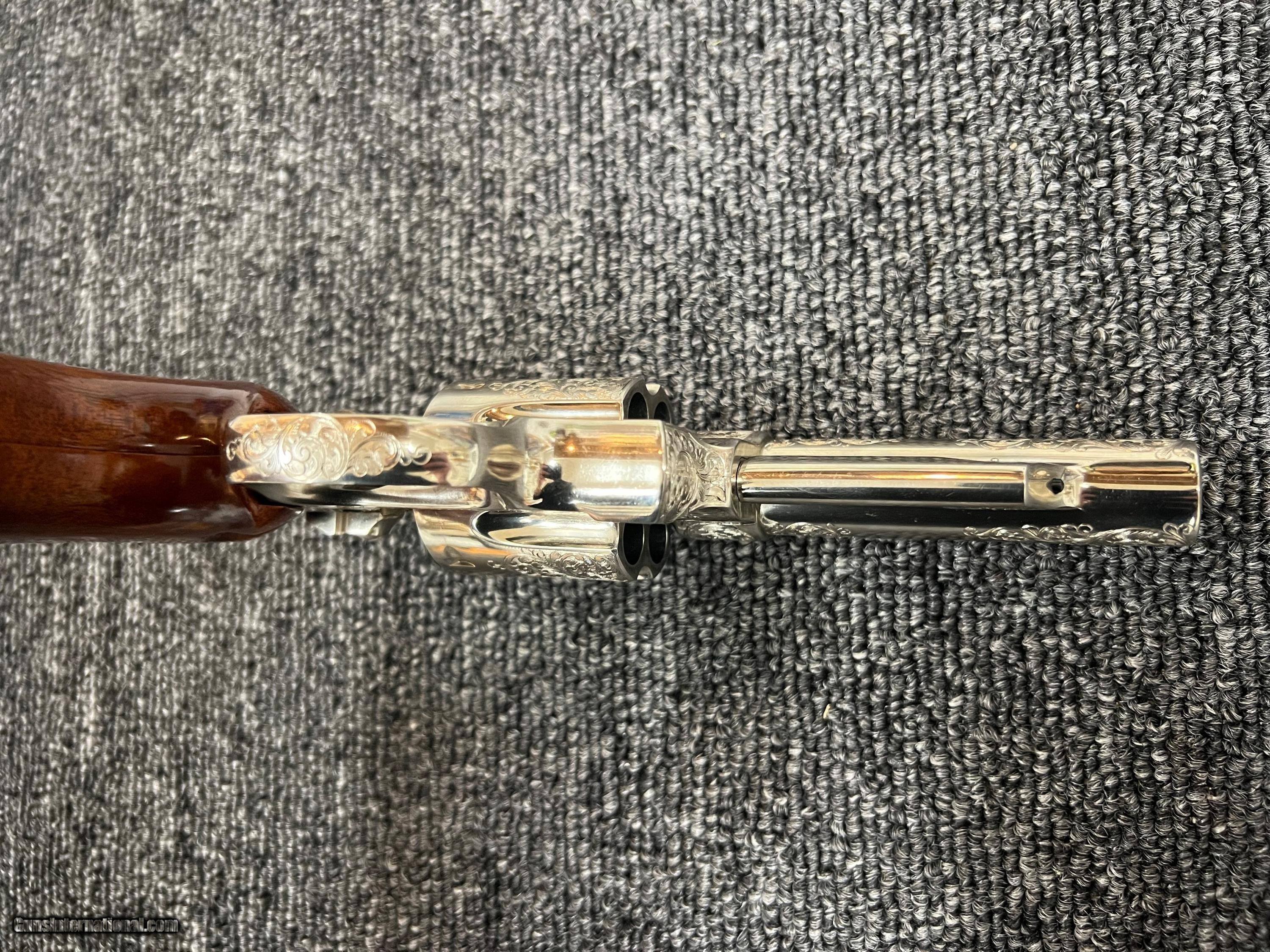 Description: Smith & Wesson 29-2 6-shot 44 magnum revolver. Nickle finish 4" barrel. N serial number. Owner believes this is factory "A" grade engraved with almost complete coverage of beautiful engraving. Does not have the factory carboard box or factory paperwork but does have the factory wood presentation box with blue felt. this is a consignment firearm sale from a estate collection of several higher end factory, engraved, revolvers, and fine high-grade browning, Perdey, lc smith shotguns. Please follow our postings over the next few weeks and months for similar firearms. SOLD Handgun Caliber: .44 Remington Magnum Manufacturer: Smith & Wesson Model: 29-2 Serial Number: N315429 Barrel Length: 4” Condition: Like new |