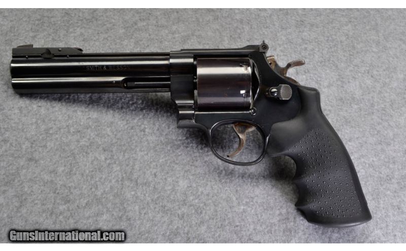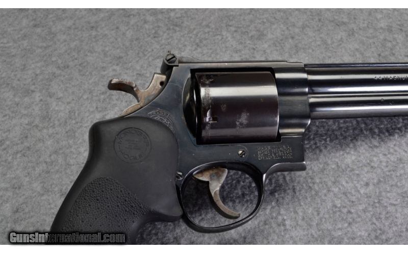 Description: SOLD Caliber Info: .44 Magnum Metal Condition: Frame and barrel - Good some rough spots behind cylinder and front of trigger guard left side; Cylinder has rough spots and usage wear Bore Condition: Very Good, bright Barrels: 6 Inch Stock: Hogue Monogrip grips Sights: Target Sights Item Location: Springfield, OR |