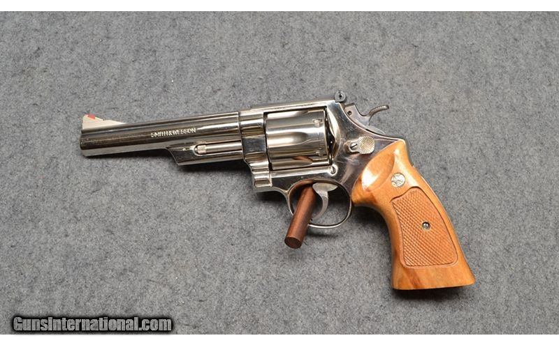 Description: This revolver is a Smith & Wesson 29-3 chambered in .44 Magnum. It has a bright nickel finish, checkered wooden grips, and a red ramp front sight. This firearm is in good condition overall, with light wear from handling and light use. Comes with an extra set of black Pachmayr grips. .44 Magnum SOLD Metal Condition: "Good, light scratches throughout from handling, light finish wear near muzzle Wood Condition: "Excellent, only very light handling marks Bore Condition: Bright and shiny with crisp rifling Barrels: 6" Nickel Finish Fore End: Checkered wooden grips Weight: 3lbs Sights: "Red ramp front sight, notched rear sight Item Location: Wichita, KS |