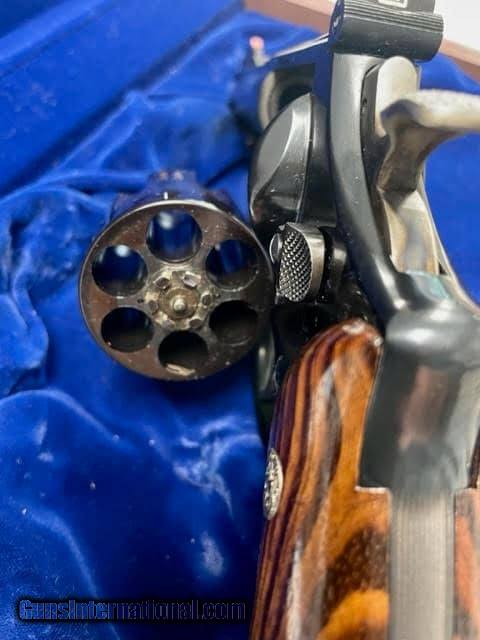 Description: Guns Listing ID: 818078 This revover is in excellent unfired condition! Make: Smith & Wesson Model: 29-3 Elmer Keith Commemorative Year of Manufacture: 1985 Caliber: .44 Magnum Action Type: 6-Shot, Double Action / Single Action, Swing-Out Fluted Cylinder Revolver Markings: The left side of the barrel is marked “SMITH & WESSON / 44 Magnum” in gold, the right is marked “ELMER KEITH COMMEMORATIVE”, “44 MAGNUM”, and “1899-1984” in gold on a banner. The left side of the frame is marked with S&W’s monogram logo. “1 OF 2,500” is marked in gold under the cylinder on the left. The right is marked with the four line Marcas Registradas. The right side plate is marked with a portrait of Elmer Keith and his signature in gold. The cylinder is marked “1ST” “OUTSTANDING / HANDGUNNER” and “SALMON / IDAHO” in gold, meant to be displayed on the right and “”HELL I WAS / THERE”” and “”SIXGUNS”” in gold, meant to be displayed on the left. The yoke cut is marked with the model number, the yoke is marked “E3 / 77691?. The butt is marked with the serial number. Barrel Length: 4”, With 3/4 Lug & Shrouded Ejector Rod Sights / Optics: The front sight is a serrated ramp blade with a red insert, fixed to a rise in the barrel’s solid rib; the top of the barrel is serrated and matte finished for glare reduction. The rear sight is a flat top, square notched and white outlined leaf in a base that is micrometer-click adjustable for windage and elevation. The original box has some scratches on the wood, the brass plaque still has the protective film on it. SOLD Manufacturer: SMITH & WESSON Model: 29-3 COMMEMORATIVE Caliber Info: 44 MAG Condition: Used - Non-Certified Barrels: 6 BARREL Finish: BLACK |