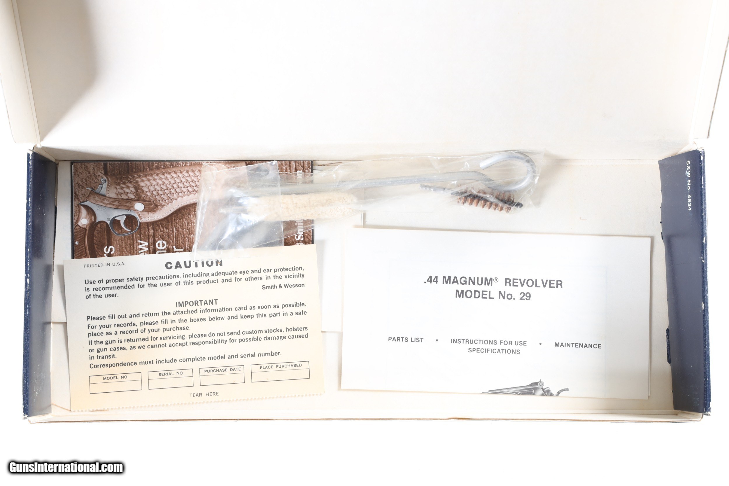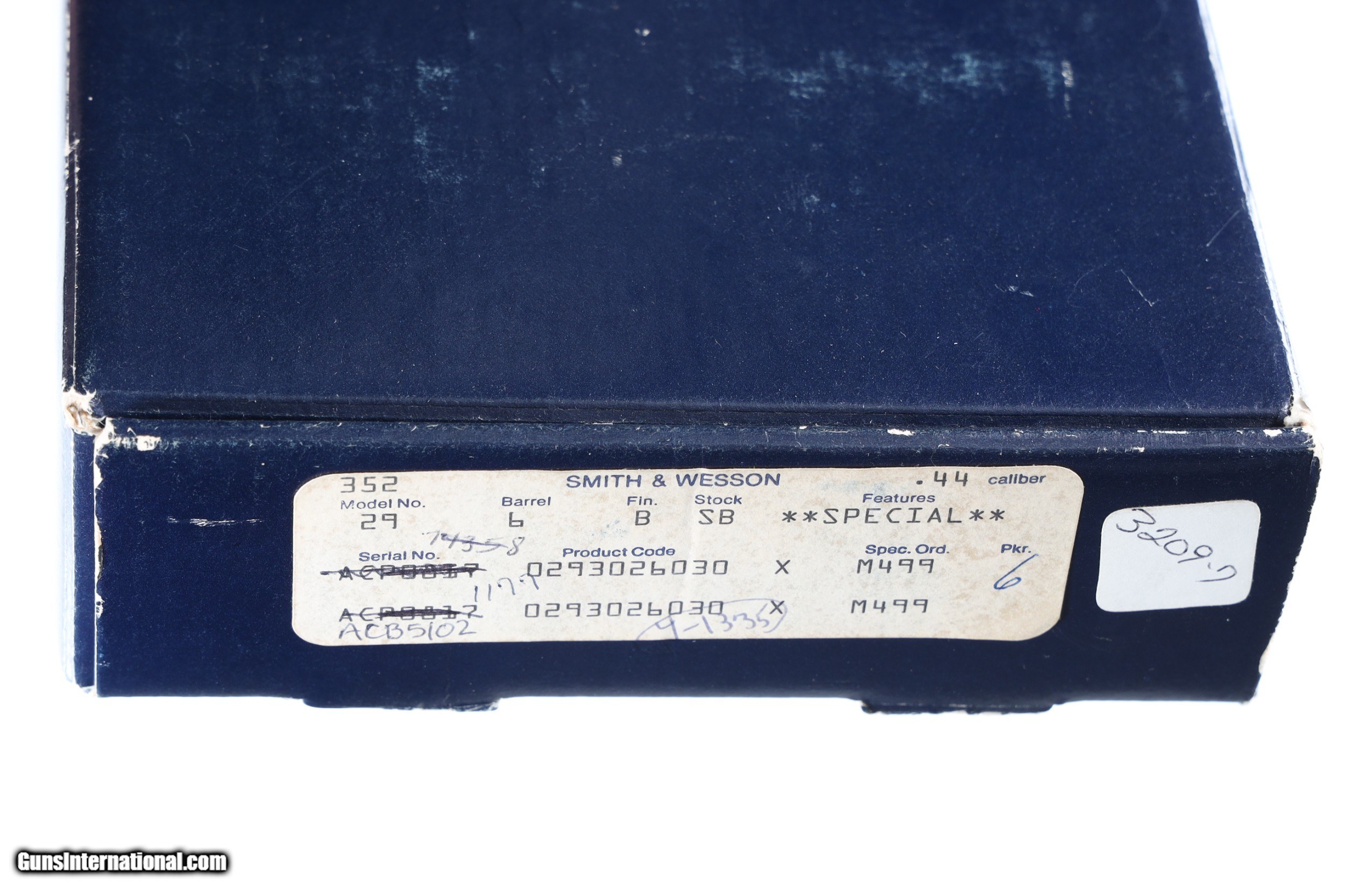 Description: Excellent plus overall condition with hand-numbered factory box, papers, and cleaning tools. • Free Shipping, No Credit Card Fees. • Lay-a-way available for this firearm. • 1/3 Down, a 1/3 in 30 Days 1/3 in 60 Days. SOLD Manufacturer: Smith & Wesson Model: 29-3 Serial Number: ACB5102 Barrel Length: 6 |