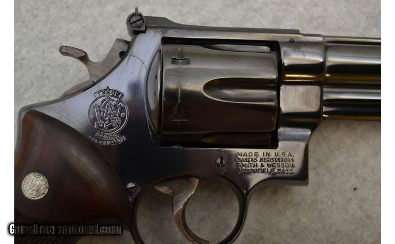 Description: This revolver would rate much higher if the bluing was original. There is good evidence it has been reblued in the form of shallow, rounded markings; the way the S&W crest sort of "fades" into the metal for example. Light handling marks here and there especially near the muzzle (see pictures). Grips are in pretty good shape with minor evidence of handling around the edges. .44 Magnum SOLD Chambers: 6-Shot revolving cylinder. Metal Condition: Good. Wood Condition: Grips are in good condition. Bore Condition: Excellent; bright shine and strong rifling. Barrels: 8-3/8" Gloss blued. Triggers: Wide case-hardened metal with grooved surface. Stock Dimensions: N/A Fore End: N/A Butt Pad: Diamond pattern checkered walnut grips with Smith & Wesson medallions. Weight: 3lbs 8oz Sights: Ramped front blade with orange insert and adjustable rear notch. Chokes: N/A Item Location: Green Bay |
