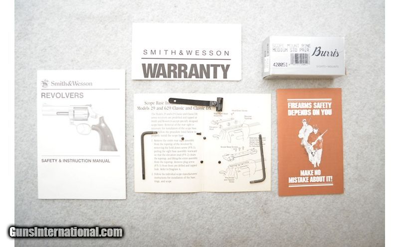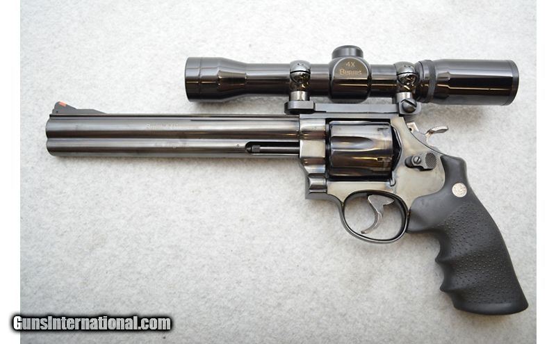 Description: Very good condition overall. The barrel has a few minor marks and a spot or two of tarnish. The cylinder has the drag line typical of used revolvers. Grips have the very beginnings of wear but are in great shape. Comes with the factory box, a soft case, factory papers (even the waxy shipping paper), and the original rear sight. .44 Magnum SOLD Chambers: 6-Shot revolving cylinder. Metal Condition: Good. Wood Condition: Grips are in good condition. Bore Condition: Excellent. Barrels: 8¼" Gloss blued. Triggers: Flash chromed with grooved face. Stock Dimensions: N/A Fore End: N/A Butt Pad: Black rubber Hogue Monogrips with Smith & Wesson medallions. Weight: 4lbs 8oz Sights: Comes with a Burris 4x scope installed. Original adjustable rear notch is included. Chokes: N/A Item Location: Green Bay |