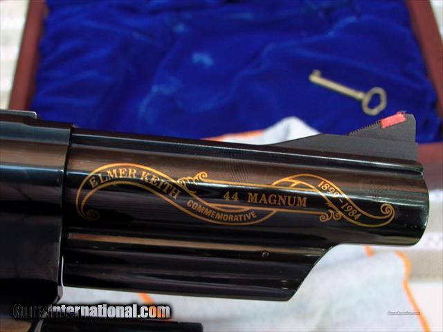 FOR SALE- SMITH WESSON MODEL 29-3 44 MAGNUM 4INCH ELMER KEITH COMMEMRATIVE, 1 OF 2500, AS NEW IN PRESENTATION BOX. GUN FEATURES GOLD INLAYS, LETTERING, SQUARE BUTT N FRAME REVOLVER. THIS ELMER HAS BEEN ONCE FIRED ONLY. GUN SHOWS MINISCULE FINISH WEAR ON RT SIDE OF BARREL, IT IS ALMOST UNDETECTABLE. A WALNUT PRESENTATION CASE COMES WITH THE GUN. GUN HAS BEEN ONCE FIRED, 6 ROUNDS AND NO MORE..FEATURES TARGET TRIGGER, TARGET HAMMER, RED RAMP FR SIGHT, WHITE OUTLINE REAR SIGHT. THE ACTION ON THIS REVOLVER IS OUTSTANDING, BOTH SINGLE& DOUBLE. SMITH REALLY DID A GREAT JOB ON THIS GUN.THE ACTION IS VERY SMILIAR TO A COLT PYTHON, THIS WAS HAND HONED. THE BLUEING IS A DEEP ROYAL BLUE GLOSS FINISH AND THE GOLD INLAY IS SUPERB.