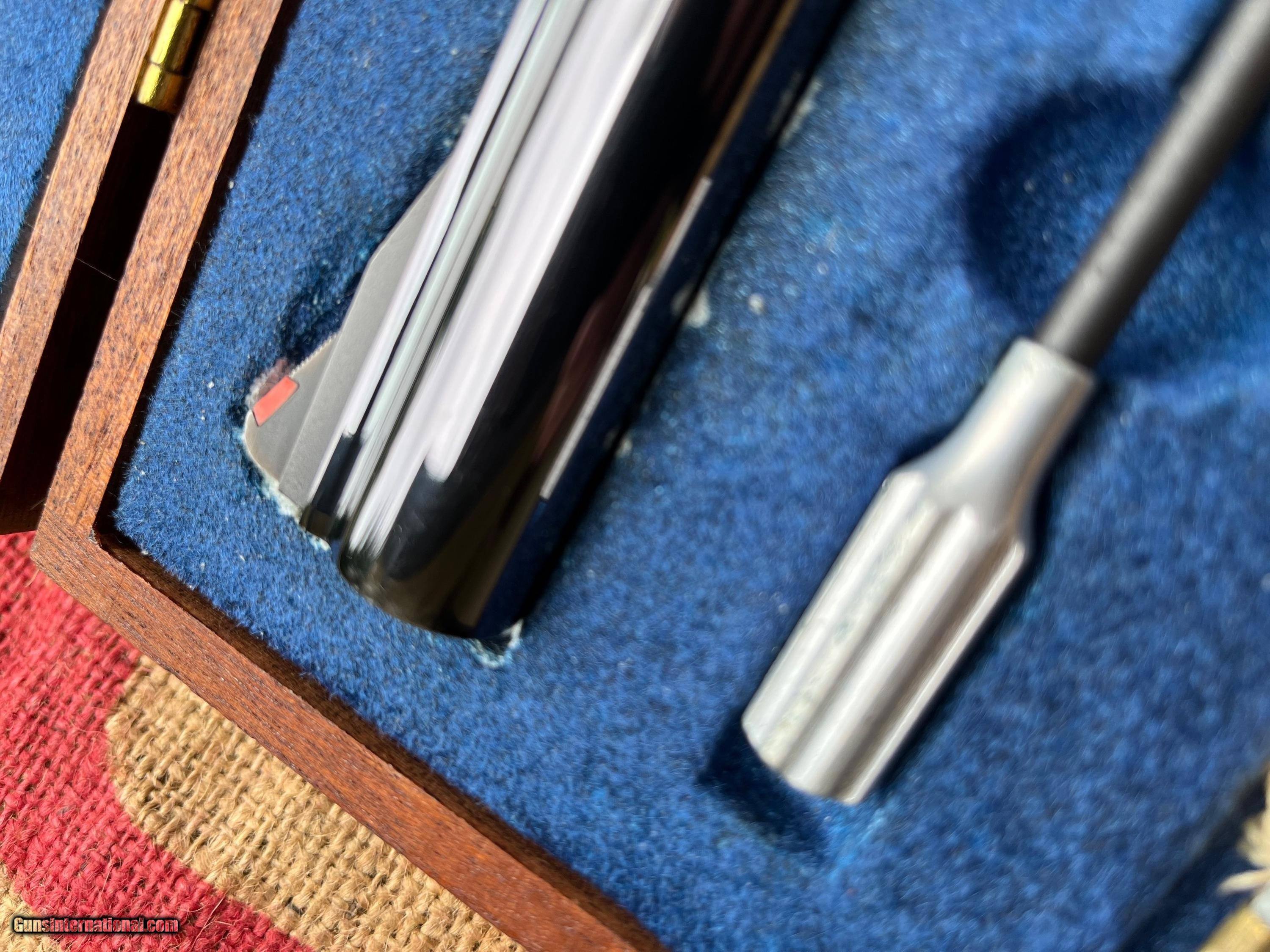 Description: Rare S&W 29-1/.44 Mag with Jinks letter.In 1960 the extractor rod thread changed to left hand to prevent unscrewing under recoil at approx.S220000.Smith & Wessons beautiful high luster blueing adorns this rare revolver from yesteryear.Beautifully figured aka Coke grips.Blueing rates at 97+%.No muzzle ware except on right side of 6.5" barrel where it was sitting in box.All correct box & tools in clamshell presentation box.A time capsule.Rare & sought after for the Smith collector.Thanks for looking SOLD Curio/Relic: Yes Handgun Caliber: .44 Remington Magnum Manufacturer: Smith&Wesson Model: 29-1 Serial Number: S229790 Barrel Length: 6.5 Bore: Excellent Chambers: Excellent Ejectors: Excellent Condition: Excellent 97+% Metal Condition: Excellent Wood Condition: Excellent Bore Condition: Excellent Barrels: Excellent Barrel Type: 6.5” Action: Double Action Triggers: Single Stock: Wood Finish: Blue |