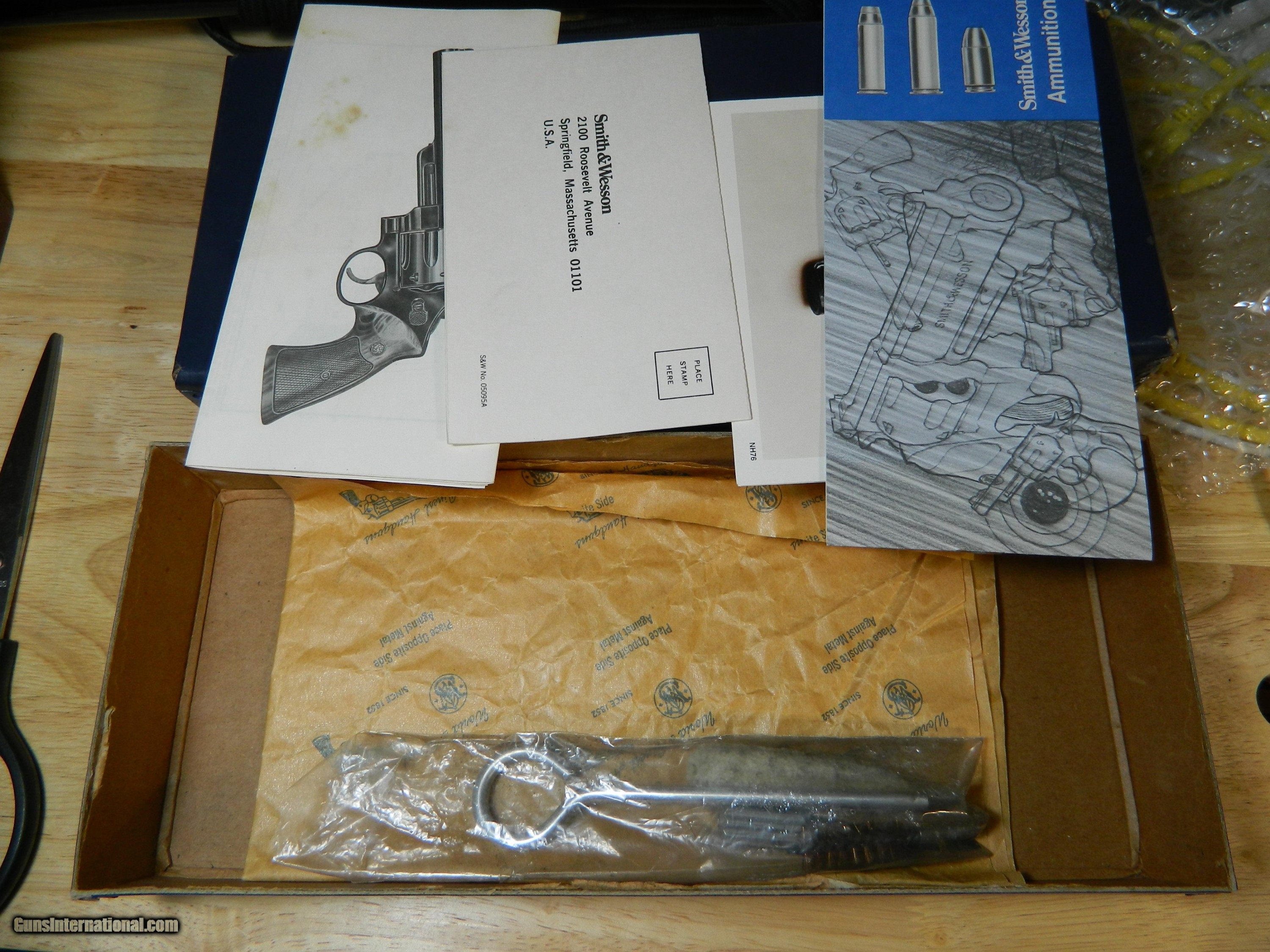 Description: We have received on consignment a very high condition Smith model 29-2 [Pinned and Recessed] in the wood presentation case along with the unmarked plain blue shipping box, with the rust paper, all the brochures, and the blank warranty card. this is truly a fantastic find. gun rates 99+ and appears to be unfired except from factory. NO IDIOT screw rings from wrong screw driver, nor a curled top of sideplate from being Pried off... 99% sure side plate has never been off of gun. this was made in 1980 and the LAST of the good guns from smith. Please see all pictures for condition. more pics of a certain area to serious inquiries. this is a super nice 43 year old gun. the interior of the case has been redone as the cheap flock was no longer.... now with 100 % cotton flannel to protect gun. any blems in the pictures are of grease on the gun for storage. thanx and have a nice day.. SOLD |