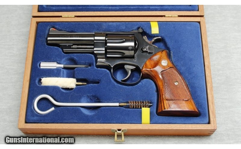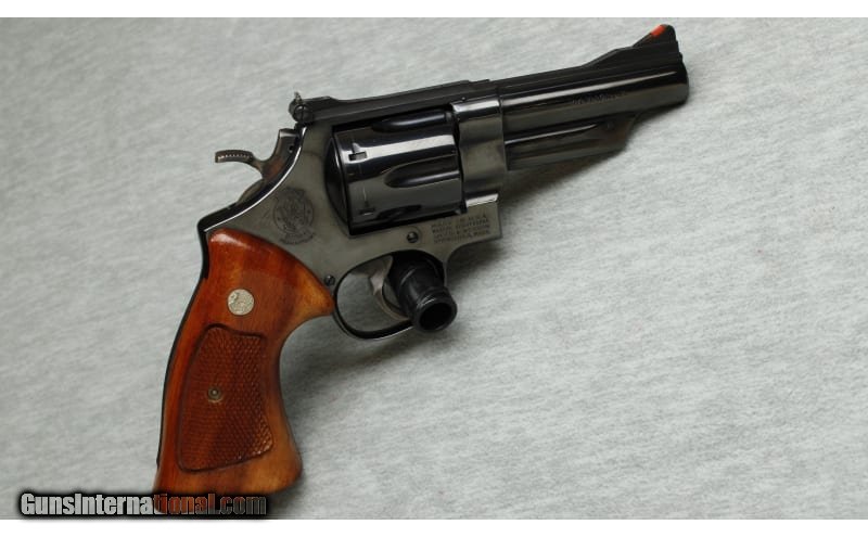 Description: Excellent condition, light wear and handling marks, comes with display box. Large frame magnum revolver, 4" pinned barrel with shrouded ejector, polished blue finish, 6 shot fluted cylinder, wide target trigger & hammer, adjustable sights, checkered hammer & cylinder latch and S&W checkered wood target grips. .44 Magnum SOLD Chambers: Revolver Metal Condition: Excellent Bore Condition: Bright Barrels: 4 Triggers: Double and single action Butt Pad: Wood grips Sights: "Adjustable rear, ramp front sights Item Location: La Vista, NE |