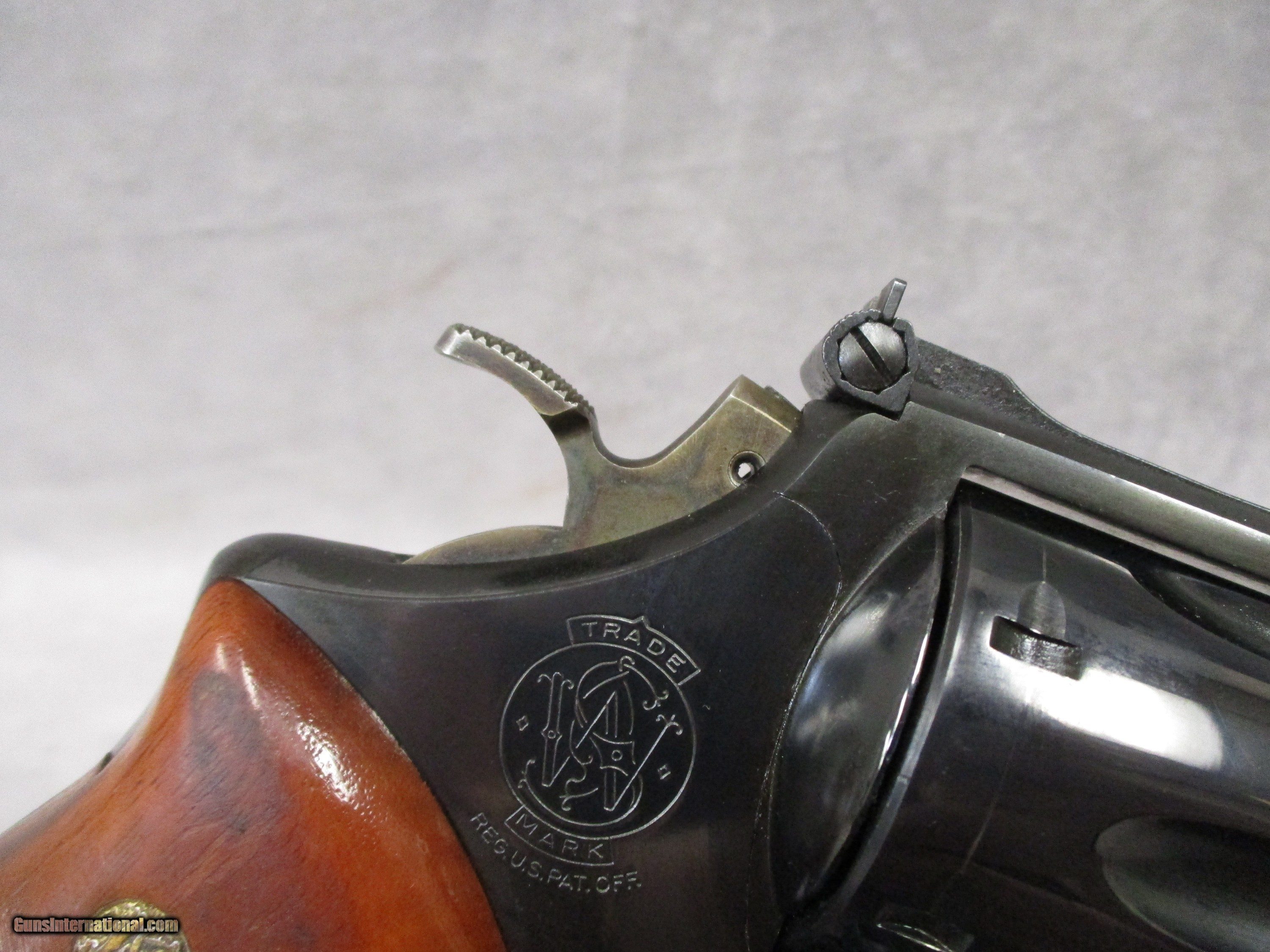 Description: This is perhaps one of Smith & Wesson’s most famous models. The 29 was intended to allow the shooter to have a revolver possessing better knockdown power than any 357 Magnum chambered revolver. This is a “Dash-2” variation. This was the last variation of the 29 to have the traditional S&W pinned barrel. Other features included are a long 8.375-inch partial-lug barrel, square butt frame, .500-inch grooved target trigger, .500-inch target hammer, ramp front sight with red insert, and white outline on the rear sight blade. The serrated backstrap has 10 grooves. The grips are traditional Goncalo Alves checkered target grips. Smith & Wesson refers to these as “target stocks.” The serial number, according to the Standard Catalog of Smith & Wesson, 4th Edition, indicates this gun was manufactured in 1973. The 29’s popularity increased drastically in 1971 with the release of the film Dirty Harry, starring Clint Eastwood. Although the 29 he normally carried had the 6.5-inch barrel, some scenes as well as posters depicted him with the 8.375-inch barrel. Indeed, of the two 29 revolvers used in the film, one was a 6.5-inch and the other an 8.375-inch. For the actual shooting sequences however, a Model 25 in 45 Colt was used as the 5-in-1 blanks were plentiful while 44 Mag blanks were yet not available. In the real world, the Model 29 has been used for everything from hunting to target shooting. It has also been used by law enforcement, although never on an “as issue” basis. This example is in excellent condition with some light wear. There are light scratches on the barrel just above the “ON” in “SMITH & WESSON” on the left side of the barrel and one nick in the metal just ahead and below of the “44 MAGNUM” on the right side. The right grip has a dark surface on the finish at both the lower and upper edges. The hammer and trigger have the slightest loss of the case hardening on the left and right side (respectively) due to operation of the 29. A small group of pitting spots appears over one chamber of the cylinder. There is a small spot of holster wear at the edges of the muzzle on the left and right sides. On the positive side, powder burns at the front of the cylinder are nearly nonexistent. The bore is in mint condition and appears as though it left the factory yesterday. One very nice feature of the 29 is that like any 44 Magnum revolver, it will also safely fire the .44 S&W Special and .44 S&W Russian cartridges in addition to the .44 Magnum. This allows the owner to practice with the gun frequently and not have to worry about hurting their wrist. With this long barreled 29-2, the .44 S&W Russian would likely produce little if any felt recoil given the light powder loads it uses, especially if Cowboy Action loads are used. Another, appreciable aspect of this beautiful firearm is that, unlike later S&W models, this one has no trigger lock. This is a desirable feature of the older S&W revolvers, and the expression “pre-lock” is a common denotation of this feature. This revolver is in excellent condition and would be an excellent addition to any S&W owner’s collection. It comes with a Bianchi X-15 XL shoulder holster which is in great condition. SOLD Handgun Caliber: .44 Special, .44 S&W Russian, .44 Remington Magnum Manufacturer: Smith & Wesson Model: 29-2 Serial Number: N129764 Bore: Rifled, 5 grooves, 1:18.75 inches (1 in 476.25 mm) RH twist Chambers: 6 Ejectors: Manual, simultaneous 6-round ejection Condition: Used - Good to Excellent Barrels: Carbon steel Barrel Type: Heavy barrel with shroud for ejector rod Action: DA/SA Triggers: .500 inches (12.7 mm) serrated target trigger Stock: Goncalo Alves checkered target stocks with extractor relief cut Finish: Blued Weight: 3 lbs. 3.5 oz. Sights: Micrometer-click rear sight, ramp front sight; Sight Radius 9.8125 inches (249.2375 mm) Manufacture Date: 1973 Extras: Bianchi X-15 XL shoulder holster |