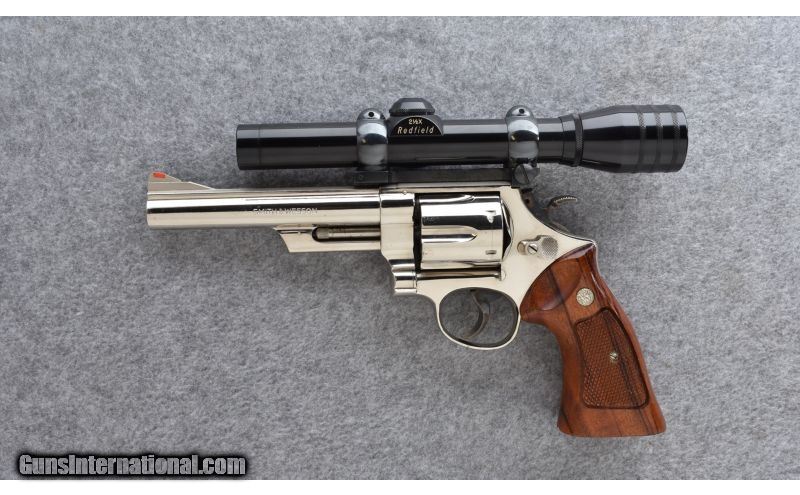 Description: This factory nickeled Model 29-2 remains in good overall condition. Cylinder timing is excellent. Pinned and recessed. SOLD Caliber Info: .44 Rem. Mag. Metal Condition: Factory nickel finish shows light swirls, streaks, and a little freckling. All six chambers remain properly timed. Top strap has been drilled and tapped to accomodate the scope base. Wood Condition: Shows very good factory finish with sharp checkering. Bore Condition: Clean with sharp lands. Barrels: 6 Weight: 60 oz. scoped Sights: Redfield fixed 2 1/2 power handgun scope. Item Location: Post Falls, ID |