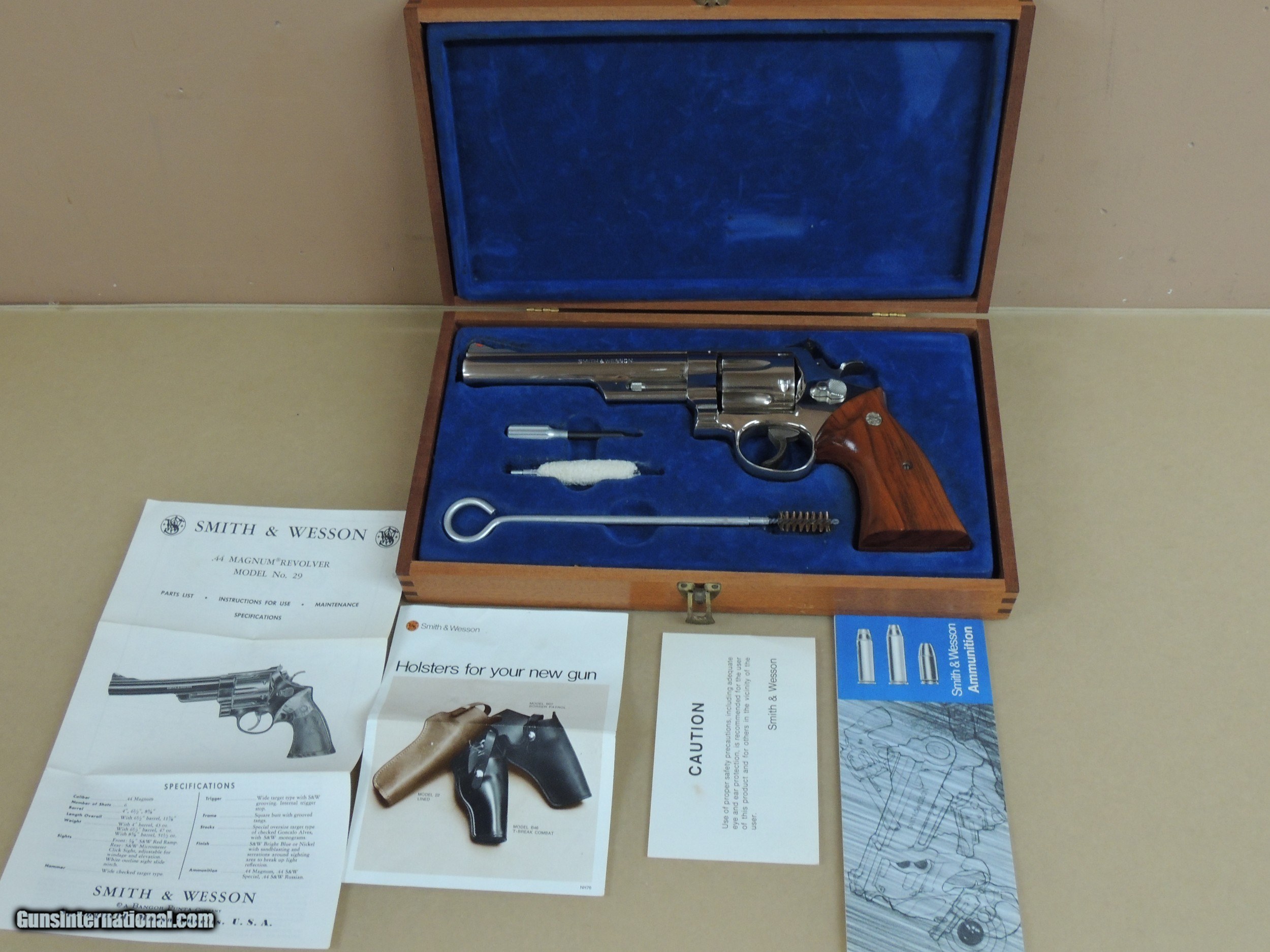 Description: Smith & Wesson Nickel Model 29-2 .44 Magnum Revolver in Case, 6 1/2" Barrel with mint bore, Timing and Lock Up correct, 98% , Target Hammer, Target Trigger and Smooth Target Grips Case and Extras as Pictured Circa 1976' Production $1650 ******* (PLEASE REFERENCE OUR INVENTORY NUMBER) (PAYMENT OPTIONS) (Postal Money Order) (Cashiers Checks) (Personal Checks (Item held until Check Cleared) ***(Layaway 120 days-(No Interest)-(Pay any way, any time you like over the term) -(Deposit required)*** (Credit Cards Visa or Master Card 3% fee added to total sale) (GA residents 7% sales Tax Applies) (BEST PHONE/TEXT 229-424-8450) (SHIPPING $35.00) SOLD |