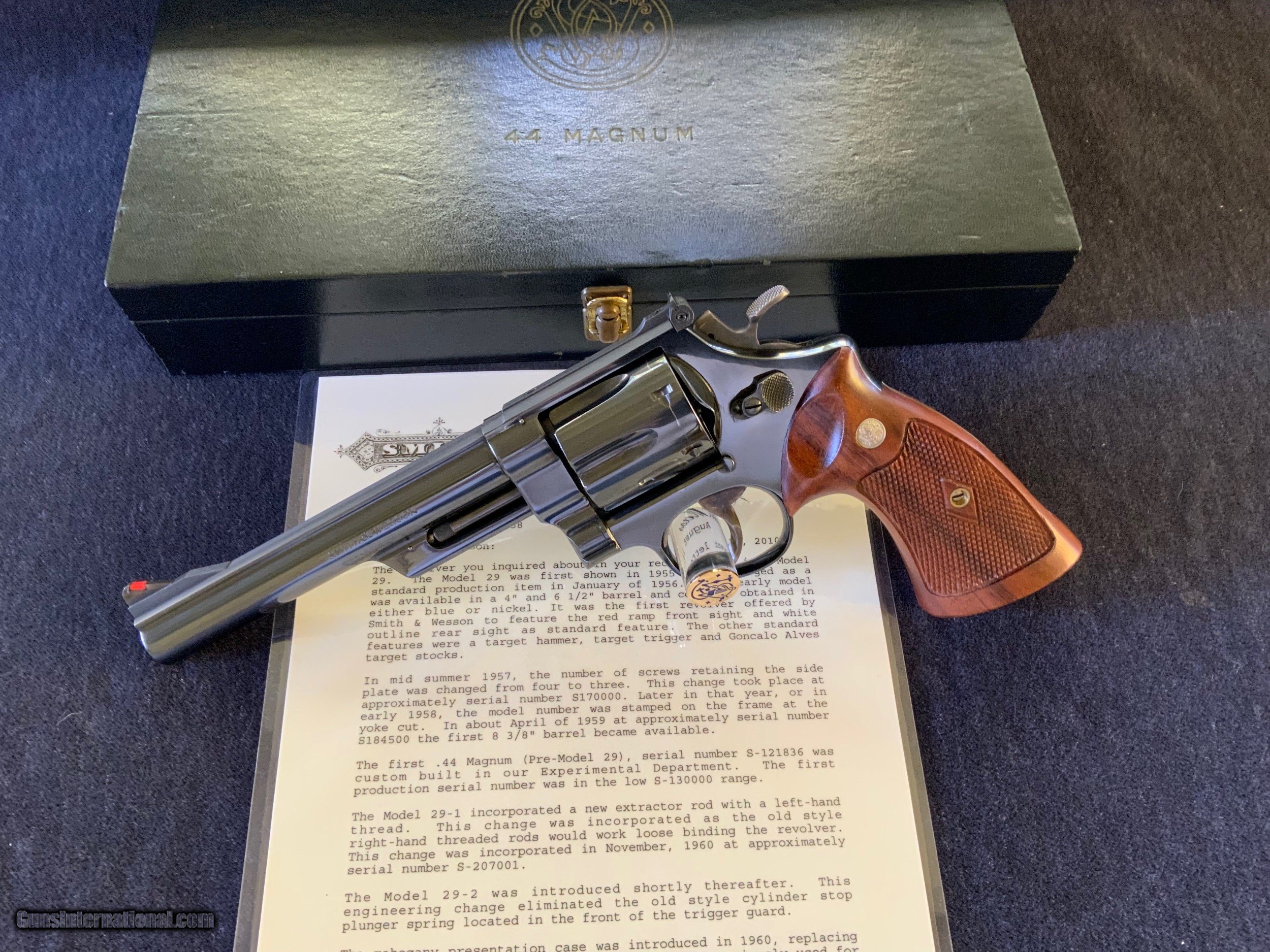 Description: A beautiful and uncommon Pre - 29, 5 Screw was shipped from the Factory on May 24, 1957 with Serial number S173763 as is shown in the Historical Letter on the bottom of Page 2. Shown on the Front Page of the Letter is the following: " In mid summer 1957, the number of screws retaining the side plate was changed from 4 to 3. This change took place at approximately serial number S170000." it is known that some 5 Screw guns were produced in the range of S170000 - S176000, but they are uncommon and their exact number is unknown. Included In this sale are the gun with it's Original Presentation case including tools and the Historical Letter. The overall condition is shown in the accompanying pictures and additional pictures are available on request. Detractions to this Pre-Model 29 are a turn line on the cylinder, some very slight handling marks and some haziness in the blue finish on the side plate and on either side of the cylinder release button. I have attempted to show this condition in the last two pictures. This remains an outstanding example of a Pre - 29, 5 Screw variant. SOLD Handgun Caliber: .44 Remington Magnum |