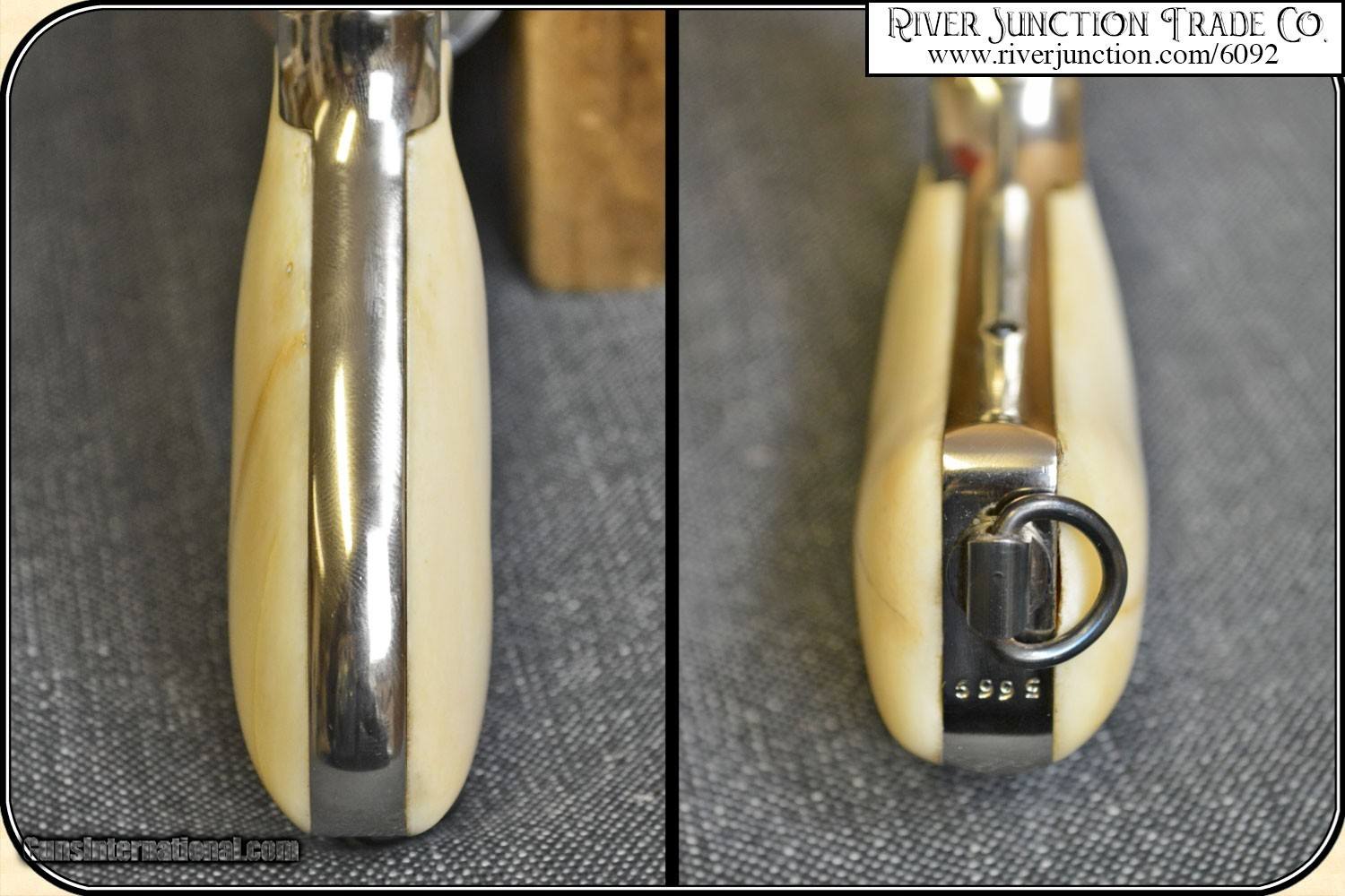 Description: Smith & Wesson Model 3 Russian Single Action Revolver By Navy Arms Manufactured by Uberti Chambered in .44 Russian caliber with the barrel professionally cut and crowned to four inches and highly polished and nickel plated with custom hand made bone grips and topped off with beautiful fire blued screws. This most colorful pistola will be a stand out in any collection or on your hip, in any situations. There is no indication of wear and is ready to dazzle all who cast their eye on its beauty. This is considered a modern firearm and must be shipped to a Federal Firearms License (FFL) Dealer. A copy of that license must be provided before shipment can be made. We always answer questions and entertain offers. Payment: Item, can be ordered with a credit card or paypal on our sight . Just Google (riverjunction) and type in the River Junction Trade Co. item number (6092) in the search box. Before you checkout you will see shipping cost and total. OR If you prefer: Pay by cash, postal money order, cashiers check, personal & business checks. We wait for checks to clear. Have questions? Call me 563-880-4588. Jim SOLD |