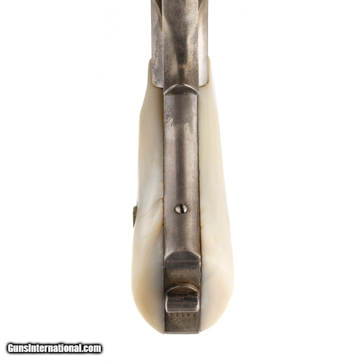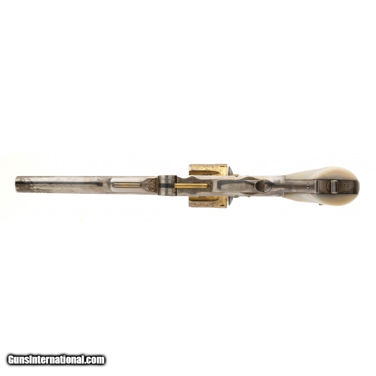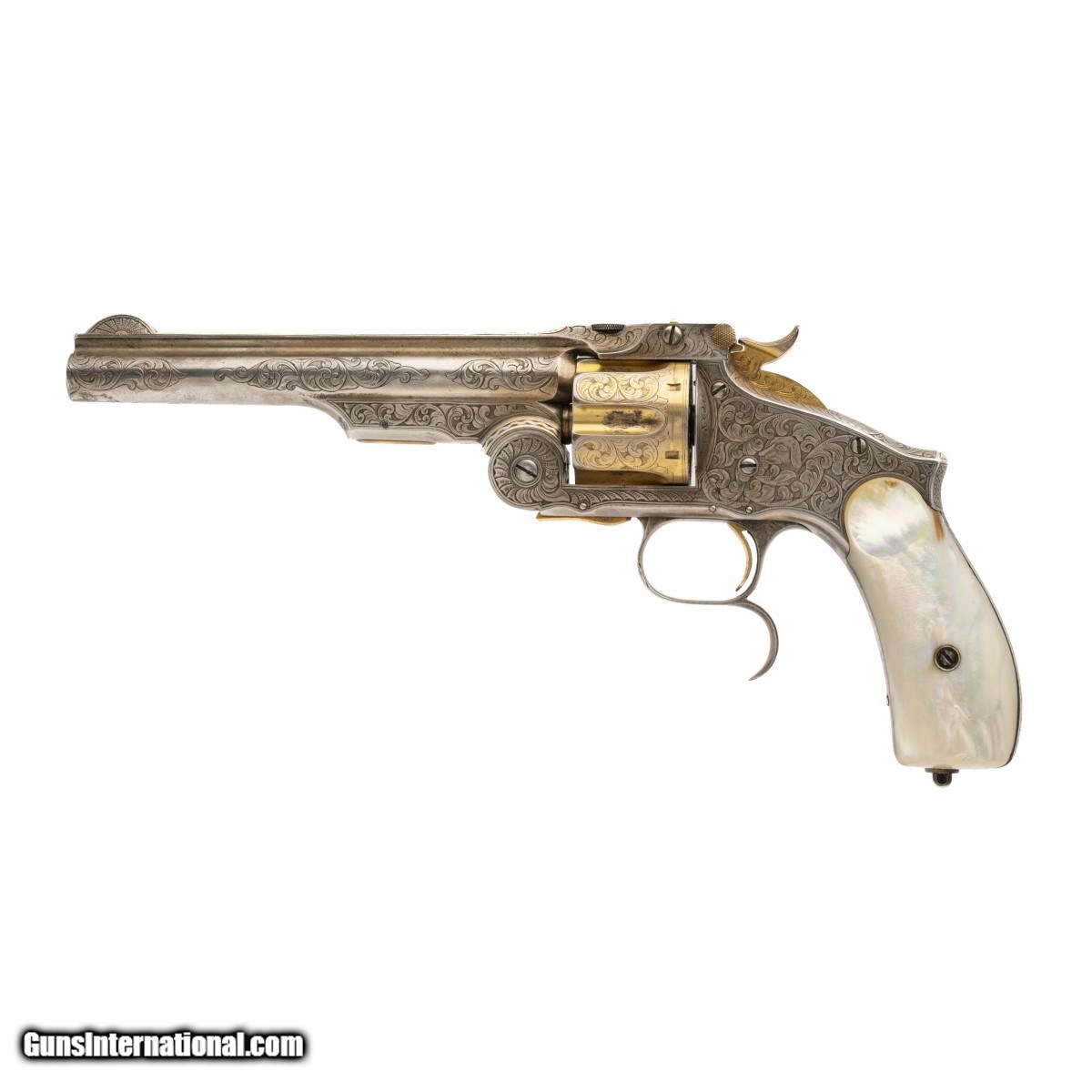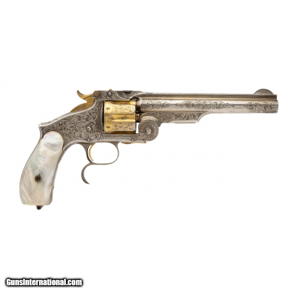 Description: "Serial number 44112. Made circa 1870s- 1880s. 44 Russian caliber with a 6 ½" barrel. This gun is beautifully engraved. The engraving is nice and sharp with mostly scroll work. The left hand side of the frame features a dog’s head while the right hand side has an eagle’s head. This gun is silver plated with a gold plated cylinder and small parts. The grips are beautiful pearls. Very fine Smith and Wesson 3rd Model Russian! SOLD Antique: Yes |