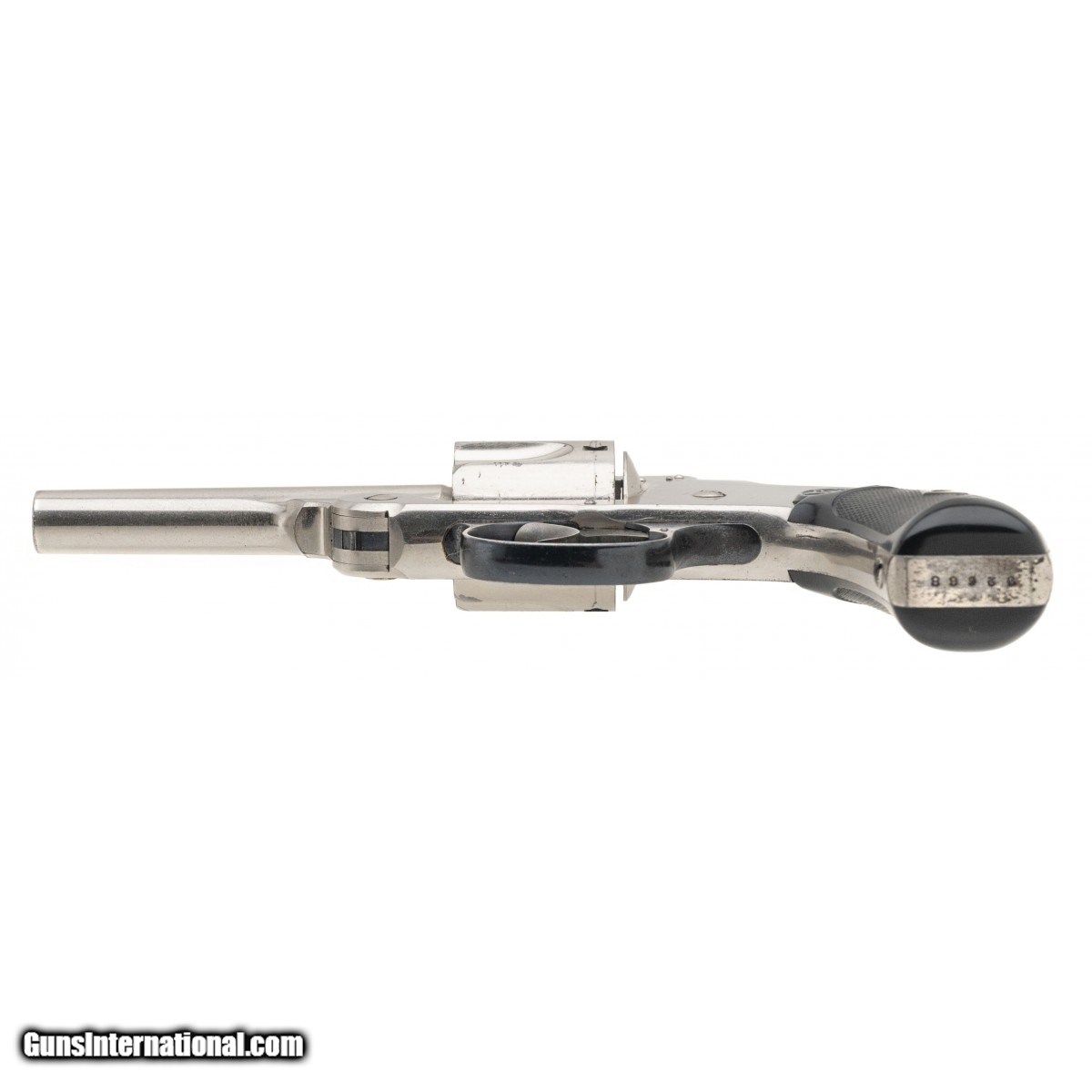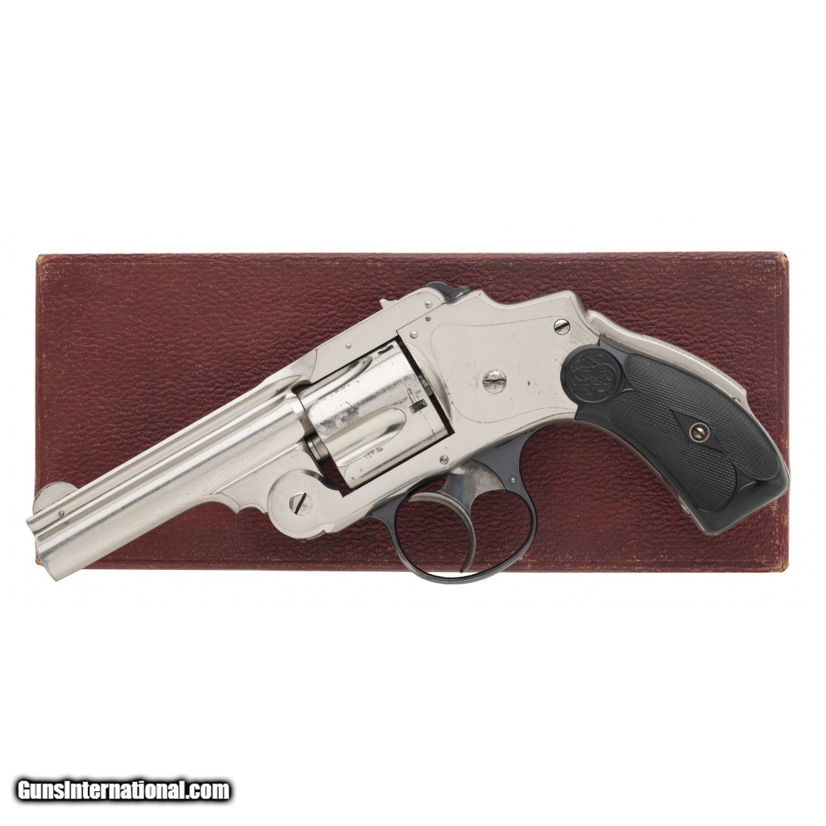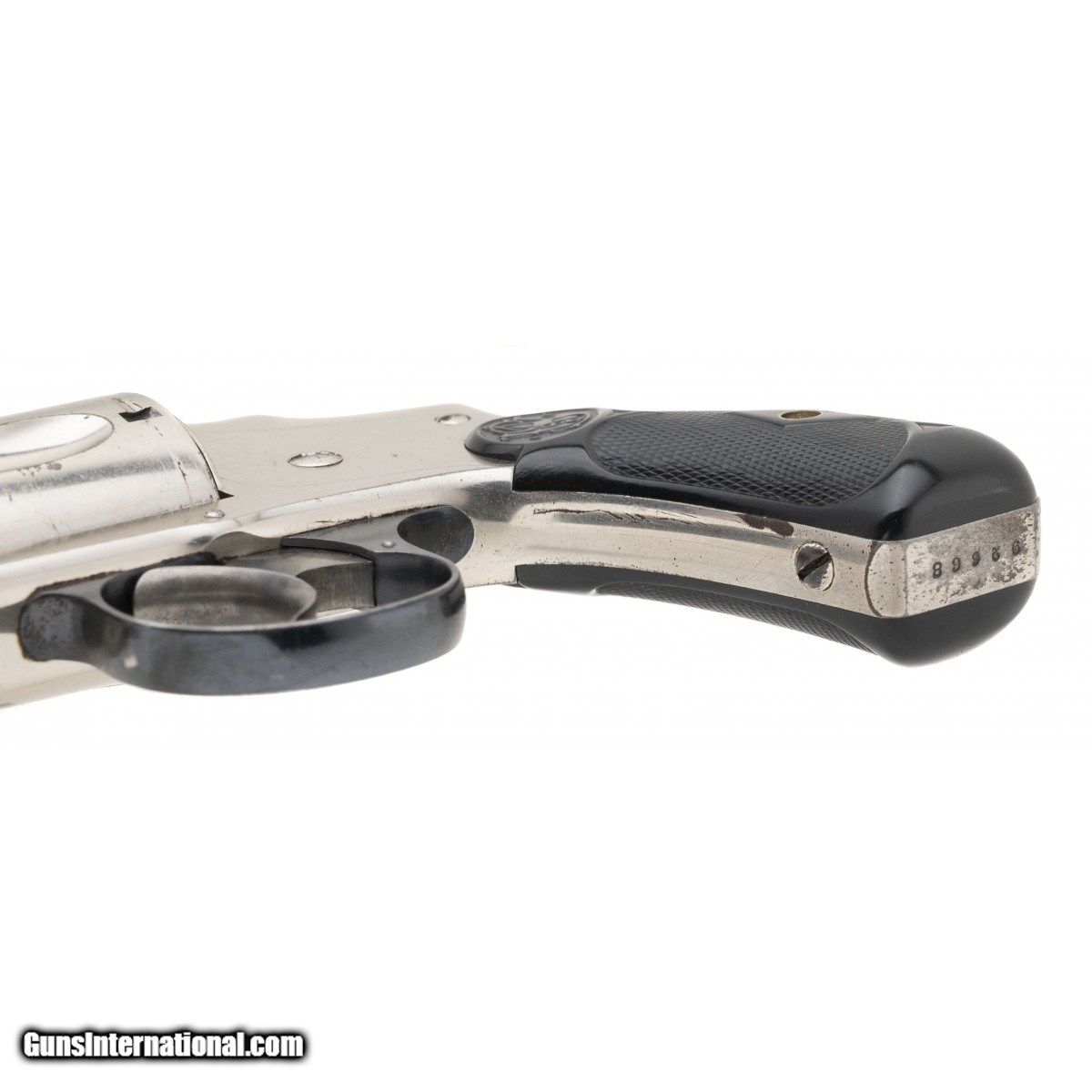Description: " Serial No. 92668, circa 1890-1898, .38 S&W, 3.25"" round barrel. Factory nickel finish rates 96% with light handling surface scuffs visible. Bore is bright and shiny with handsome rifling visible. Two piece black checkered grips are in excellent condition. Action indexes correctly with a tight lock up. Comes with original box. Consignment SOLD Antique: Yes |
