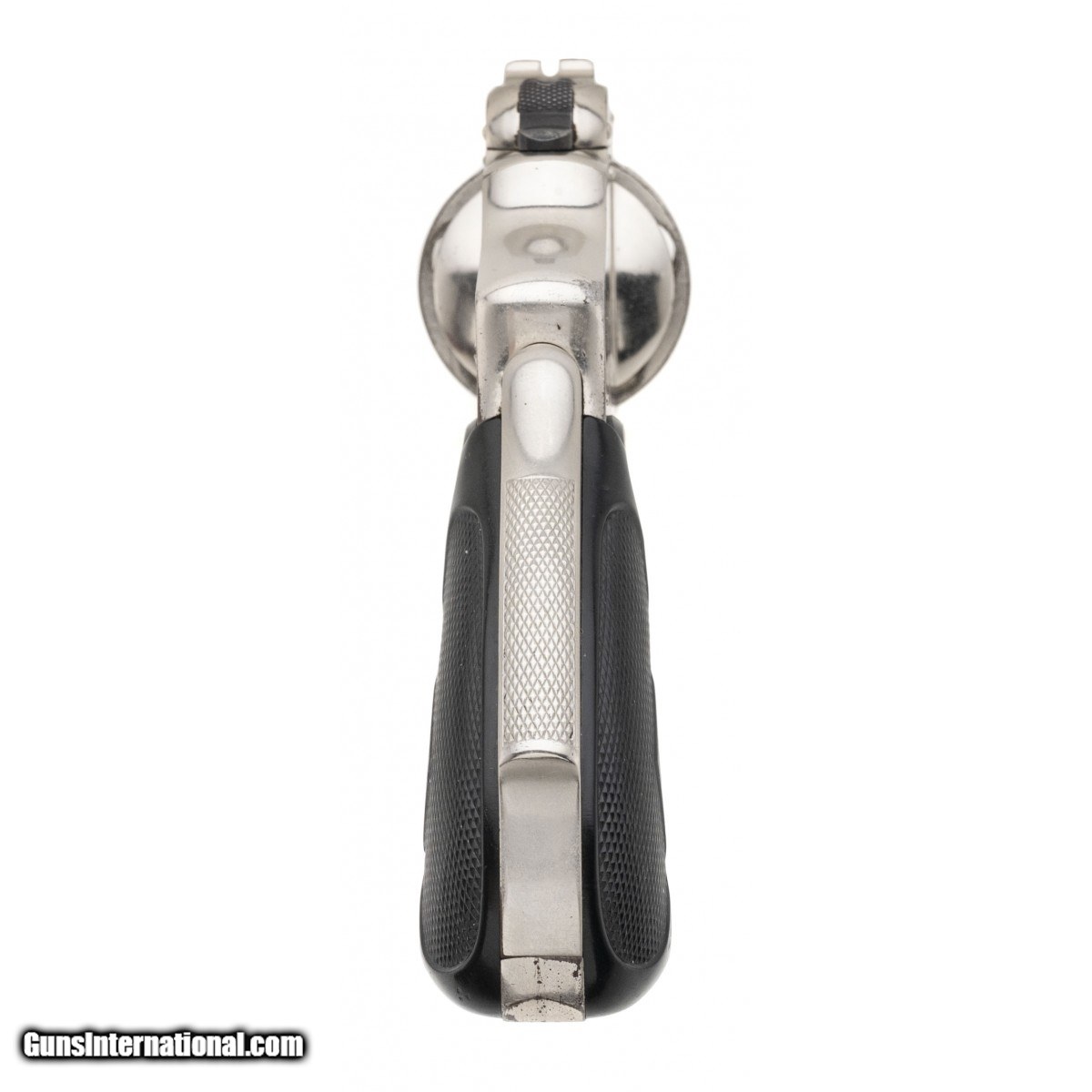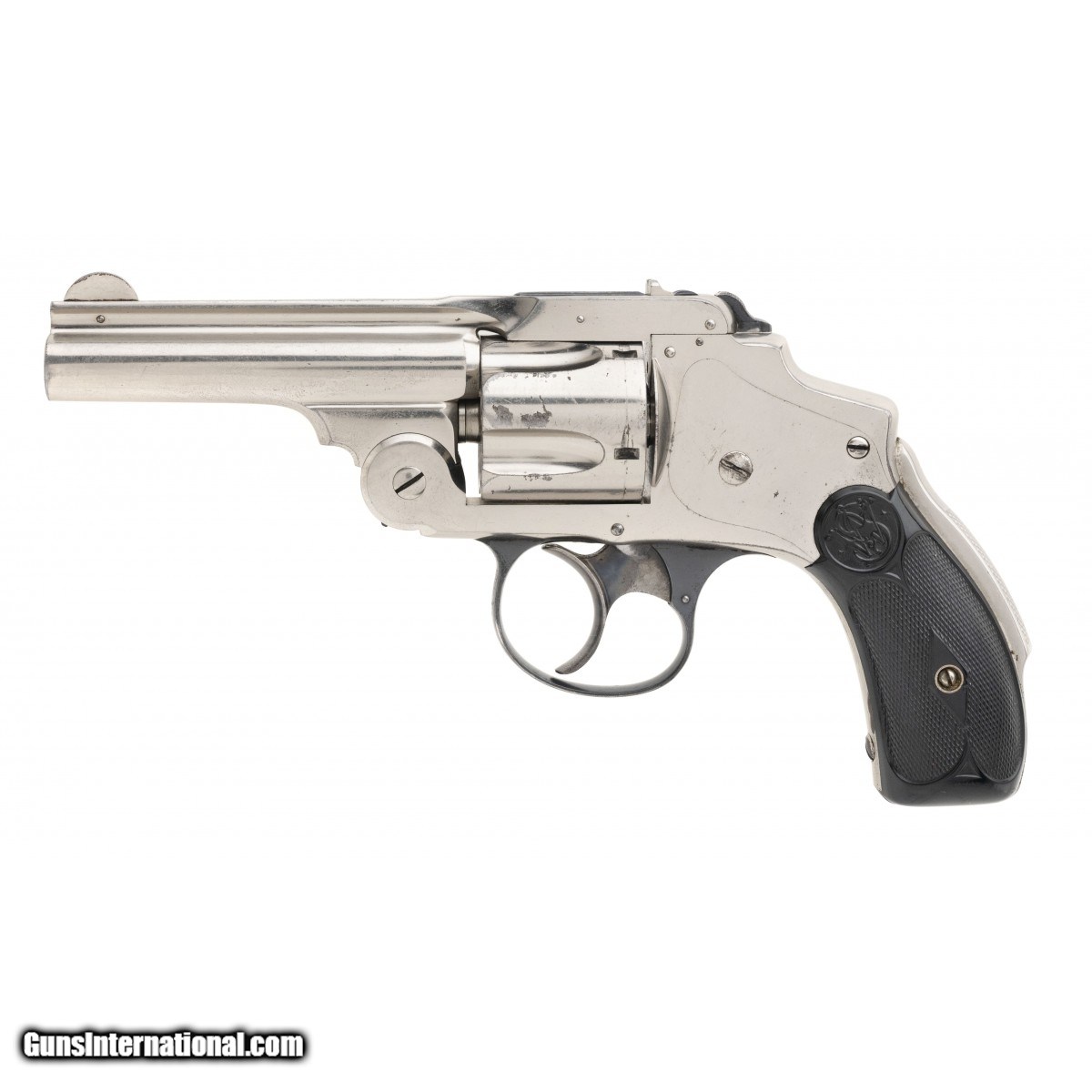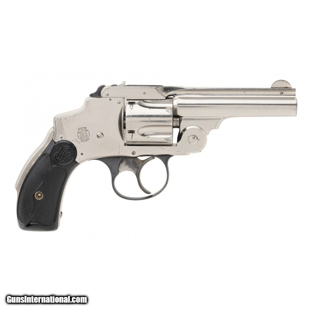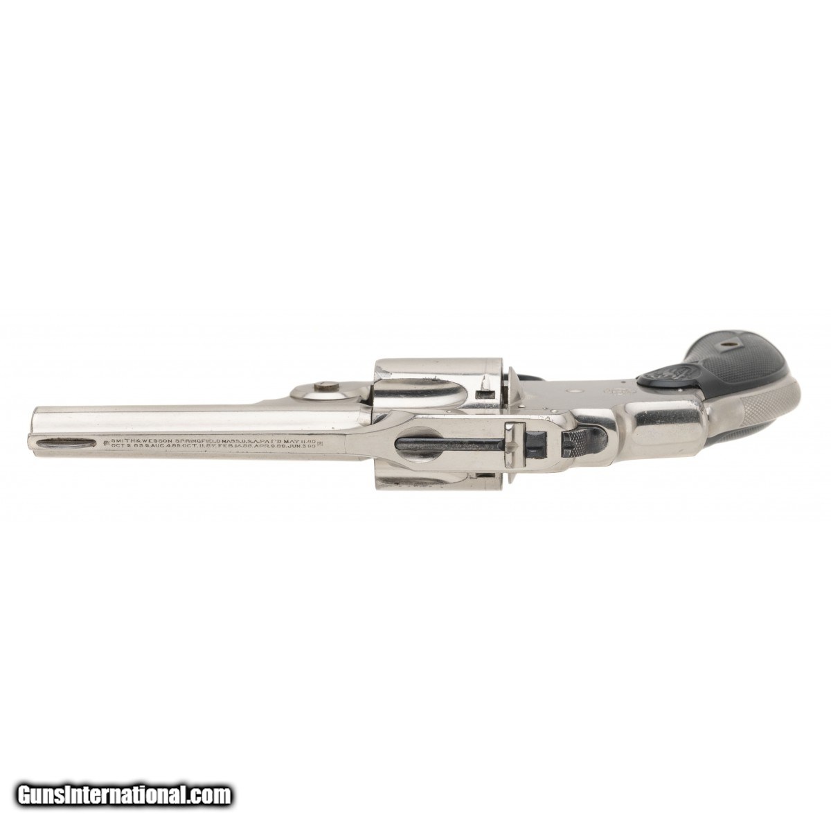 Description: " Serial No. 92668, circa 1890-1898, .38 S&W, 3.25"" round barrel. Factory nickel finish rates 96% with light handling surface scuffs visible. Bore is bright and shiny with handsome rifling visible. Two piece black checkered grips are in excellent condition. Action indexes correctly with a tight lock up. Comes with original box. Consignment SOLD Antique: Yes |