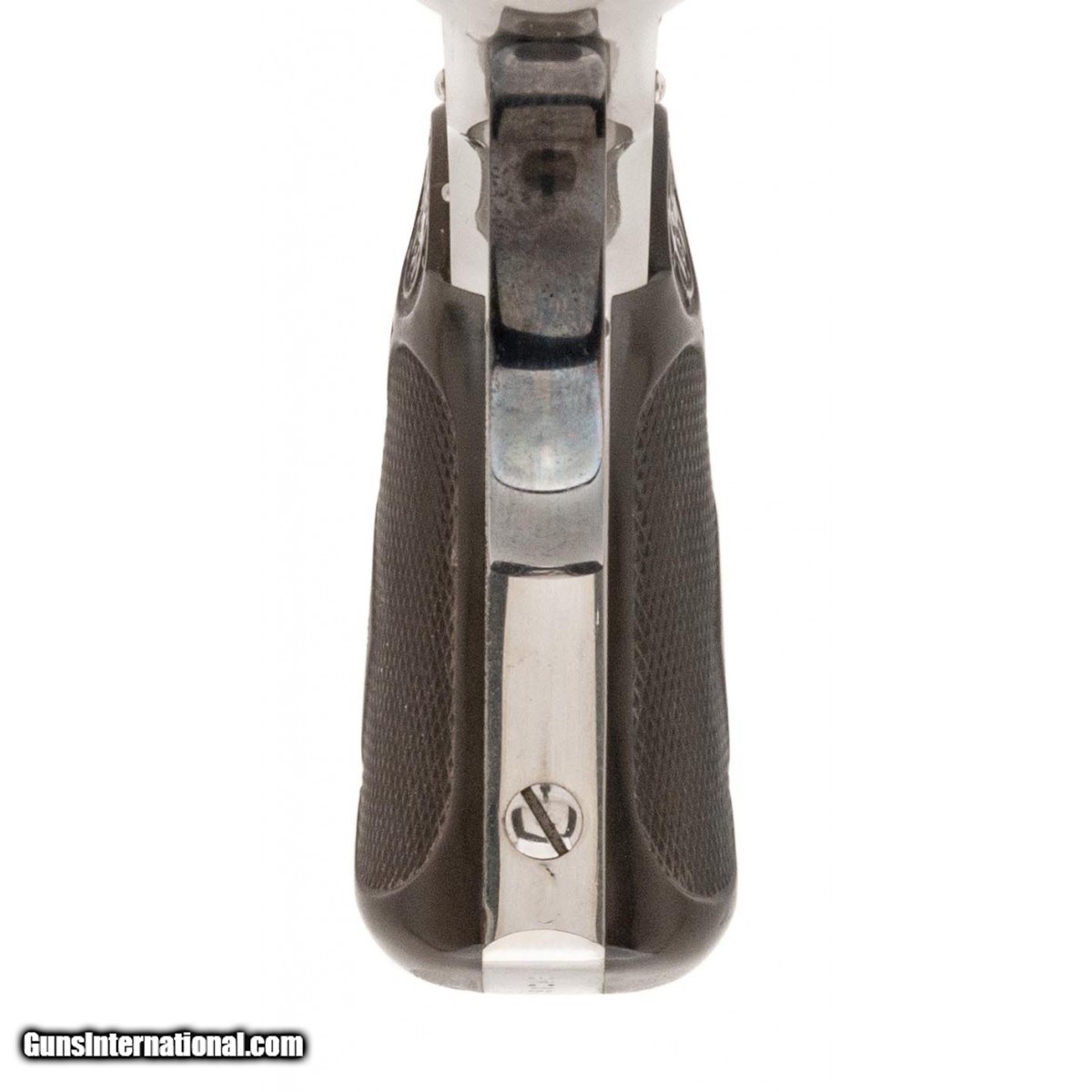 Description: " SN: 80146. Circa 1895. .38 Smith and Wesson with a 3.25"" ribbed barrel, bore is excellent. Double action revolver with nickel finish, blued trigger guard, case hardened trigger, shrouded hammer, lemon squeezer safety mechanism on back of grip and hard rubber grip with S&W trademark logo. Overall very good condition. (Consignment) SOLD Antique: Yes |