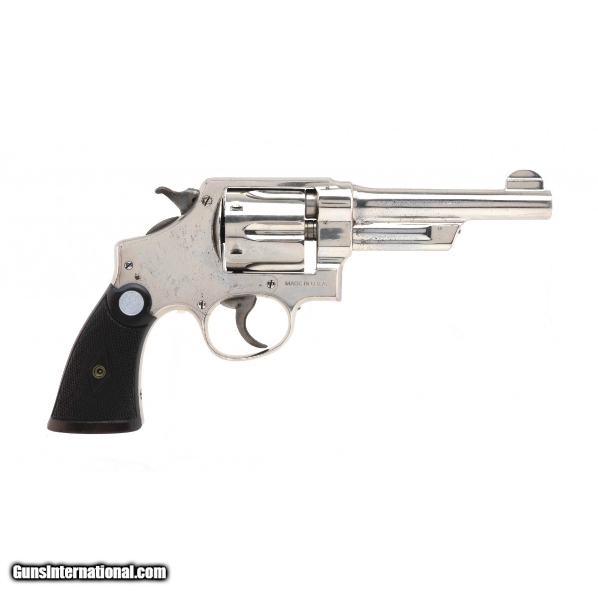 Description: " Scarce 5"" nickel plated model manufactured pre-war. Also referred to as the Wolf & Klar model. Bore is excellent. Original nickel plating is very good plus with some very minor flaking. Grips checkering is excellent. Action works perfectly. A desirable pre-war revolver! SOLD Curio/Relic: Yes |