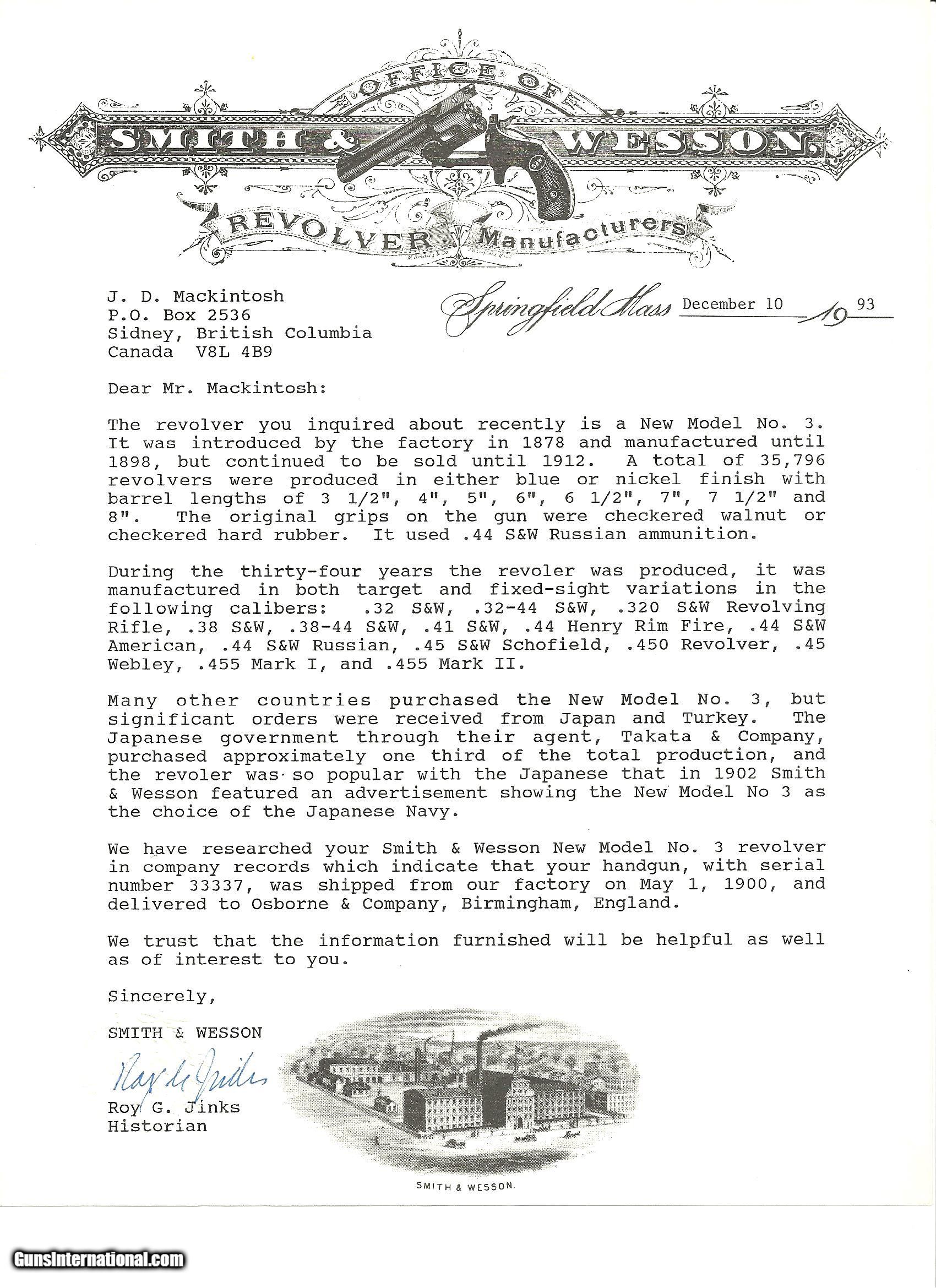 Description: A pair of S & W .44 New Model 3s For Sale, manufactured in late 1800s, perfect condition. Given the guns were originally shipped to my family in England and later to Canada, they have never been fired and in the same family since manufactured. Preference is to sell the guns as a pair however they could be sold individually. Note: ALL parts of both guns have matching numbers. Attached are scanned letters from Roy G. Jinks for each gun regarding their history and also attached are photos. The following is a detailed description of the guns with comments based on information found in the Standard Catalog of Smith & Wesson Guns: Standard Catalog of Smith & Wesson Guns – References to S&W .44 Model 3s The following references are from the 3rd edition of the Standard Catalog of Smith and Wesson Guns and as such, describe details associated with the pair of S&W .44 Russian Model 3s for sale. The text convention is: a) Page Reference with bold heading b) Italics for quoted text c) Comment on findings 1) Page(s) 121 First Model Russian or ‘Old, Old Model Russian or Model No. 3 Russian 1st Model’ Commercial guns numbered with the American models in serial number range 6000 - 32800 were manufactured c. 1871 – 1874. Russian contract guns serial number 1 – 20000. Given the serial numbers of 33337 and 33810, these are not Old, Old Model Russian or Model No. 3 Russian 1st Model 2) Page(s) 122 Second Model Russian or ‘Old Model Russian or Model No. 3 Russian 2nd Model’ Commercial guns were continued in the American serial number range, c. 32800 - 39000. Given the serial numbers of the guns for sale in this ad are 33337 and 33810 respectively, these could be Old Model Russian or Model No. 3 Russian 2nd Model given the serial numbers listed in the Standard Catalog of Smith & Wesson. However the research letter from Smith and Wesson, dated December 10, 1993 states that the guns are ‘New Model No. 3s’ indicating they are not ‘Russians’ at all. 3) Page(s) 123 Third Model Russian or ‘New Model Russian or Model No. 3 Russian 3rd Model’ Caliber: .44 S&W Russian or .44 Rimfire Henry. Single action revolver built on a top-break frame with 6-shot fluted cylinder, 6-1/2” barrel length, walnut grips, blue or nickel finish. Changes from the Second Model include shorter extractor housing than its predecessor and integral front sight forged as part of barrel rather than a pinned-on separate blade. Commercial guns are usually in a continuation of the American and Russian model serial number range 39000 - 53500. Standard Commercial Production 13,500 manufactured in .44 S&W Russian c.1874 – 1878. The sight on the barrel of S & W 33337 and 33810 are pinned and not forged as part of the barrel therefore they are not New Model Russian or Model No. 3 Russian 3rd Model either. 4) Page(s) 138-145 New Model Three Standard configuration is .44 Russian caliber, 6-1/2” barrel, fixed sights, wood or hard rubber grips, nickel or blue finish. Barrel lengths from 3-1/2” to 8”, target sights, fancy grips, fancy finish, detachable shoulder stock, engraving, and chambering for other cartridges were available on special order. It spawned related models, based on the same configuration and frame, including the New Model Number 3 Target Model in .32-44 and .38-44 caliber, the New Model Number 3 Frontier in .44-40, the New Model Number 3 in .38 Winchester, the Turkish Model in .44 Rimfire, and the .320 cal. Revolving Rifle. In 1878, the S&W New Model Number 3 followed hard on the heels of its popular Model 3 predecessors, the American, Russian, and Schofield models. Its improved handling characteristics and mechanical improvements made it an instant success, and arguably the finest single action revolver design of the 19th century. It dominated target competition in the late 1800s, and was purchased for military or police usage by the U.S., Japan, Turkey, Australia, Argentina, and Spanish colonial Cuba. Guns went to England, France, Germany, Italy, China, Switzerland, and elsewhere. See photo on Page 143 for the following variations. New Model Number Three variation features (33337 and 33810 in bold): a. Early long ejector housing with toothed gear extractor (top) vs. later short ejector housing and fingered extractor. b. Optional adjustable rear and bead on blade front target sights, top, usual configuration. Bottom shows unusual configuration special order target sights, including Bisley style rear. c. Rimfire (rare, left) vs. centerfire (standard) firing pin configurations. d. Henry Nettleton U.S. inspector marking found on rare Maryland militia martial variation. N/A e. Japanese military purchase markings (not present on a majority of Japanese purchase guns), left Japanese Navy anchor with wavy lines, center Japanese Navy plain anchor, right rare Japanese “Artillery” marking. N/A Caliber markings, introduced late in production. .44 S&W designates standard Russian chambering. .44 Winchester marking as found on some Frontier Models. .38-44 (also found as .32-44) from Target Model. Target sights will bring 10% premium, slightly more for unusual configurations. Most common type consisted of a screw adjustable blade mounted on the rear latch, with a pinned somewhat rectangular front sight topped with a long bead. The New Model Number 3 was the first revolver offered by S&W with factory target sights. Although not cataloged until 1887, they were available as early as the late 1870s. From Page 146: Gun serial number shipping information…. • All of 32668 - 33197, shipped to Takata Sept/1/1898. Per Smith and Wesson letter from Roy Jinks Smith and Wesson historian, December 10, 1993, guns 33337 and 33810 were shipped to Osbourne and Company (Solicitors) Birmingham, May 1, 1900 and April 29, 1902 respectively. (see also letters from Roy G. Jinks) • Many of 33501 - 33642, shipped to Takata May/16/1904. Conclusion: Guns 33337 and 33819 are New Model Threes in ‘As-New’ condition. The guns h