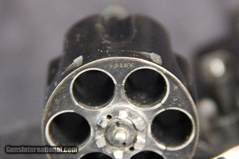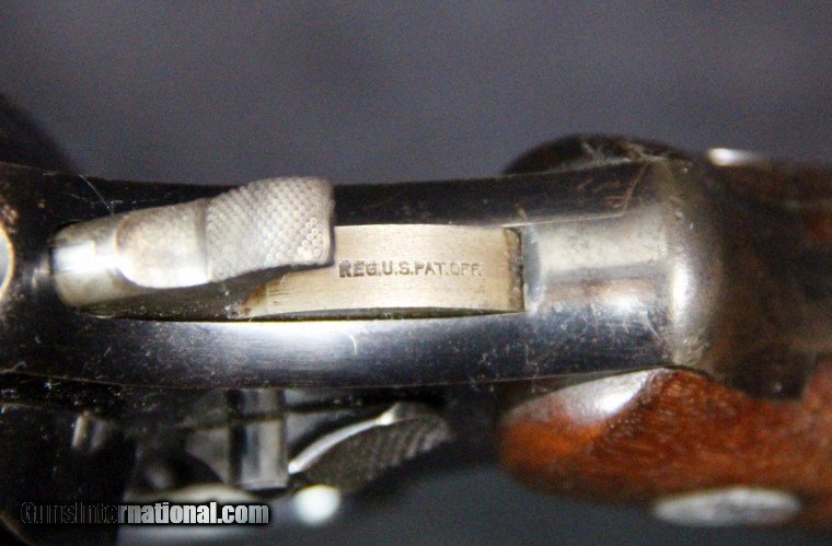 Description: .44 spec, #59186, 4 inch barrel, blue finish, 2 piece walnut diamond grips, letters to Wolf & Klar, 1940. Condition: excellent bore, 95% blue overall, excellent grips, right grip numbered to the revolver, excellent mechanically, excellent marks. SOLD Curio/Relic: Yes |