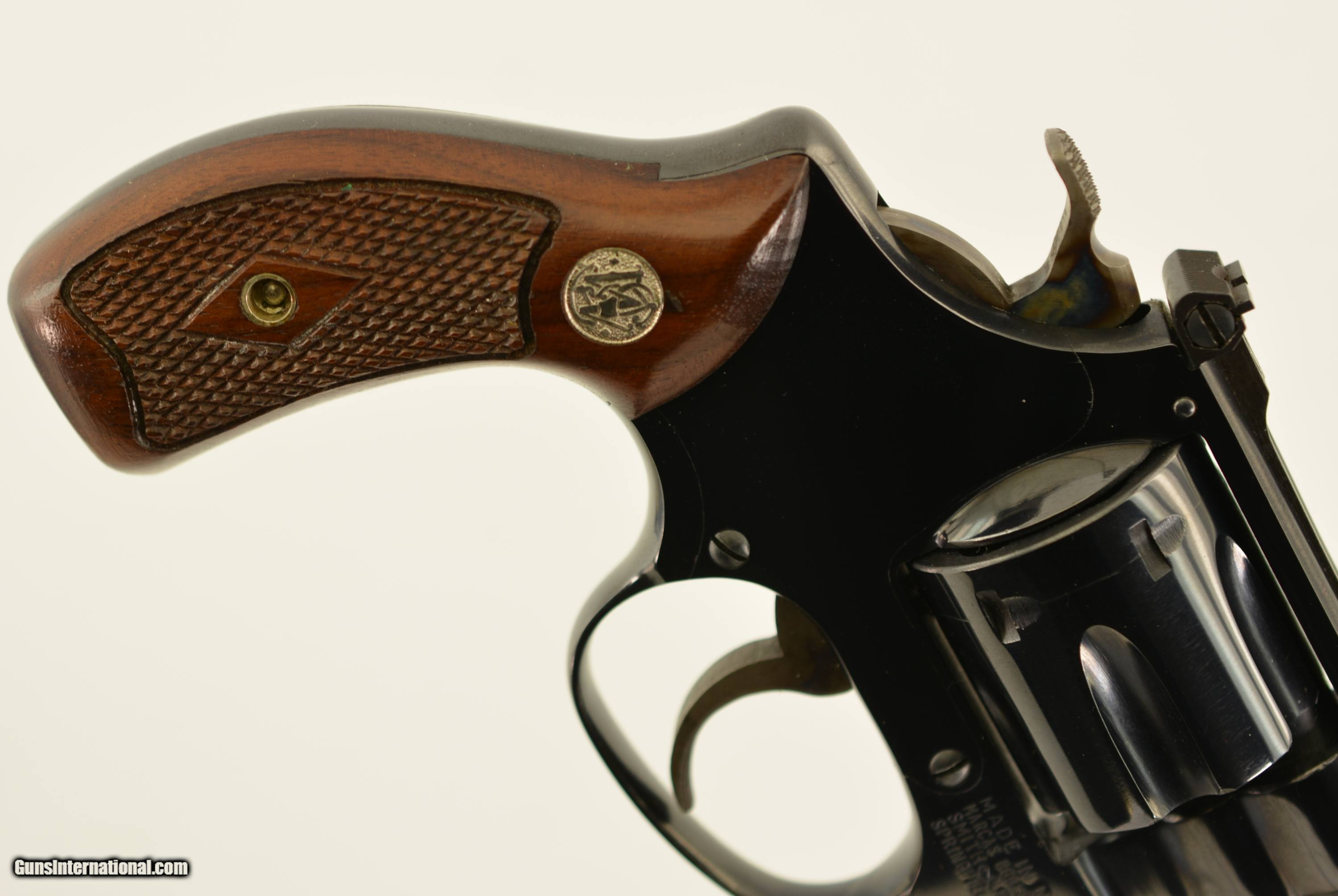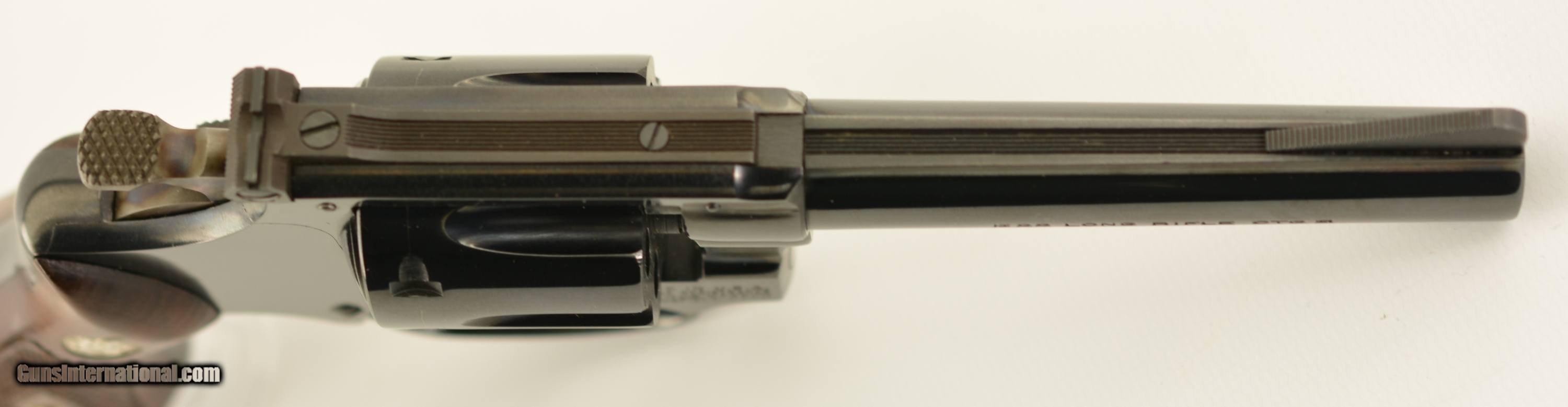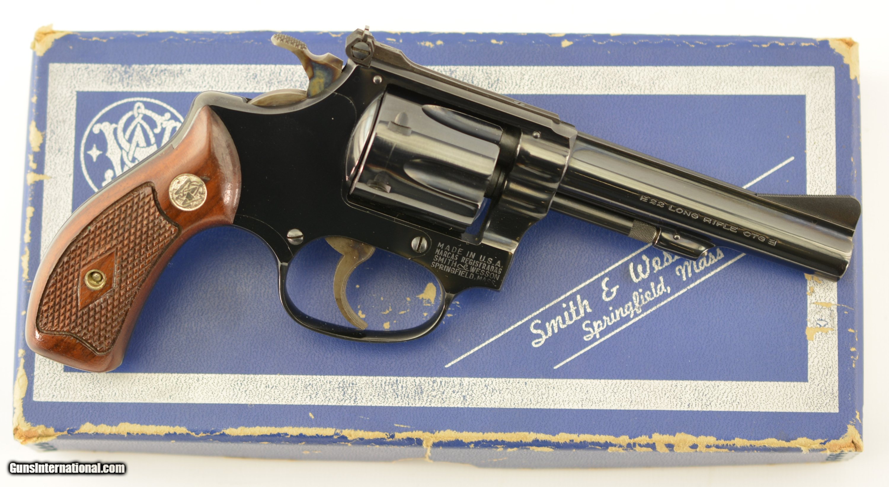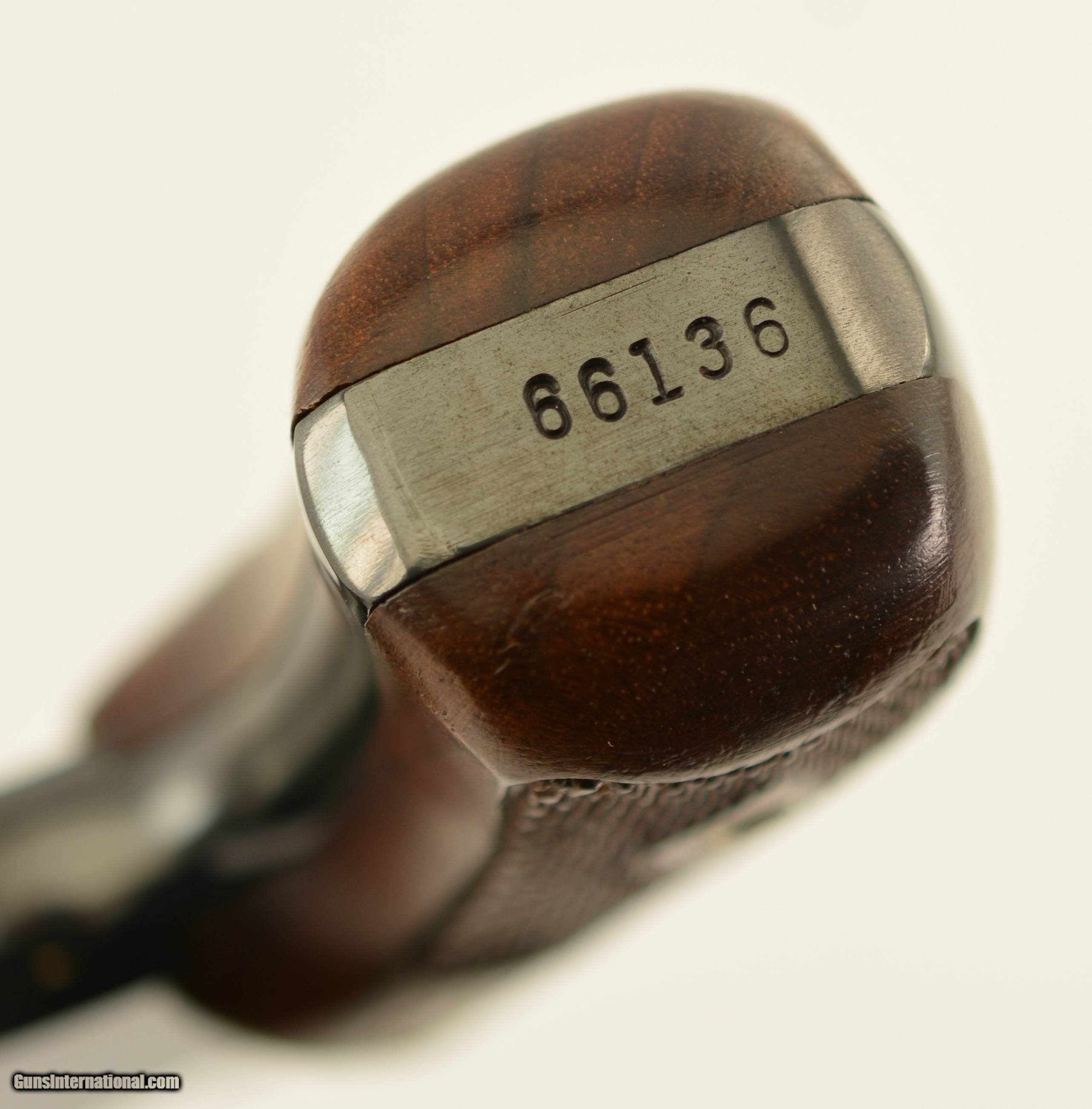 Description: Serial #66136, .22 LR, 4" barrel with an excellent, bright bore. This is a handsome revolver that has retained nearly all of the original blue finish, with only a slight turn-ring on the cylinder. The hammer and trigger retain virtually all of their original color case-hardening, and the checkered walnut diamond-center grips, numbered to the gun on the interior, are likewise excellent showing little evidence of use. The revolver is housed in the original blue, two-piece S&W box, numbered to the gun on the end label. This is just a fantastic, almost unused example of a flat-latch S&W Kit Gun. FFL or C&R SOLD Curio/Relic: Yes Manufacturer: S&W Model: 34 Serial Number: 66136 Caliber Info: .22 Gauge Info: .22 |