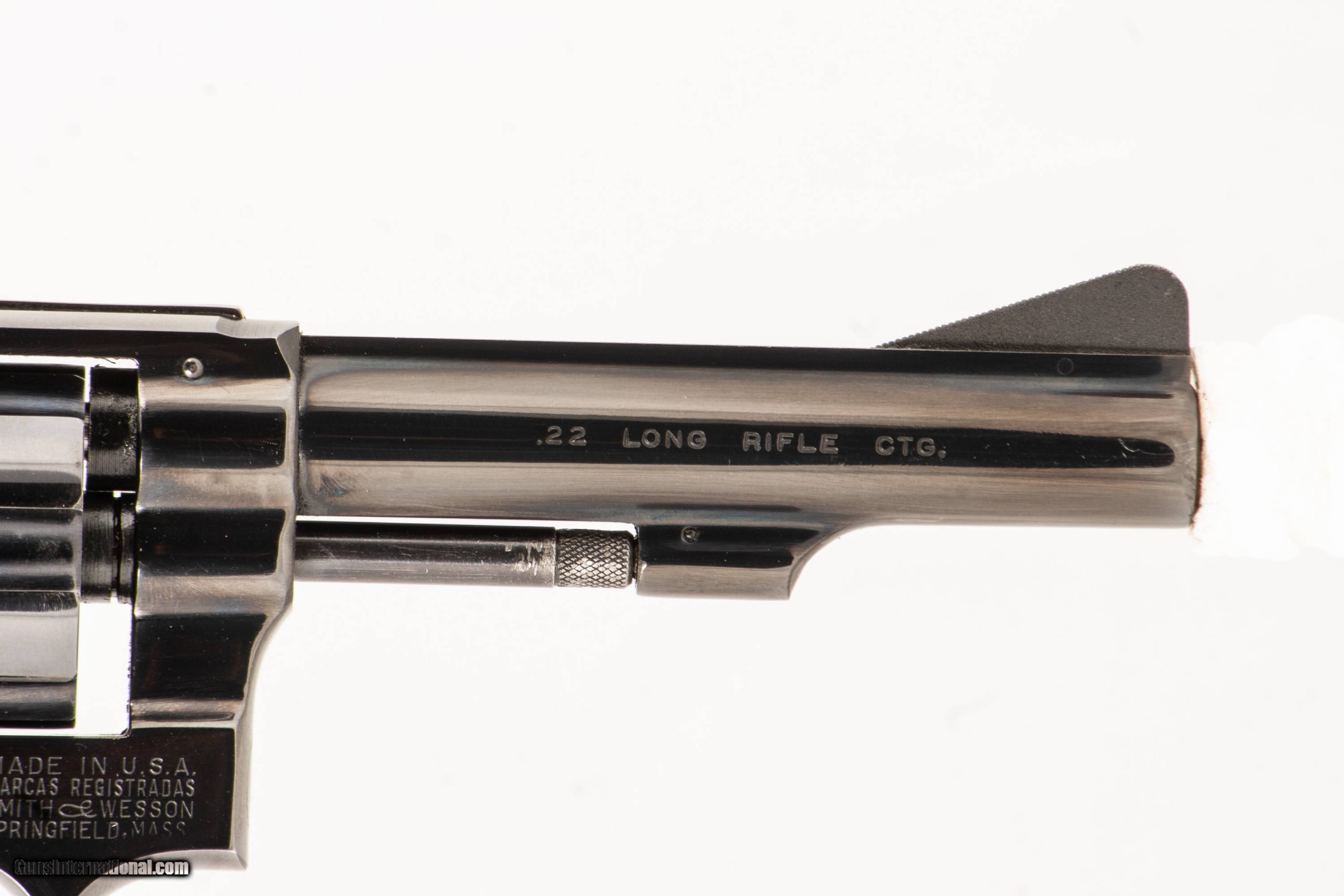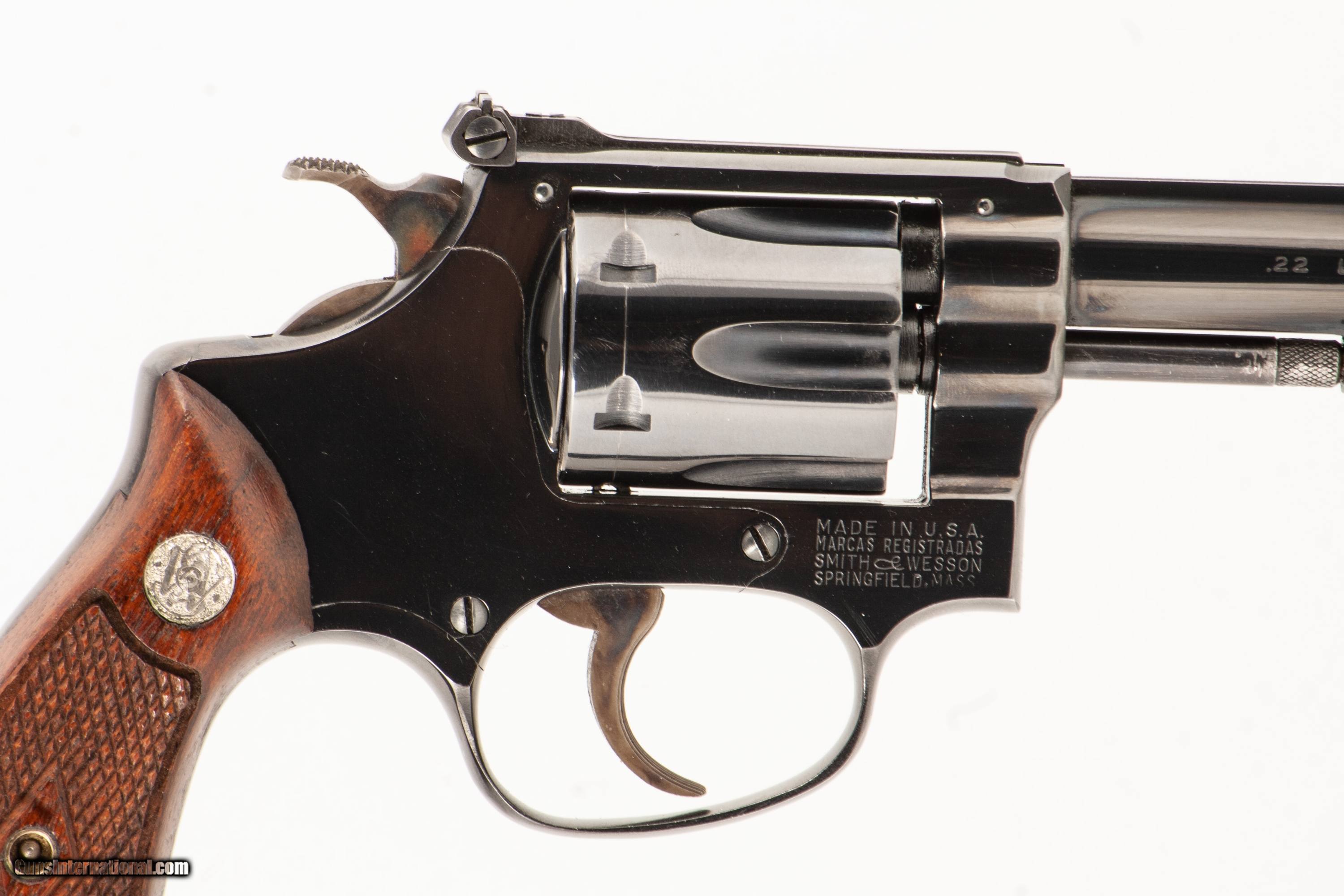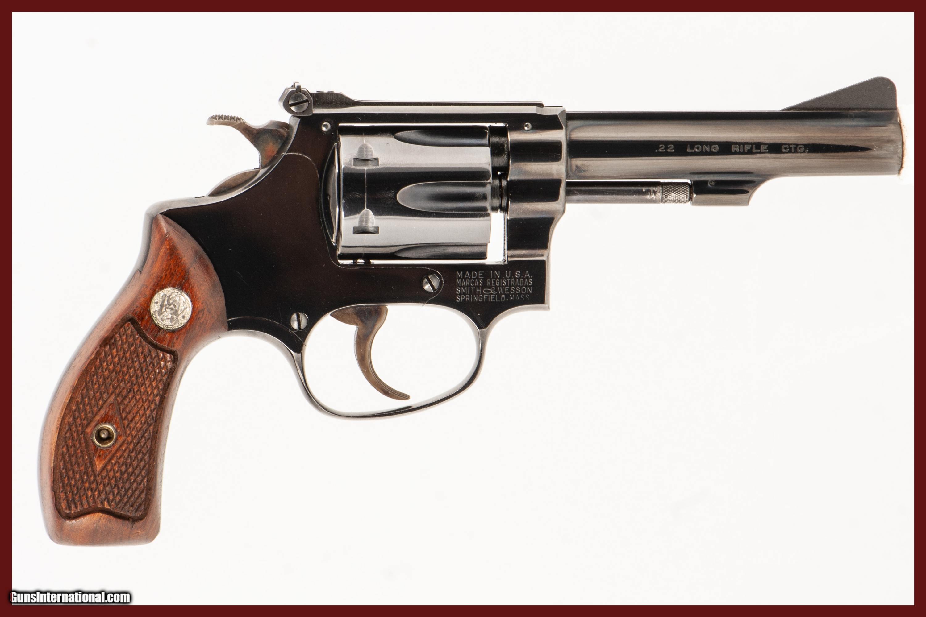 Smith & Wesson Model 34-1 chambered for 22 LR with a 4 inch barrel that has a bright & shiny bore. This firearm is in excellent condition and is covered by Dury's Lifetime Warranty.