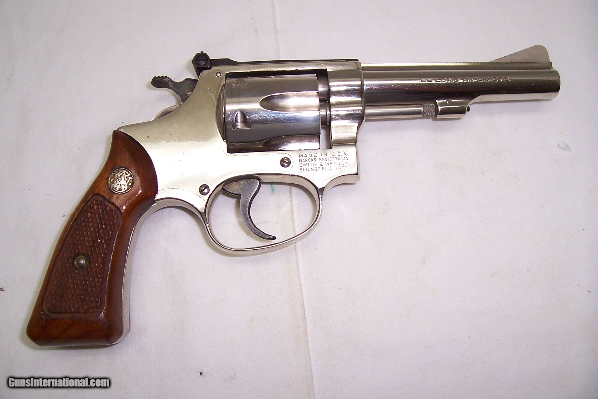 Description: A very nice S&W 34 - 1 with 4 inch barrel, beautiful nickel finish in 22LR. Adj rear sight and S&W checkered wood grips. No nicks or dings, locks tight and funnctions great. SN M211xxx SOLD Manufacturer: Smith & Wession Serial Number: M211xxx Caliber Info: 22 LR |