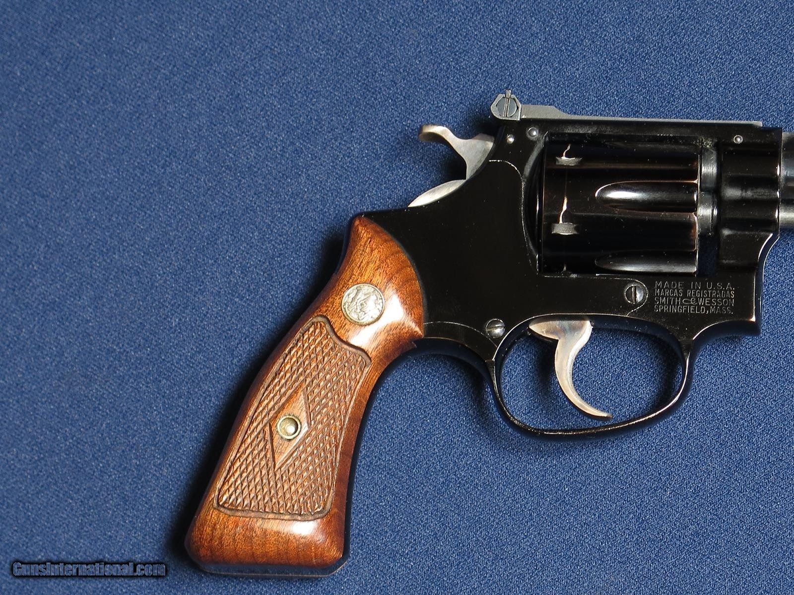 Description: Smith & Wesson 34 22LR. Early model. SN 14,2XX. Diamond grips. Pinned barrel. Recessed cylinder. Excellent condition. SOLD |