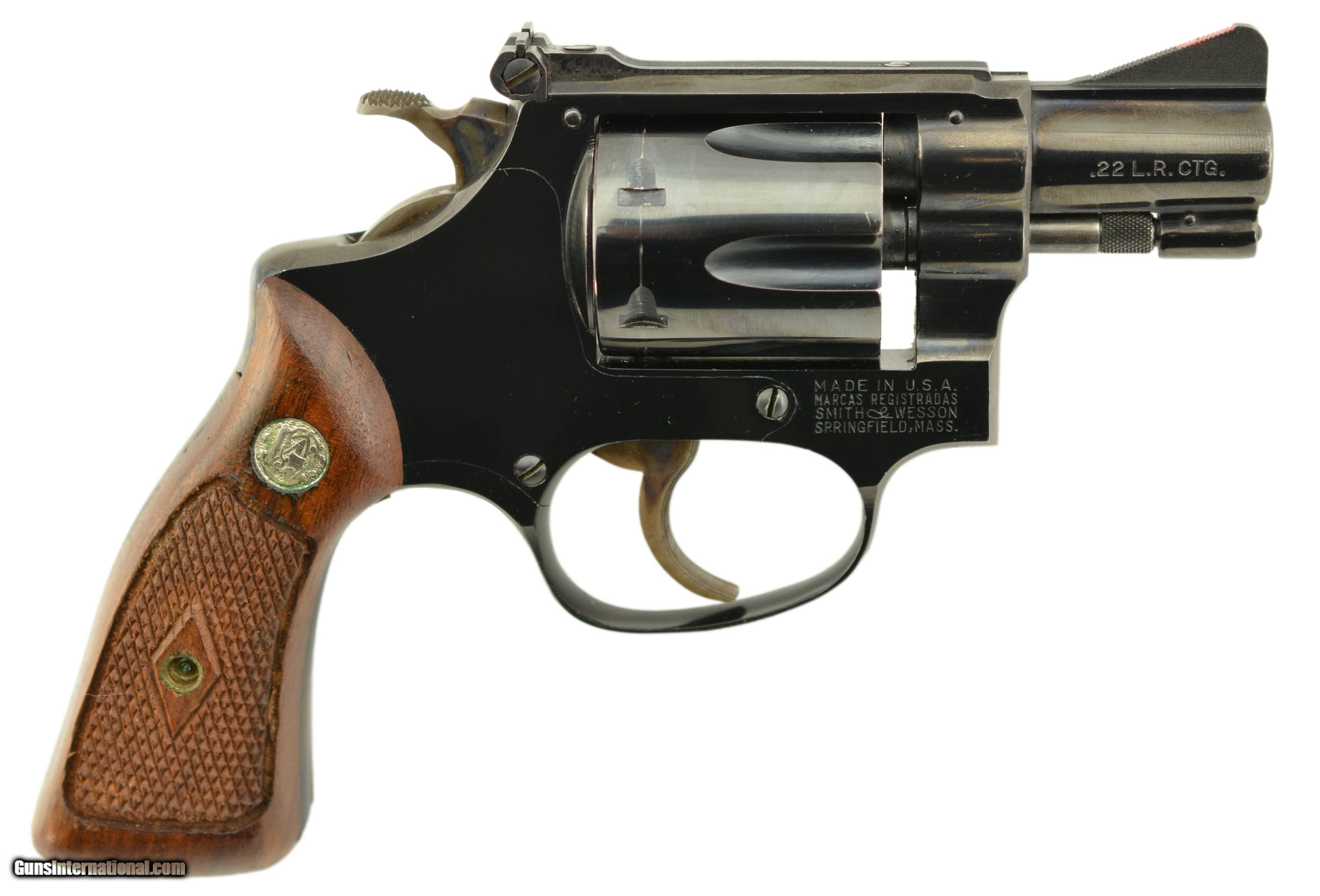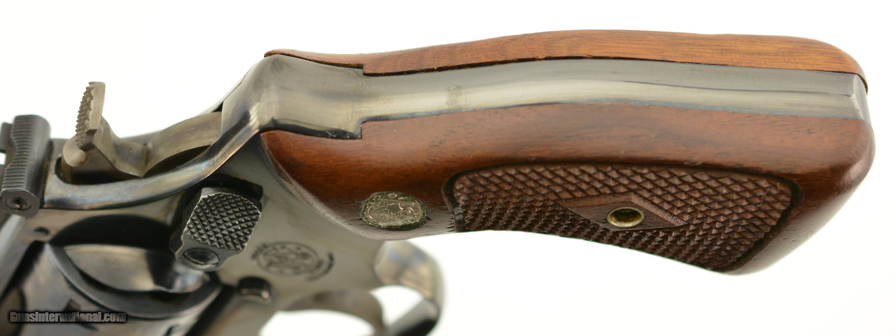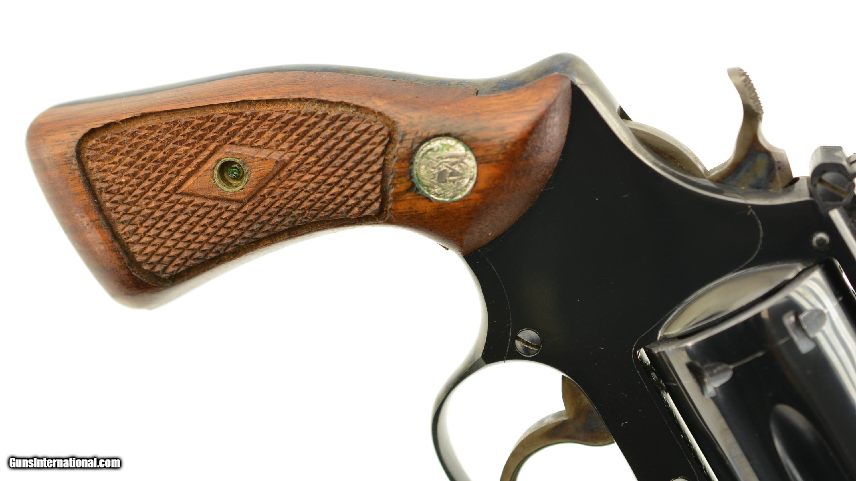 Description: Serial #103923, .22 LR, 2 inch barrel with a bright, excellent bore. This is the Smith & Wesson model 34-1 "Kit Gun" featuring adjustable micrometer click rear and serrated ramp front sights, and serrated case color trigger and hammer. Manufactured prior to 1969 this handy revolver is in excellent condition retaining about 95-97% of the original blue finish on the barrel, frame and cylinder with some silvering on the high edges, slight holster wear and a thin drag line. The trigger and hammer show most of the original case color and the S&W medallion grips with diamond around the screw escutcheon rate excellent but are not numbered to the gun. FFL or C&R SOLD Curio/Relic: Yes |