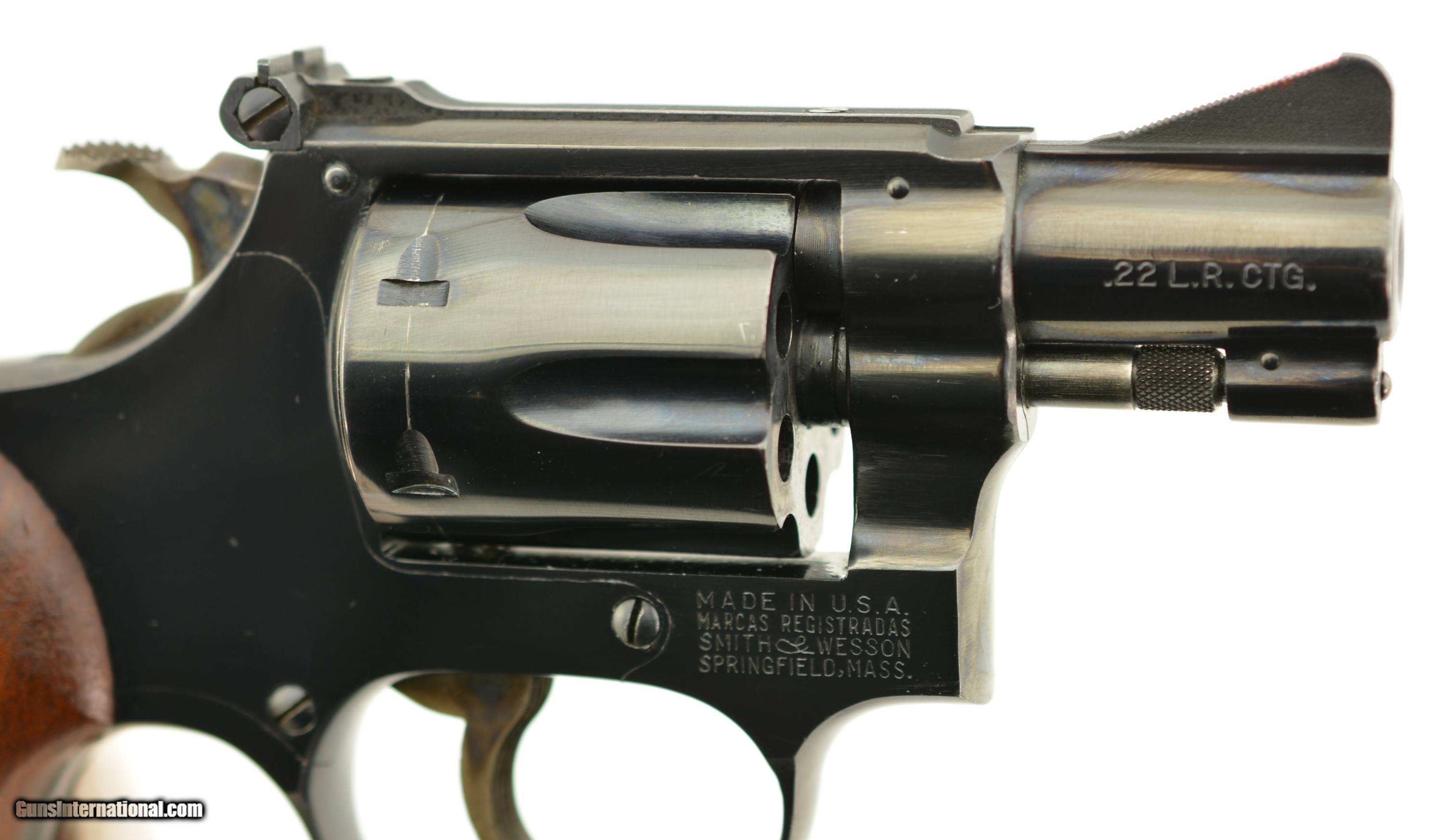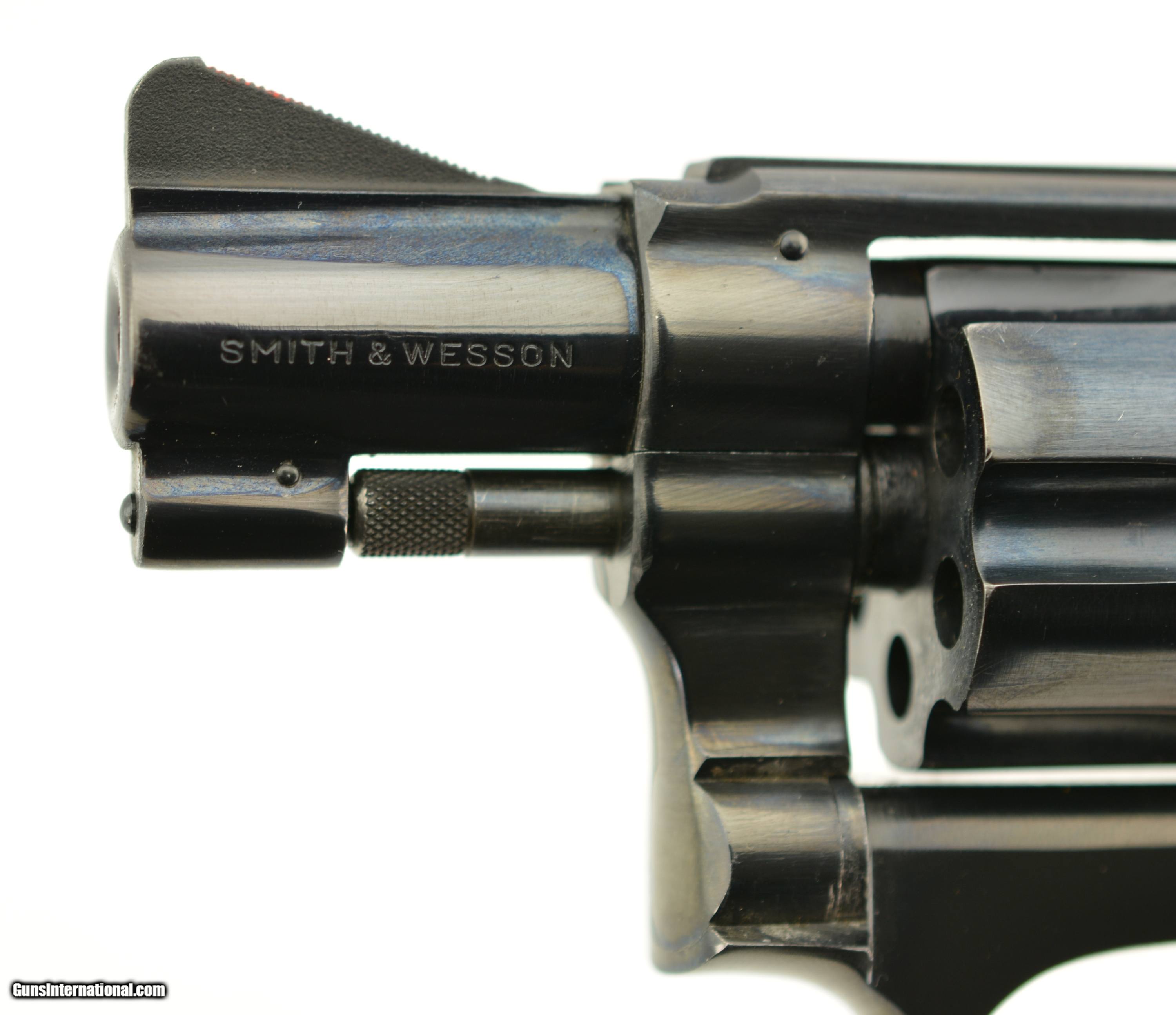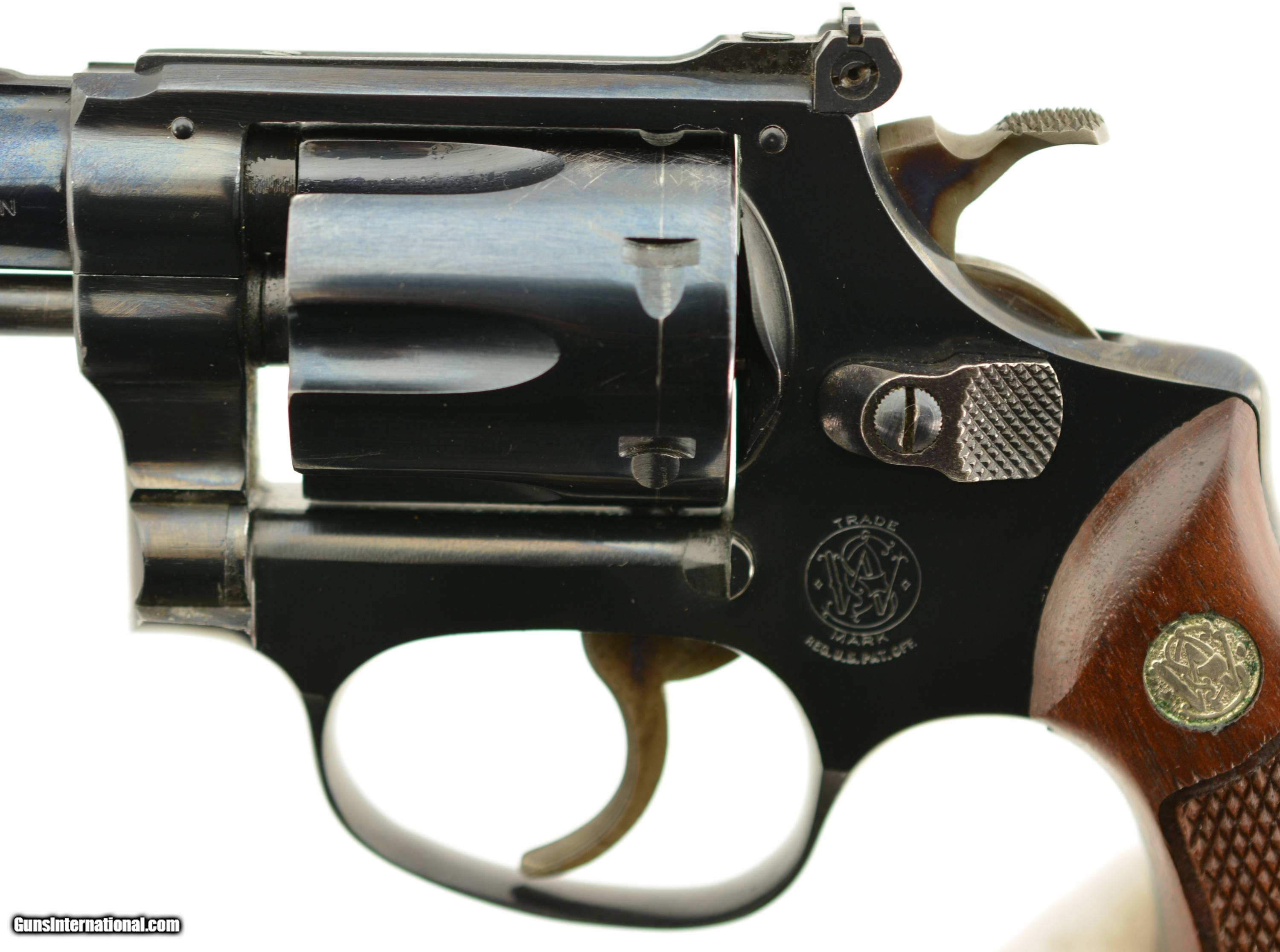 Description: Serial #103923, .22 LR, 2 inch barrel with a bright, excellent bore. This is the Smith & Wesson model 34-1 "Kit Gun" featuring adjustable micrometer click rear and serrated ramp front sights, and serrated case color trigger and hammer. Manufactured prior to 1969 this handy revolver is in excellent condition retaining about 95-97% of the original blue finish on the barrel, frame and cylinder with some silvering on the high edges, slight holster wear and a thin drag line. The trigger and hammer show most of the original case color and the S&W medallion grips with diamond around the screw escutcheon rate excellent but are not numbered to the gun. FFL or C&R SOLD Curio/Relic: Yes |