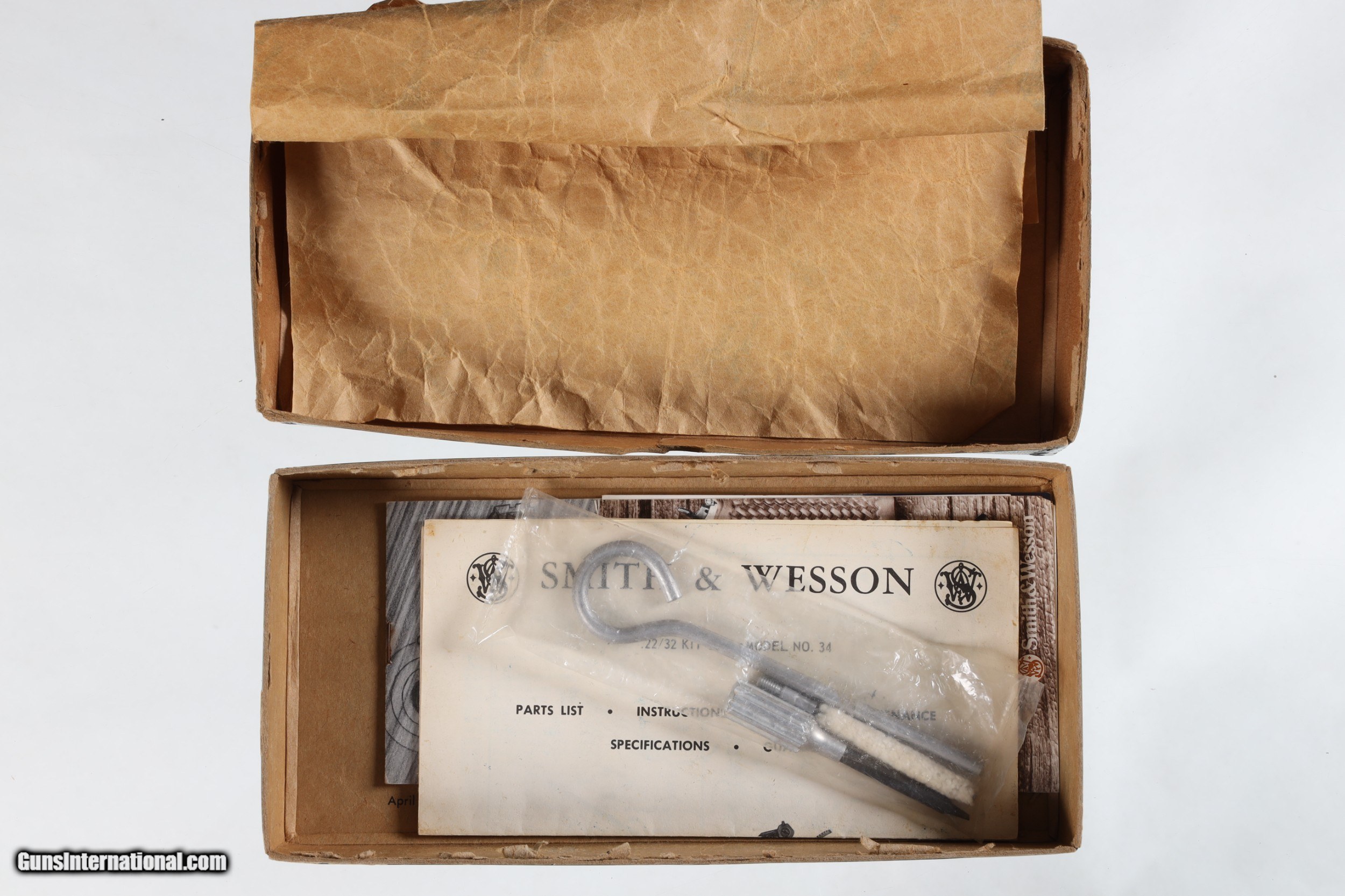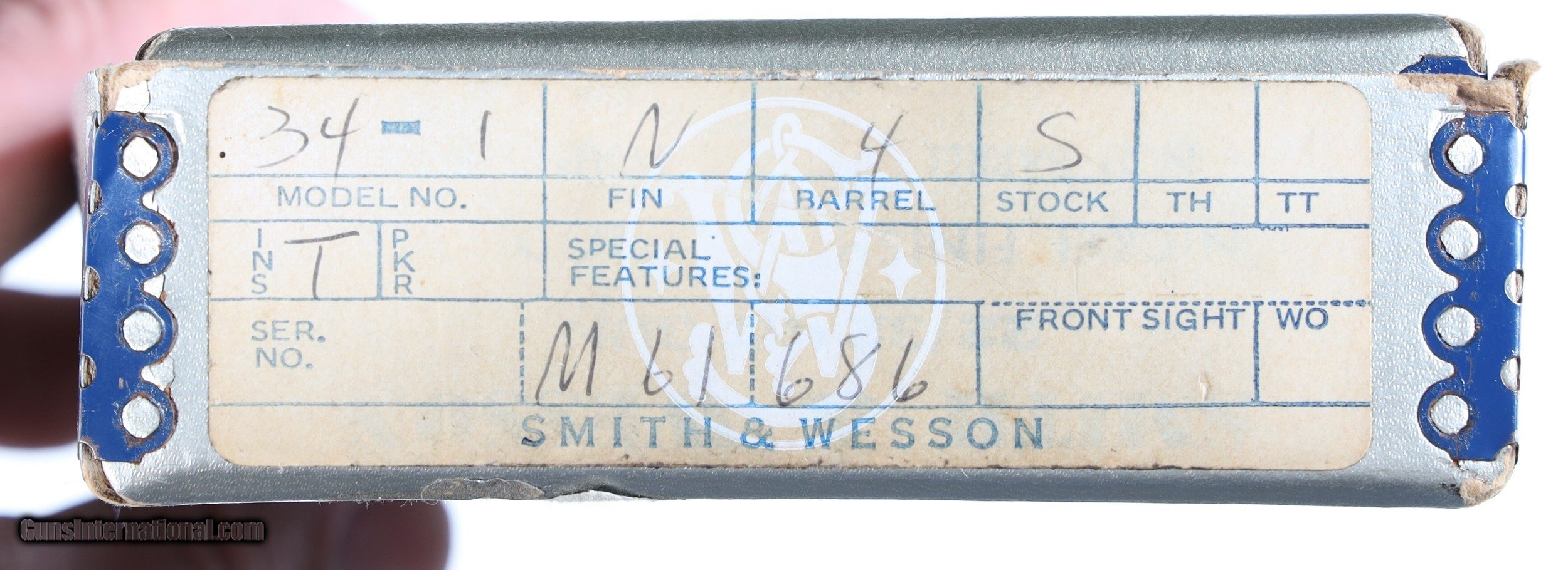 Description: Excellent overall condition with factory box numbered to gun with paperwork and unopened cleaning kit. Mfd in 1973. • Free Shipping, No Credit Card Fees. • Lay-a-way available for this firearm. • 1/3 Down, a 1/3 in 30 Days 1/3 in 60 Days. SOLD Manufacturer: Smith & Wesson Model: 34-1 Serial Number: M61686 Barrel Length: 4 |
