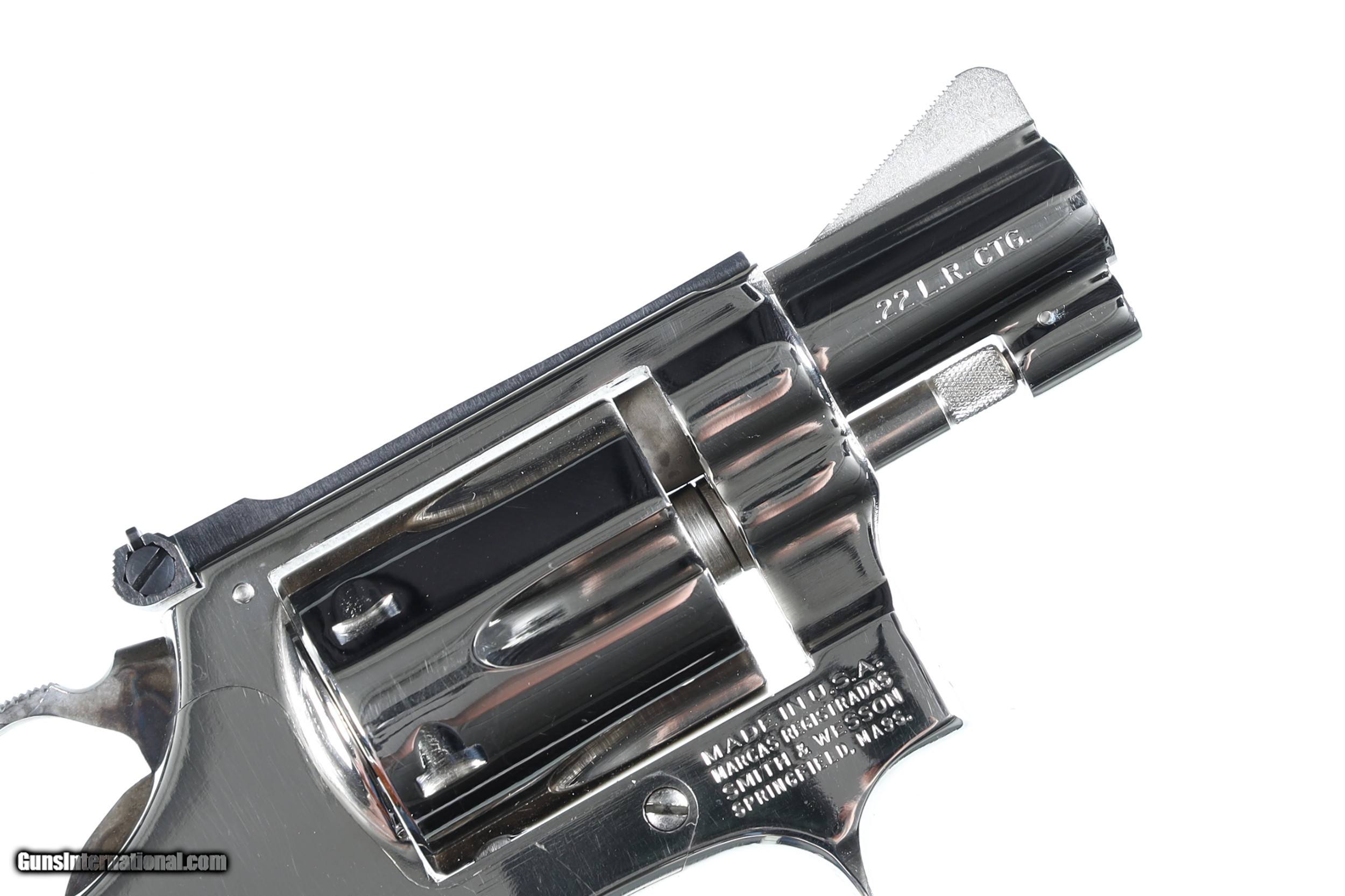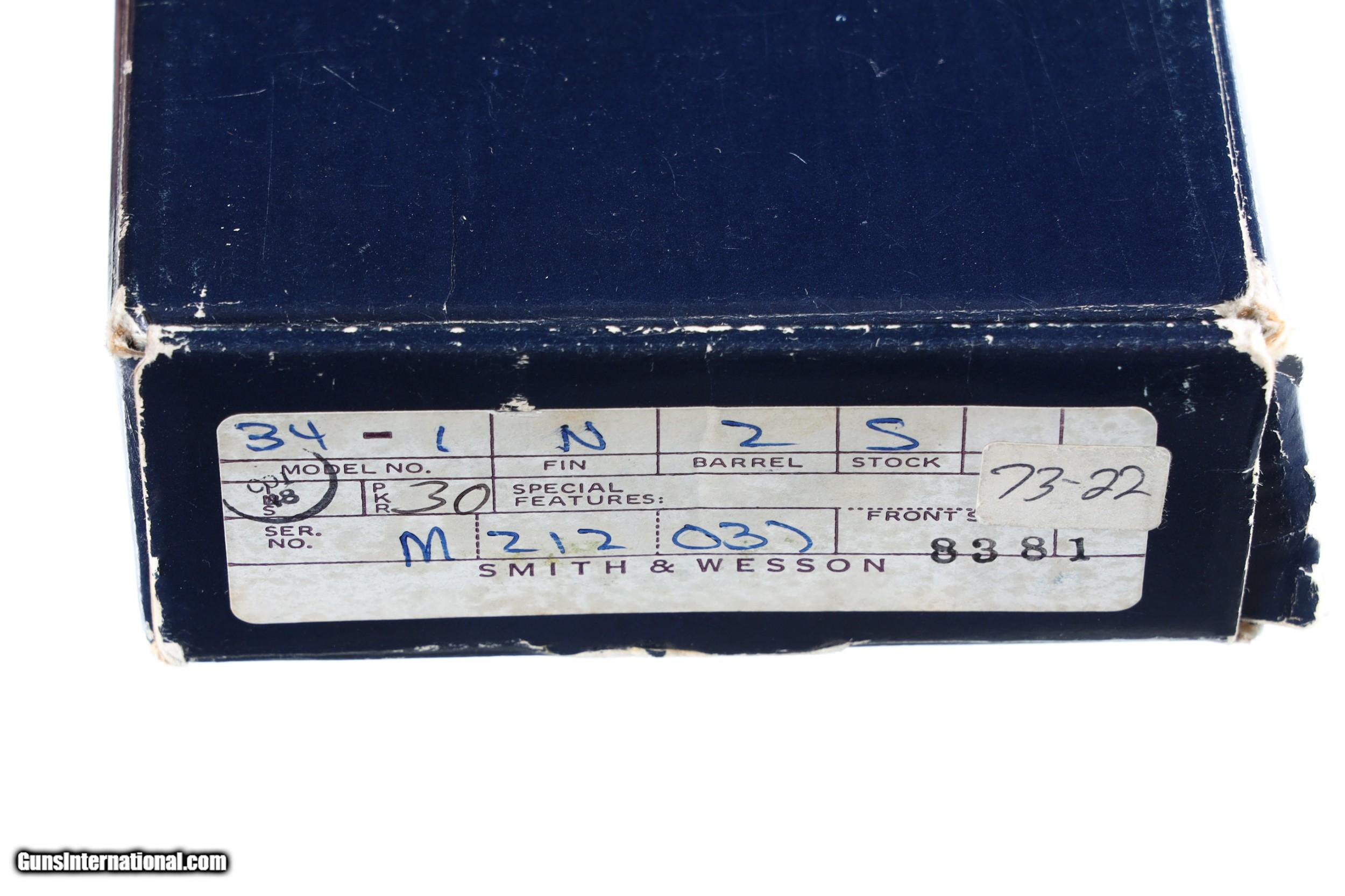 Description: Excellent overall condition, minimal light handling marks, with factory box numbered to gun. • Free Shipping, No Credit Card Fees. • Lay-a-way available for this firearm. • 1/3 Down, a 1/3 in 30 Days 1/3 in 60 Days. SOLD Manufacturer: Smith & Wesson Model: 34-1 Serial Number: M212037 Barrel Length: 2 |