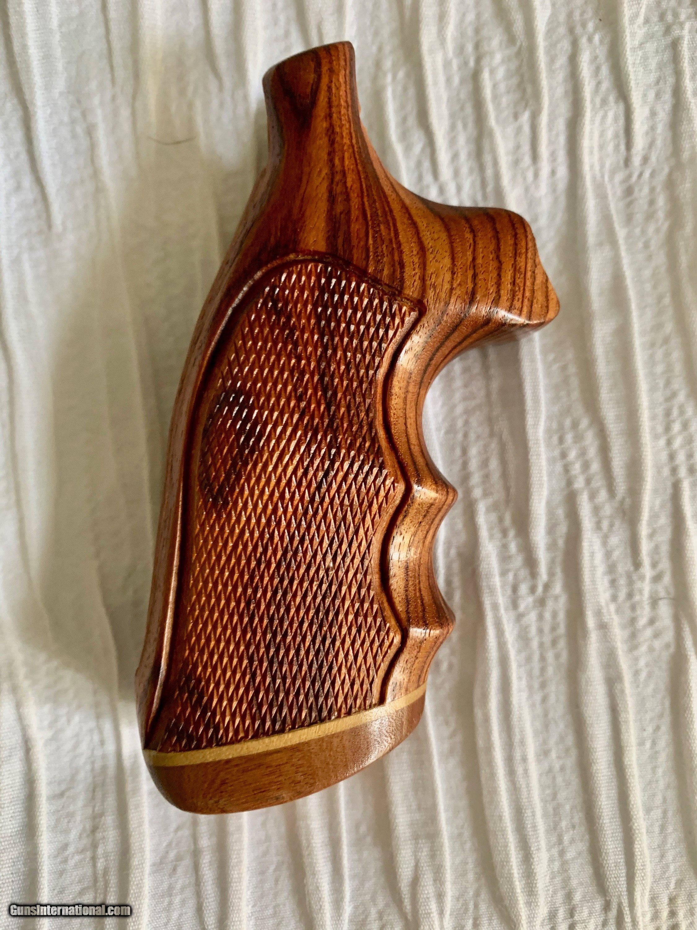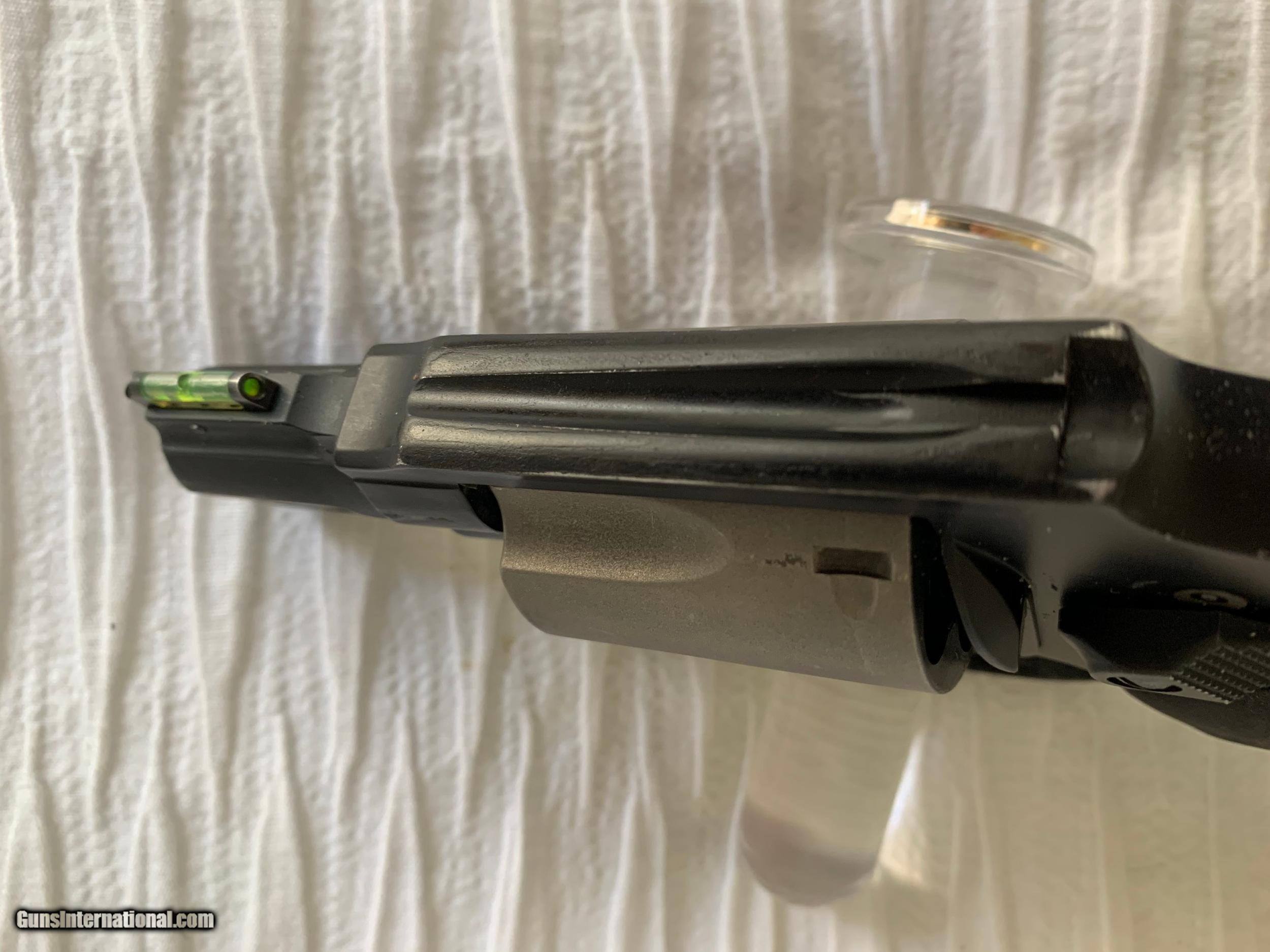 Description: This is the perfect carry or pocket gun. You don't even feel that it's there. Small but extremely powerful .357 Magnum or .38 Special + P. Includes 2 holsters and custom Hogue wood grips. Shows holster wear. Worn on my hip for years while a police detective. Only fired yearly for qualification. The current list price is over $1000. The Model 340 PD is a variation of the Model 40 Centennial AirLite® that integrates the time-tested features of the original with modern advancements including HI-VIZ® Fiber Optic Green front sights. This revolver is a favored back-up and concealed carry firearm due to its lightweight, enclosed hammer, and reliability. Features • Lightweight Scandium Alloy Frame for Easy Carry • Titanium Alloy Cylinder • Stainless Steel Barrel • Lightweight – Only 11.8 ounces • Snag-Free Enclosed Hammer • HI-VIZ® Fiber Optic Green Front Sight • Rated for Continuous +P Use RETURN POLICY: All firearms come with a 3-day inspection / return privilege to cover any issue that was NOT noted in the written description or shown in the photos of the item. The inspection period begins at time of delivery to your dealer. It is your responsibility to inspect the gun in this time frame and contact me by phone or e-mail, of any issue. Any damage, disassembly or shooting the firearm voids any return or adjustment options that may be extended. In case of return buyer pays shipping. All original shipping materials must be included. SOLD Handgun Caliber: .357 Magnum Manufacturer: Smith and Wesson Model: 340PD Condition: Very Good Metal Condition: Very Good Wood Condition: Excellent Bore Condition: Very Good Action: Double Action Only Finish: Matte Weight: 11 oz Sights: HI-VIZĀ® Fiber Optic Green |