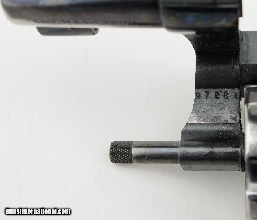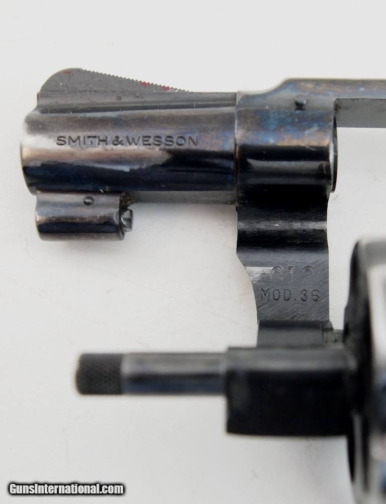 Description: S&W 36 (No Dash) .38 SPL, 1 3/4" bbl, bright shiny bore, good rifling, iron sights, blued finish, holster wear on barrel - cylinder, serrated trigger - checkered hammer are color case hardened, and checkered hardwood stocks with S&W medallions inset. Add 3% for Credit Card Shipping 25.00 SOLD |