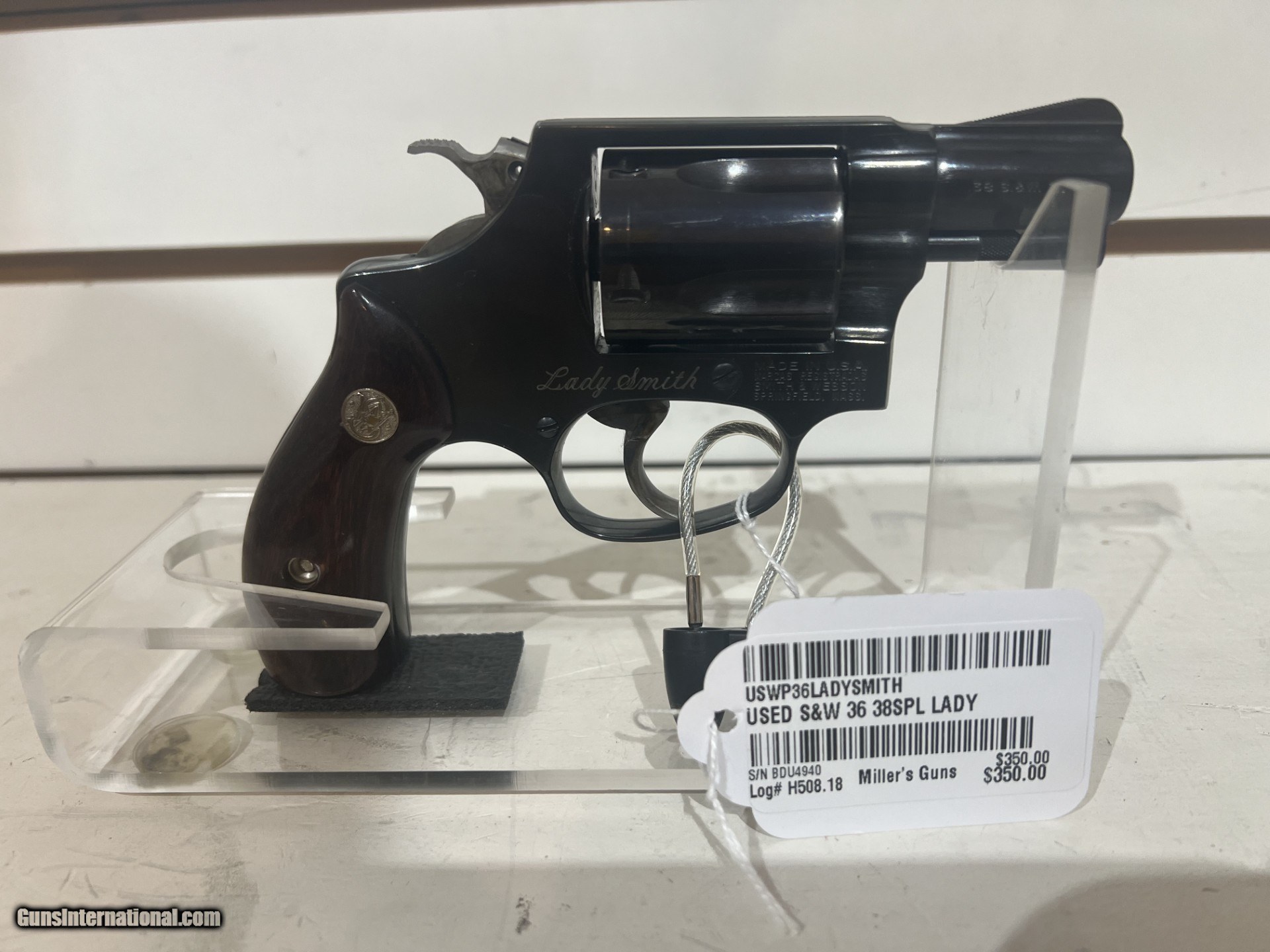 Description: Pre Owned Very Good Condition "Lady Smith" model 38 spl 5 shot cxapacity Rosewood Grip SOLD Handgun Caliber: .38 Special Manufacturer: Smith & Wesson Model: 36-2 "Lady Smith Serial Number: BDU4940 Barrel Length: 1 7/8 Condition: Very Good |