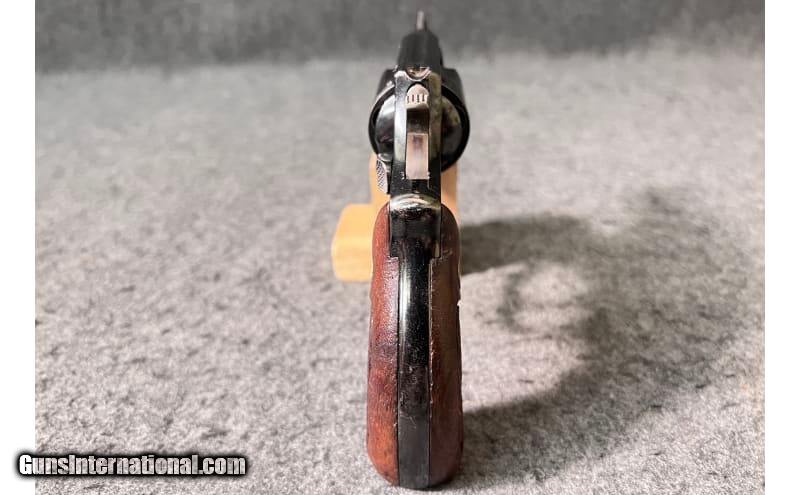 Description: This circa 1973-74 J-frame revolver is a Smith & Wesson Model 36 (no dash) chambered in .38 S&W Special. It has a serrated ramp blade front sight, top-of-receiver grooved rear sight, a serrated trigger, and an unshrouded ejector rod. The bluing appears to be original but is thinning throughout with some mottled areas to the right side of the barrel, and some barely noticeable freckling to the left side of the frame. The grips are lightly worn, but show no cracks or chips. The patina on the grips is nice. .38 S&W Special SOLD Chambers: 5-round cylinder Metal Condition: "Bluing appears to be original but is thinning throughout with some mottled areas to the right side of the barrel, and some barely noticeable freckling to the left side of the frame Wood Condition: "The grips are lightly worn, but show no cracks or chips. The patina on the grips is nice. Barrels: 1 7/8" barrel Triggers: Serrated trigger Stock Dimensions: 6¼" overall length Fore End: Unshrouded ejector rod Butt Pad: J-frame square butt Weight: 1 lb 2 0z Sights: "Serrated ramp blade front sight, top-of-receiver grooved rear sight Item Location: Wichita, KS |