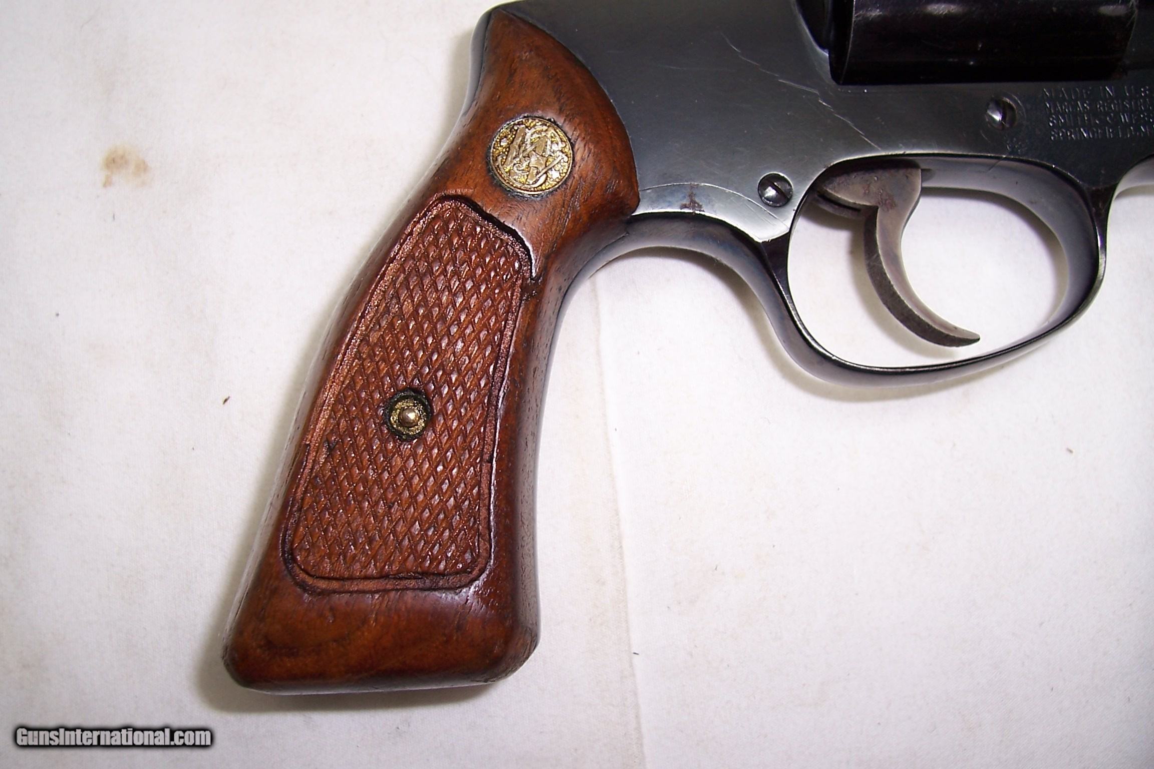 Description: Very nice S&W model 36( no dash), 3 inch pinned barrel and S&W checkered wood grips. Locks tight and functions great, has slight wear on end of barrel and small scratch on right side of frame in front of grip, hardly noticeable. Seial number 43Jxxx, call or email any questions. thanks SOLD Manufacturer: Smith & Wession Model: 36 Serial Number: 43Jxxx Caliber Info: 38 special Bore: excellent Condition: excellent Metal Condition: Some wear Wood Condition: very good Barrels: 3 inch Barrel Type: pinned Finish: Blue |