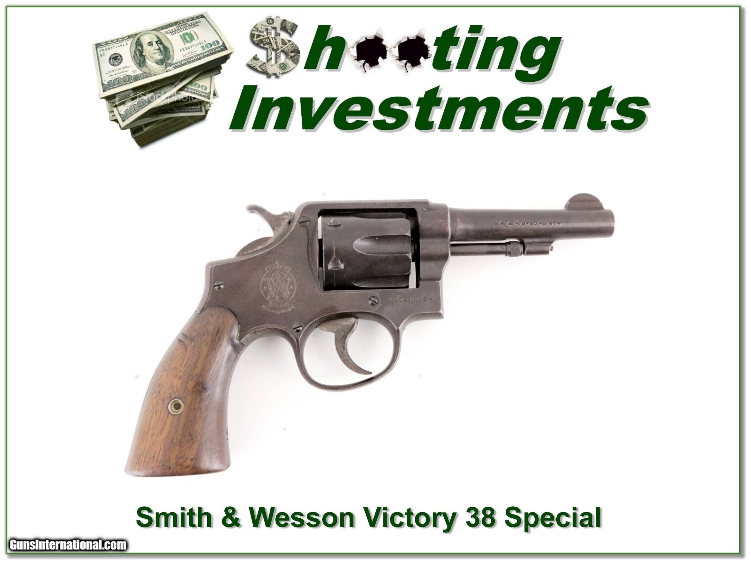 Description: Collectors, this is an all-original Smith & Wesson Victory in 38 Special. All number Match! I am selling this one on consignment and as such lay-a-way can’t be used. It does of course have the standard 3-day inspection. Shipping with insurance is $39. Please email me with any questions or larger pictures. (Consign your quality firearms with Shooting Investments for only 12%! Let me know if you have any you would like to sell!) 18-0765 Payment: Payment is by Money Order, Cashiers Check or Personal Check. I can now also accept MasterCard and Visa with a 3% convenience fee. PayPal can be used for some items but never firearms. Please let us know if you would like to pay via PayPal. Shipping: The shipping charge will be listed in each description. It is $39 for most long guns and $29 for most handguns. Some heavy guns or those insured for over $2000 will be higher. Shipments to Alaska and Hawaii are higher because air shipment is required. Most firearms are shipped on Tuesday and Thursday and usually in 5 days of receipt of payment. We package all shipments carefully and insure them. For long guns you can purchase a new Plano case for $19. They now cost us $22 when buying 100 at a time. Optics are shipped Priority Mail and most other non-firearm shipments are shipped First Class. Returns: Our return policy is simple. If for any reason you are not pleased with your purchase, you may return your item for a full refund of purchase price. Ammunition cannot be returned. It is important to us that you are happy. Guns cannot be fired or dissembled before returning them and they must be returned in the same condition as received. Notification of a return must occur with-in 3 days of receipt at your dealer. Shipping, convenience and dealer fees are not refundable and are the responsibility of the buyer. Lay-a-way: If needed, we offer a 60 day lay-a-way option on most firearms. It is 1/3 now, 1/3 in 30 days and 1/3 in 60 days. Lay-a-way firearm sales are final and if not completed the first payment cannot be returned. Consigning your firearms with Shooting Investments: We will help you get top dollar for your firearms. While most local guns shops charge 20% or more, our fee is only 12% with a minimum of $75. At your local gun shop it might take months to sell. Selling on-line provides instant access to thousands of interested buyers. You won’t find any other on-line dealer willing to sell your firearms for only 12% or listing every gun on 3 separate s. Selling through an House typically costs the seller 15% and the buyer an addition 15% (so 30%) and you have to wait several months to sell and longer to receive funds. If properly priced, we will sell your firearms in a few weeks. Send us an email or give us a call and we’ll explain how easy it is for you to get top dollar. Trading: Trading for use is really just buying your gun to re-sell. If you have a gun you want to trade, please email a picture and we will let you know what we can give or it. You will always get more if we sell it for you on consignment. Help for California Buyers: We are happy to ship to California. It is the buyer’s responsibility to make sure any item you buy is legal in your state. We are also happy to help with your purchase of a firearm from someone other than us. If you see a gun you would like to buy but the seller can’t or won’t ship to California they can ship to use and we’ll then ship it to your California dealer. The cost for this service is only $30 + shipping. Let us know if we can help! SOLD |