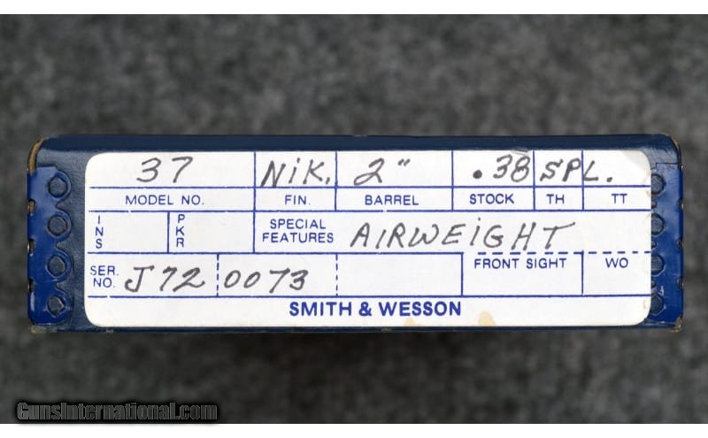 Description: For your consideration, a Smith & Wesson model 37 Airweight chambered in .38 Special. From the "N" stamp on the frame beneath the left grip panel, the nickel finish is factory. This piece dates to 1980. .38 Special SOLD Chambers: 5 Metal Condition: Excellent Wood Condition: Excellent Bore Condition: Excellent Barrels: 2 Triggers: Serrated Weight: .75 lbs Sights: Iron Sights Item Location: Hamburg, PA |