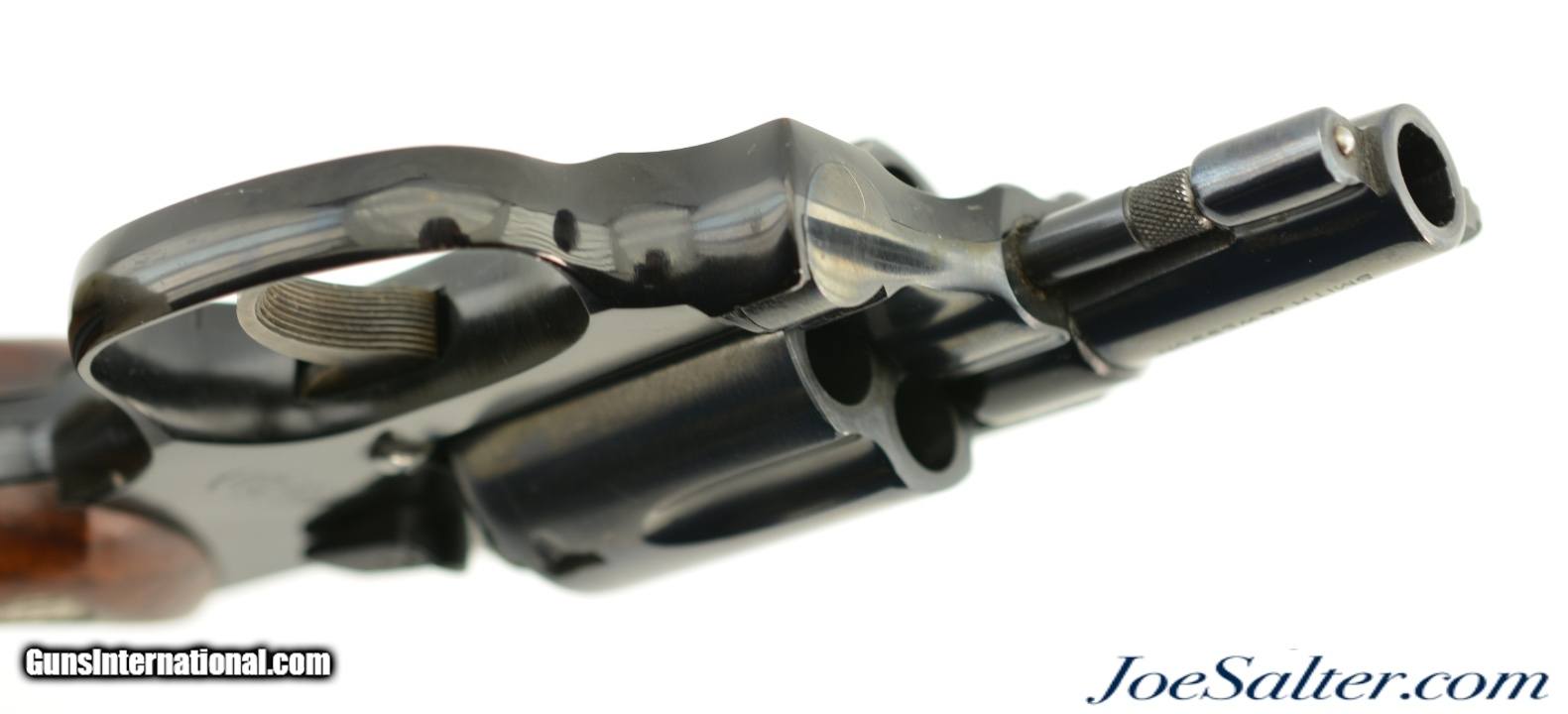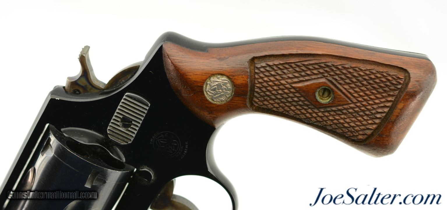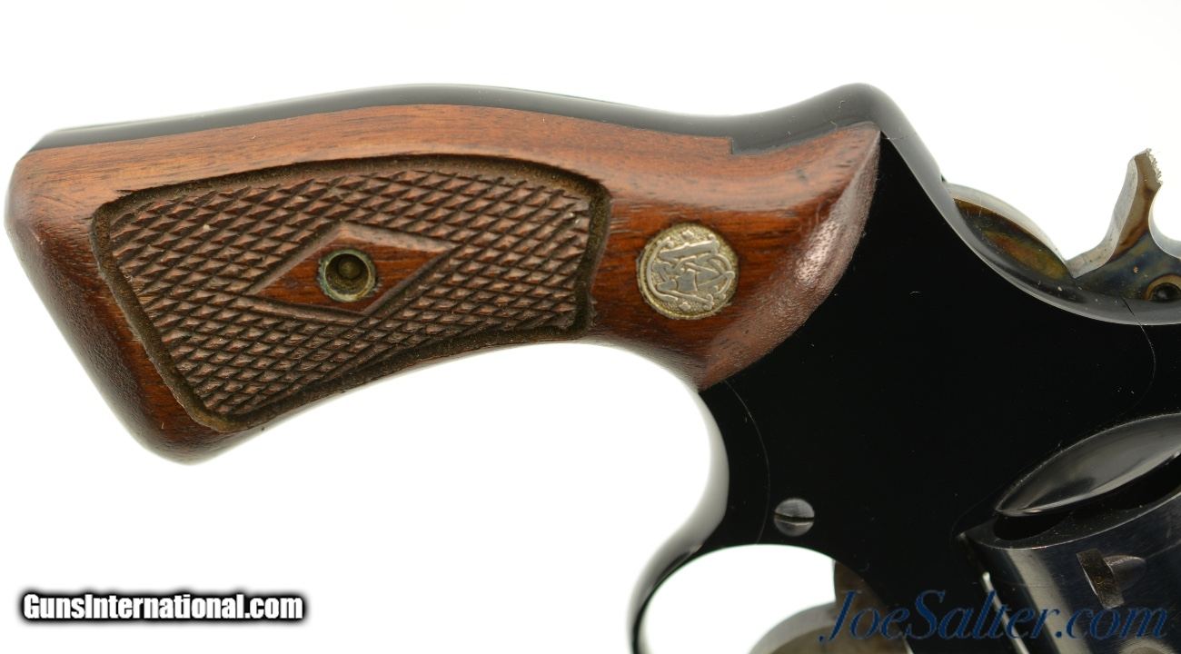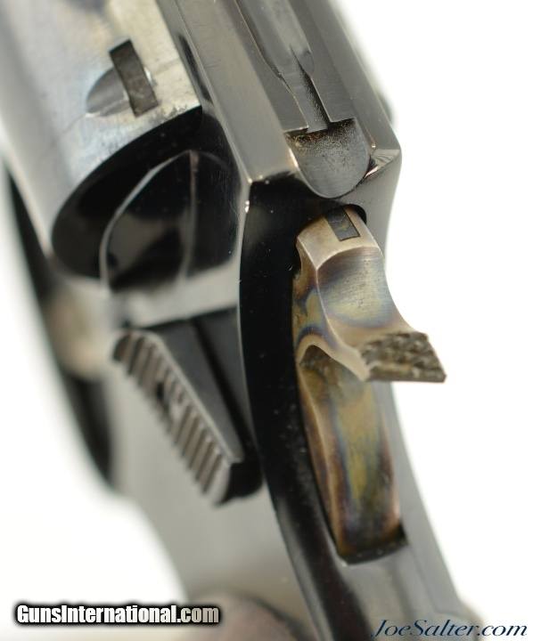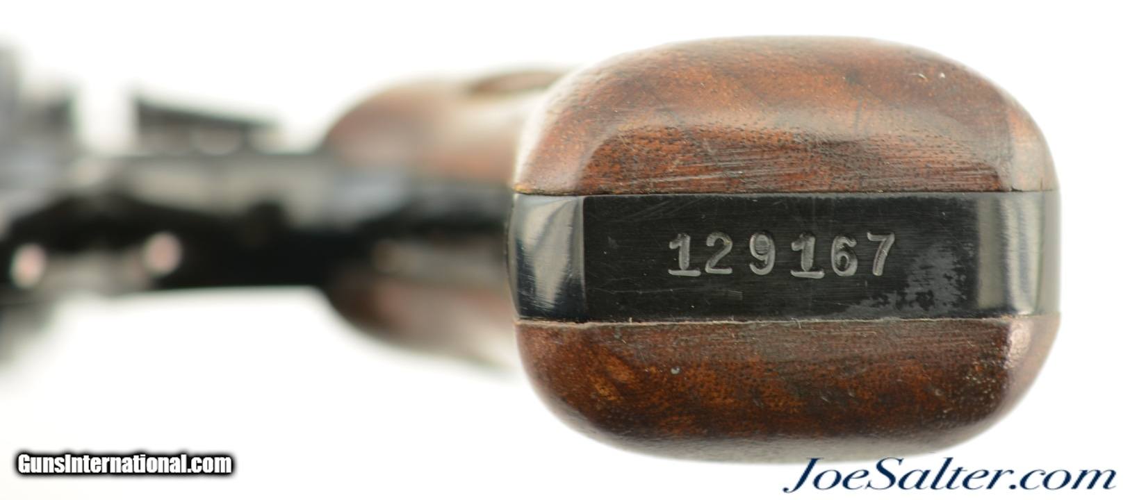 Description: Serial #129167, .38 Special, 2 inch barrel with a bright, excellent bore. This is the Smith & Wesson Pre-Model 37 Chiefs Special Airweight revolver with an aluminum alloy frame and flat latch manufactured from 1951-57. The barrel is marked Airweight. In excellent overall condition the only flaw is a broken edge of the hammer (see photos). The metal surfaces retain about 96-97% of the original finish with a faint drag line on the cylinder and some scattered light use and carry marks with the trigger and hammer showing the original bright case colors. The diamond center checkered walnut grips are numbered to the gun and remain in excellent condition. A very nice example of the Chiefs Special Airweight. FFL or C&R; Don't forget about Free 100% Guaranteed shipping & Insurance for orders over $500 and no CC fees. ; Price: $750.00 Contact Seller |