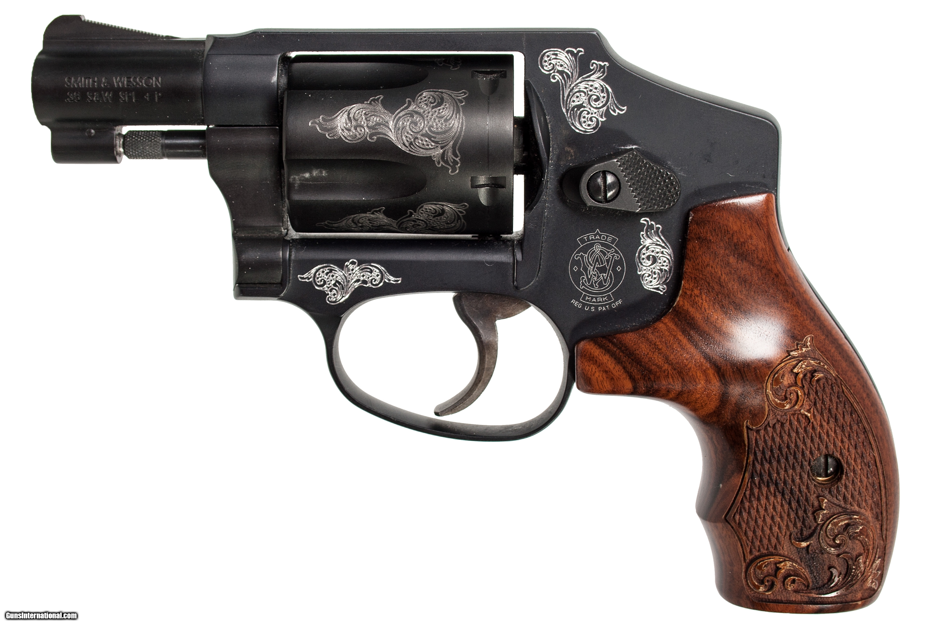 Smith & Wesson 442-1 chambered in 38 Spl with a 2 inch barrel custom engraving and a case. This gun is in excellent condition and is covered by Dury's Lifetime Warranty.