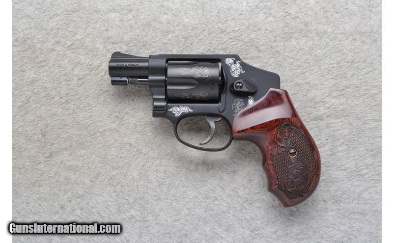 Description: This Smith & Wesson Model 442-1 is a 6 shot DAO revolver in .38 Special+P Cal. It has a 1 7/8 inch barrel. A blade front and integral notch rear sight. The walnut grip is checkered with finger grips and has scroll. The cylinder and frame sides are very nicely engraved with scroll. .38 Special + P SOLD Chambers: 5 round fluted cylinder. Metal Condition: Excellent. Wood Condition: Excellent. Bore Condition: Excellent. Barrels: 1 7/8 inch. Triggers: DAO Weight: 16 oz. Sights: Blade front. Integral notch rear. Item Location: Richfield, WI |