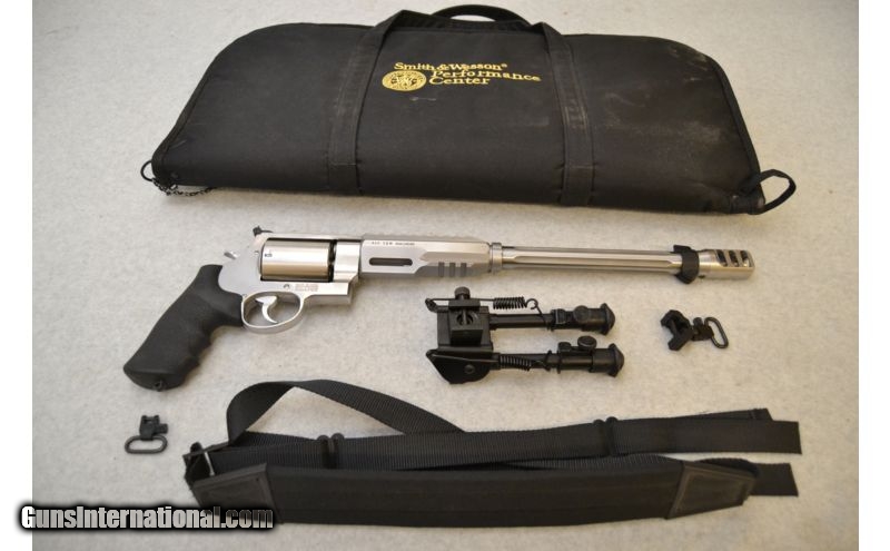 Description: Overall condition of this revolver is almost excellent but falling just a hair shy of being almost like new in box. The metal is free of any corrosion but the rail segments have some rub marks on and in them from where equipment was mounted. There are some other extremely minor handling marks and a faint rotation line on the cylinder as well. Grips are in great condition. The bore is in excellent condition with a great shine with strong lands and grooves. This example-as all the Performance Center models do-starts as a "basic" firearm from Smith & Wesson before being redone or finished into a firearm designed to stand above the others of its class in ability and craftsmanship. Standard among the jobs their Performance Center shop performs is a tuned action and trigger coupled with a trigger stop. Boasting "the highest muzzle velocity of any production revolver on earth"; Smith & Wesson designated this version the "XVR" meaning "X-treme Velocity Revolver". This revolver is more than capable of reaching out and getting the job done. SOLD Caliber Info: .460 Smith & Wesson Magnum Chambers: Revolver with 5-shot cylinder. Metal Condition: Very good to excellent. Wood Condition: Grips are in excellent condition. Bore Condition: Excellent. Barrels: 14" Stainless steel with deep fluting and muzzle break. Triggers: Matte hard chrome with smooth surface. Stock: Black synthetic "combat style" grips. Fore End: Section of Picatinny rail for bi-pod mounting. Weight: 5 1/2lbs Sights: Fully adjustable rear sight and front blade. Also has a section of Picatinny rail forward of the frame. Extras: Includes a soft case, 2 sling loop mounts, sling, and bi-pod. Item Location: Green Bay, WI |