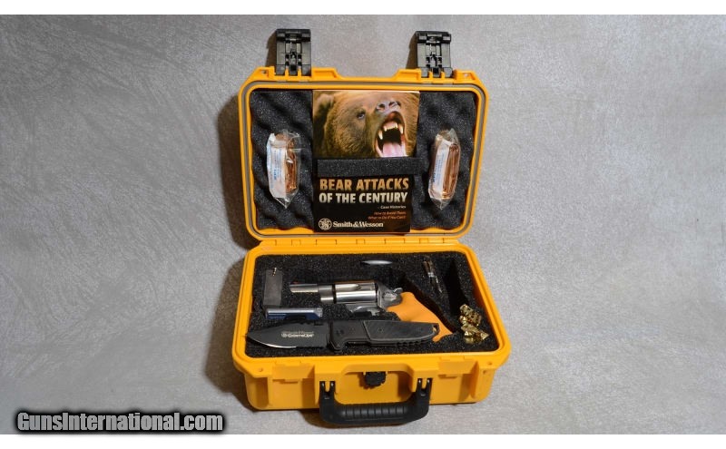 Description: This is a used Smith & Wesson 460ES Emergency Survival revolver chambered in 460 Smith & Wesson Magnum. It features 2.75-in full lug barrel, 5-round fluted cylinder, red ramp front sight, adjustable rear sight, rubber grips with lanyard loop, stainless finish, and internal lock. Includes yellow hard case, instruction manual, internal lock, spent shell casing, two emergency blankets, bear attack survival book, hand saw, compass, signaling mirror, flint striker, and Smith & Wesson Extreme ops knife with sheath. Overall, this Smith & Wesson is in good condition with normal cylinder draglines. This would be a good choice for collecting. .460 S&W Magnum SOLD Chambers: Double Action Revolver Metal Condition: Excellent Wood Condition: Combat Rubber Grips Bore Condition: Excellent Barrels: 2 3/4" Barrel Triggers: Factory Trigger Weight: 3 1/2 lbs. Sights: Ramped Patridge Front Sight with Orange Insert and Adjustable Rear Sight Item Location: Tulalip, WA |
