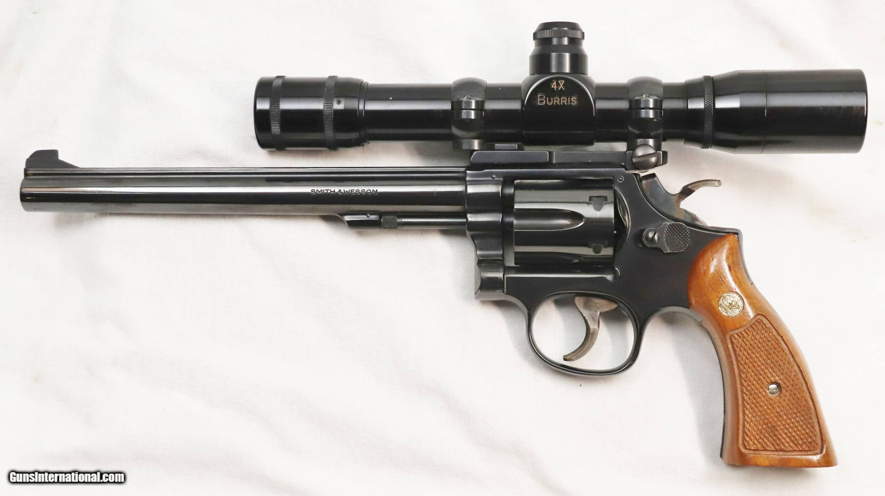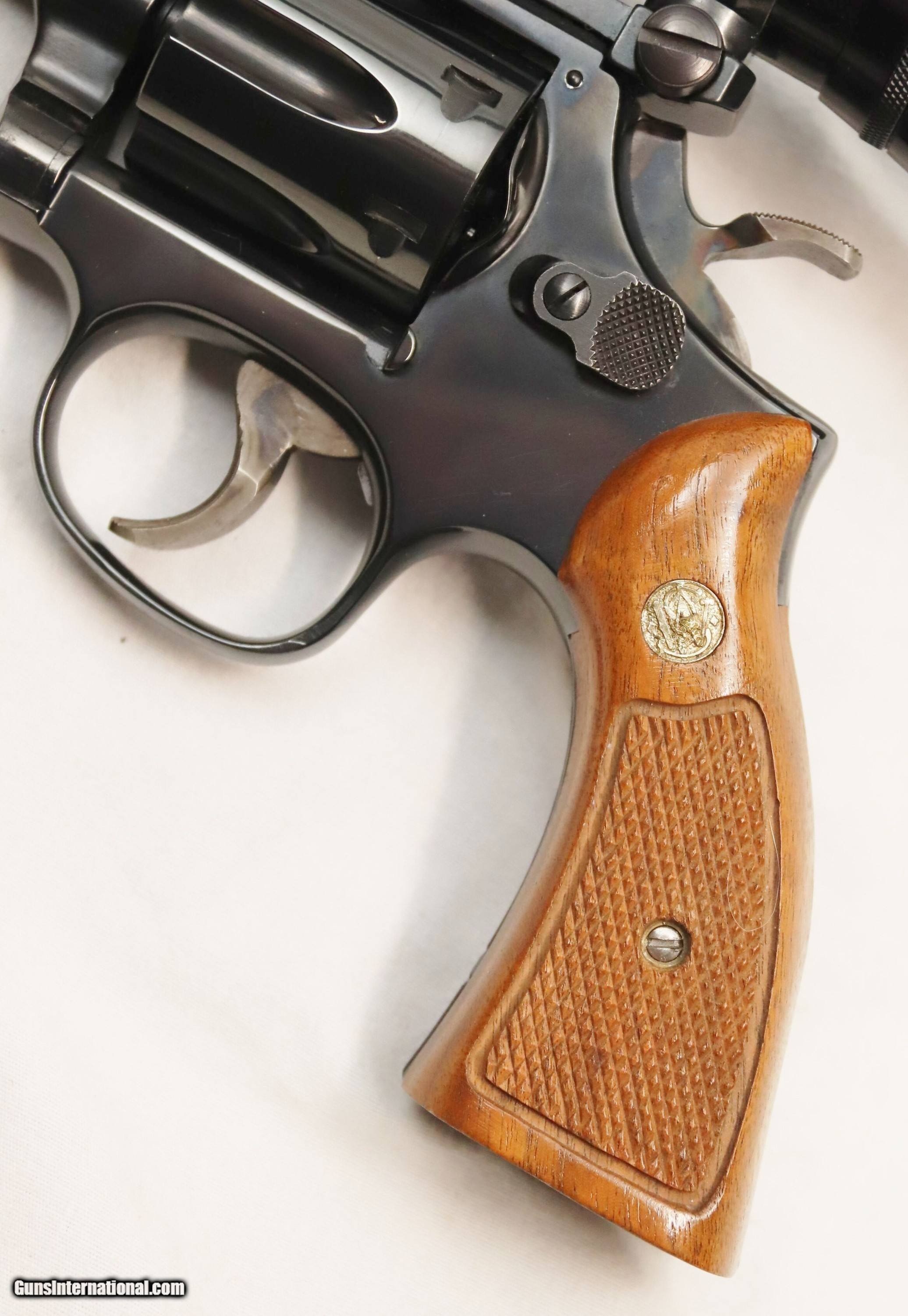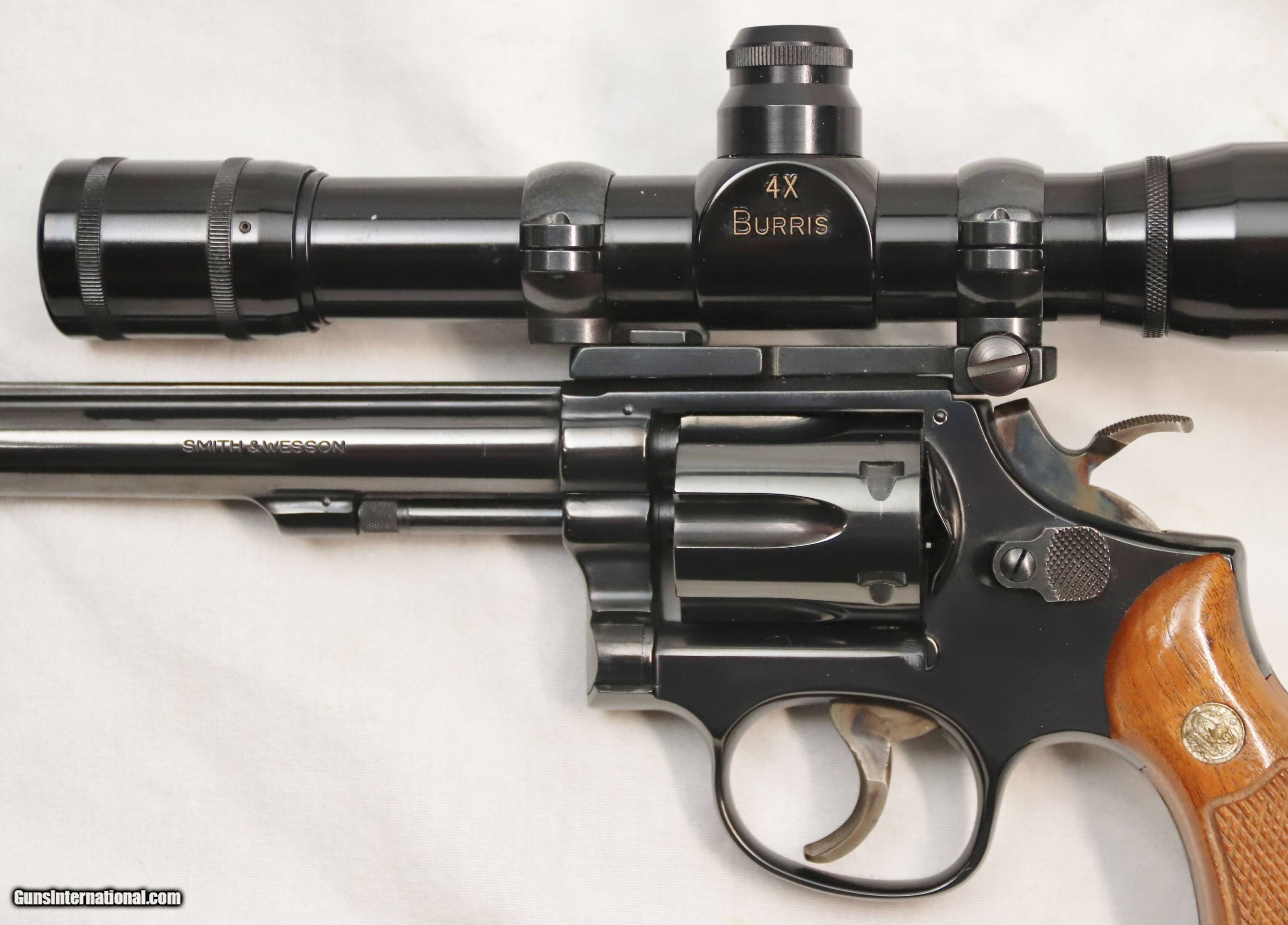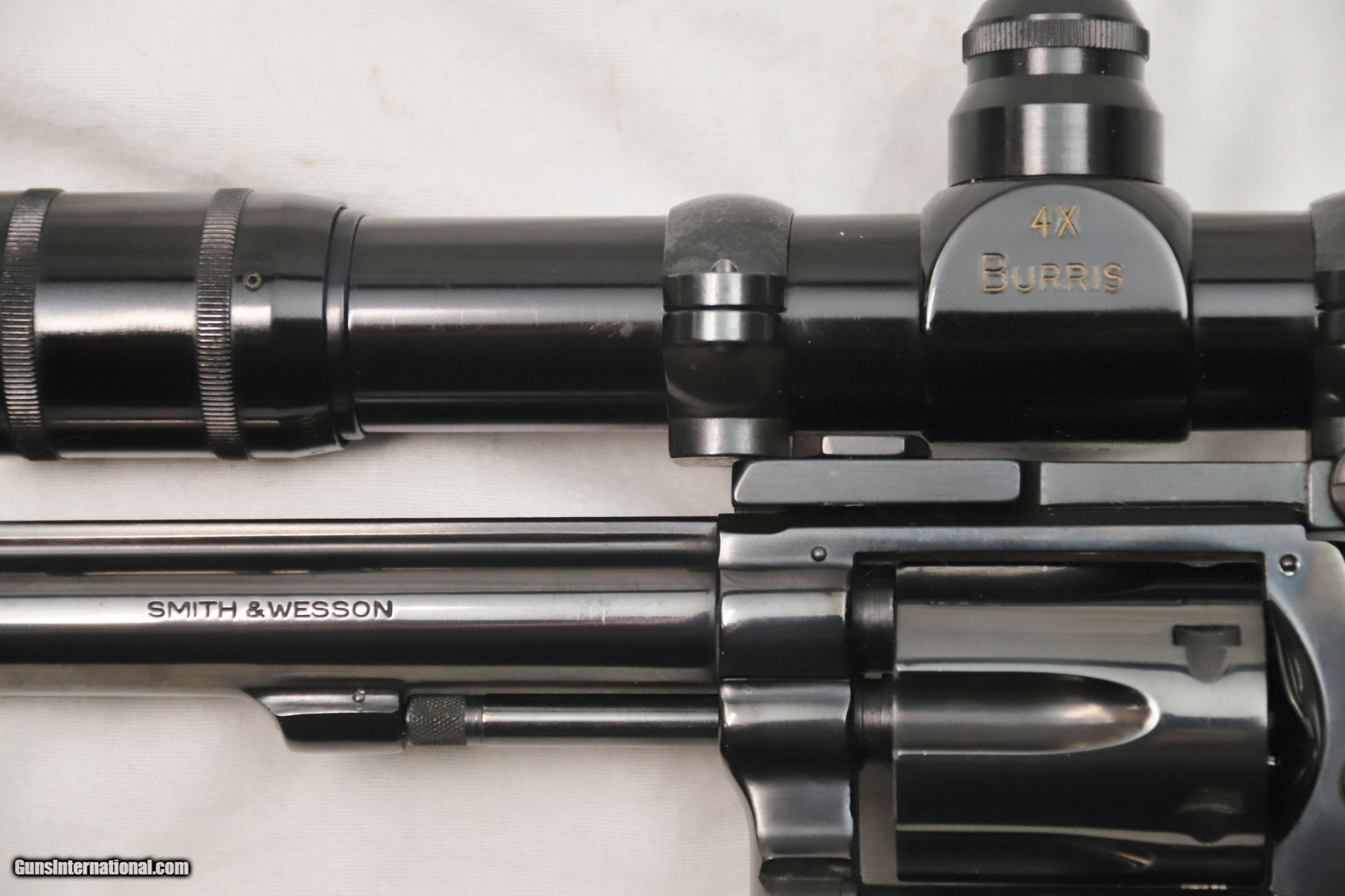 This S&W revolver has been upgraded with a target hammer and trigger an action job and a Burris 4X Scope. The scope optics are clear with a fine cross hair. The original trigger, hammer and sight have been saved and are included. The original box and all paperwork are included as well. Obviously, the revolver with the scope mounted will not fit in the box. Three holes have been drilled in the top strap to mount the scope; I don’t know if the original sight will cover them.