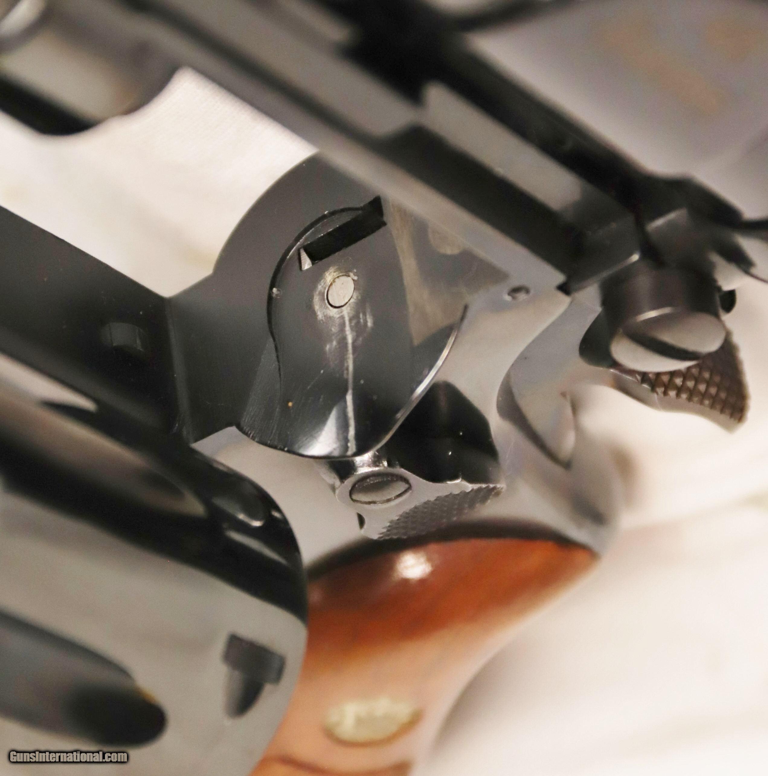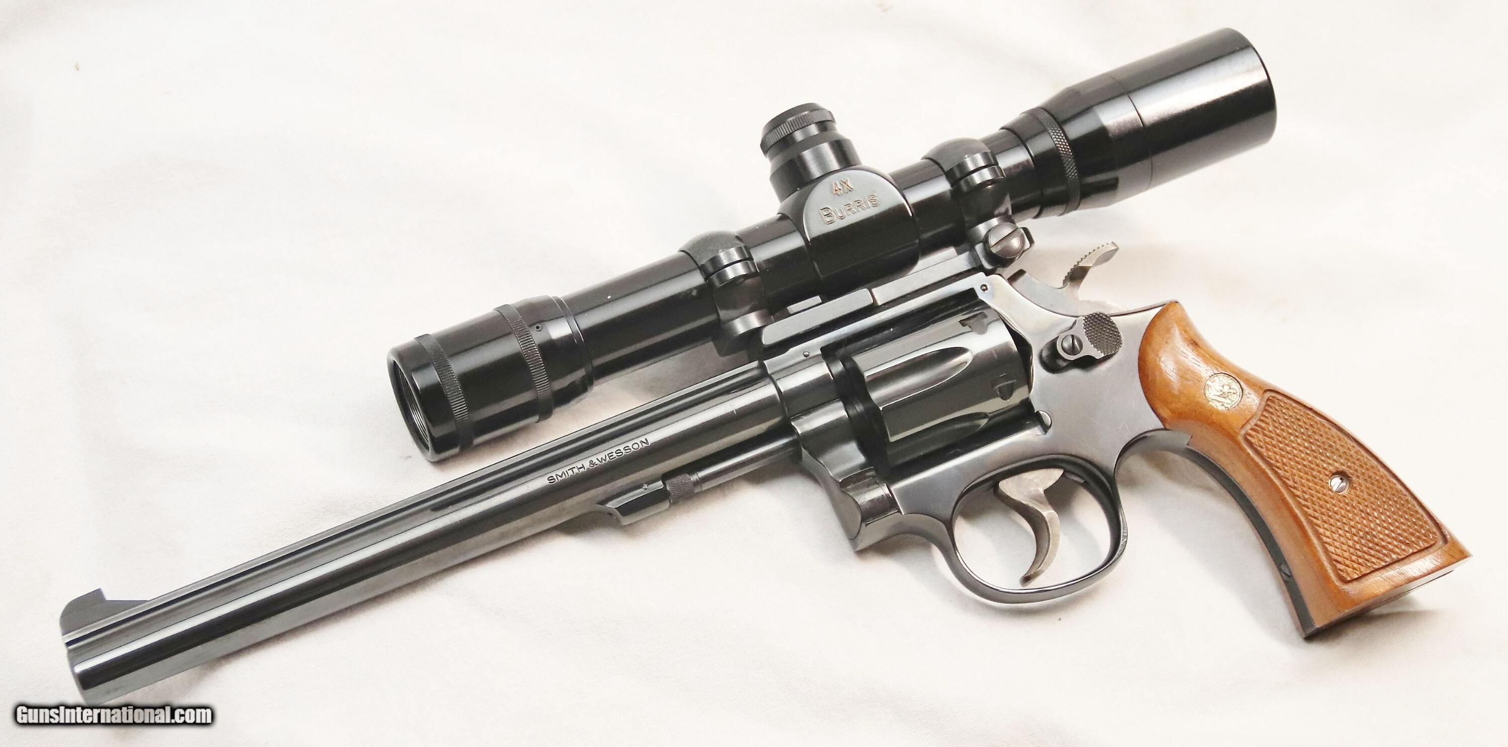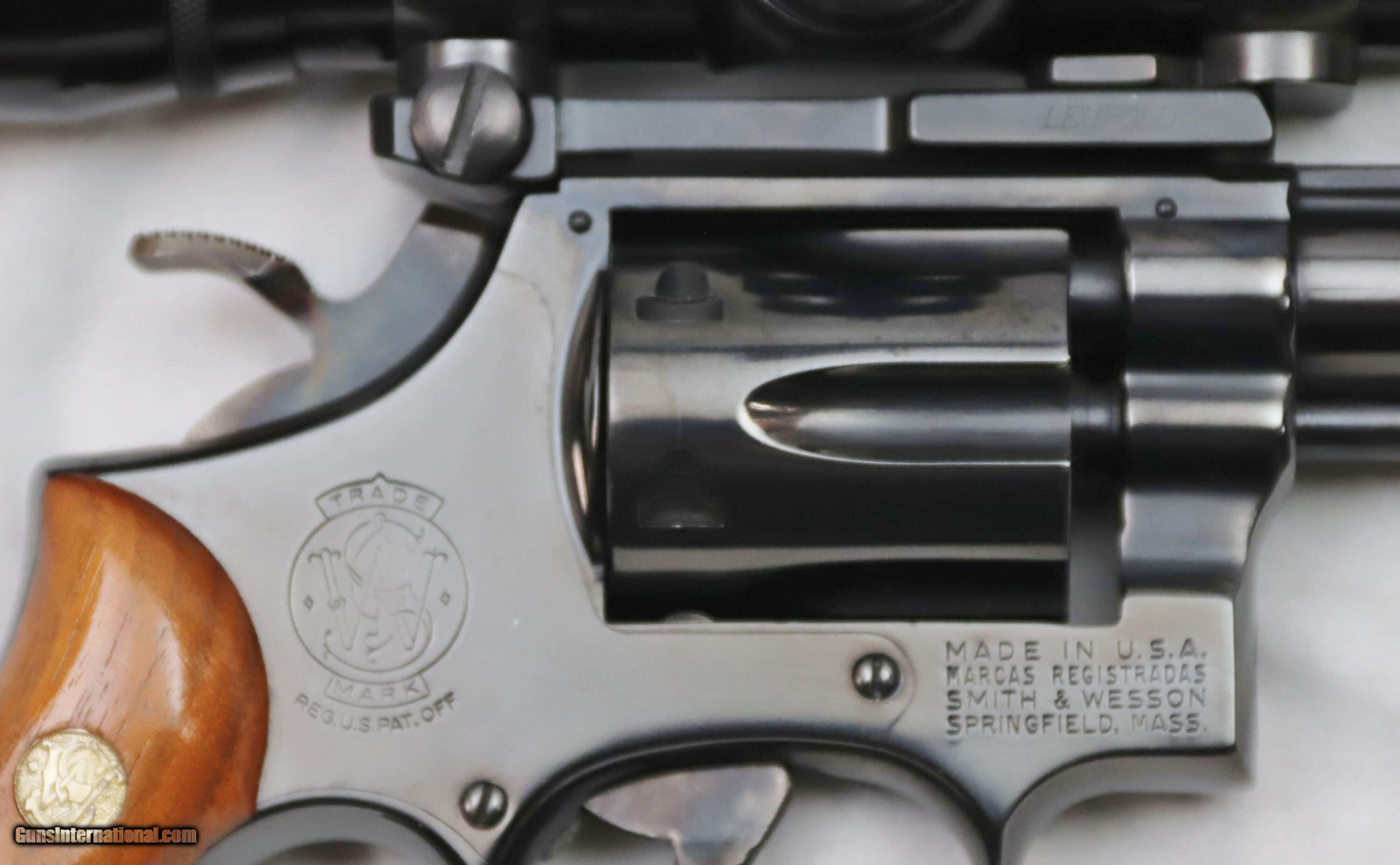 This S&W revolver has been upgraded with a target hammer and trigger an action job and a Burris 4X Scope. The scope optics are clear with a fine cross hair. The original trigger, hammer and sight have been saved and are included. The original box and all paperwork are included as well. Obviously, the revolver with the scope mounted will not fit in the box. Three holes have been drilled in the top strap to mount the scope; I don’t know if the original sight will cover them.