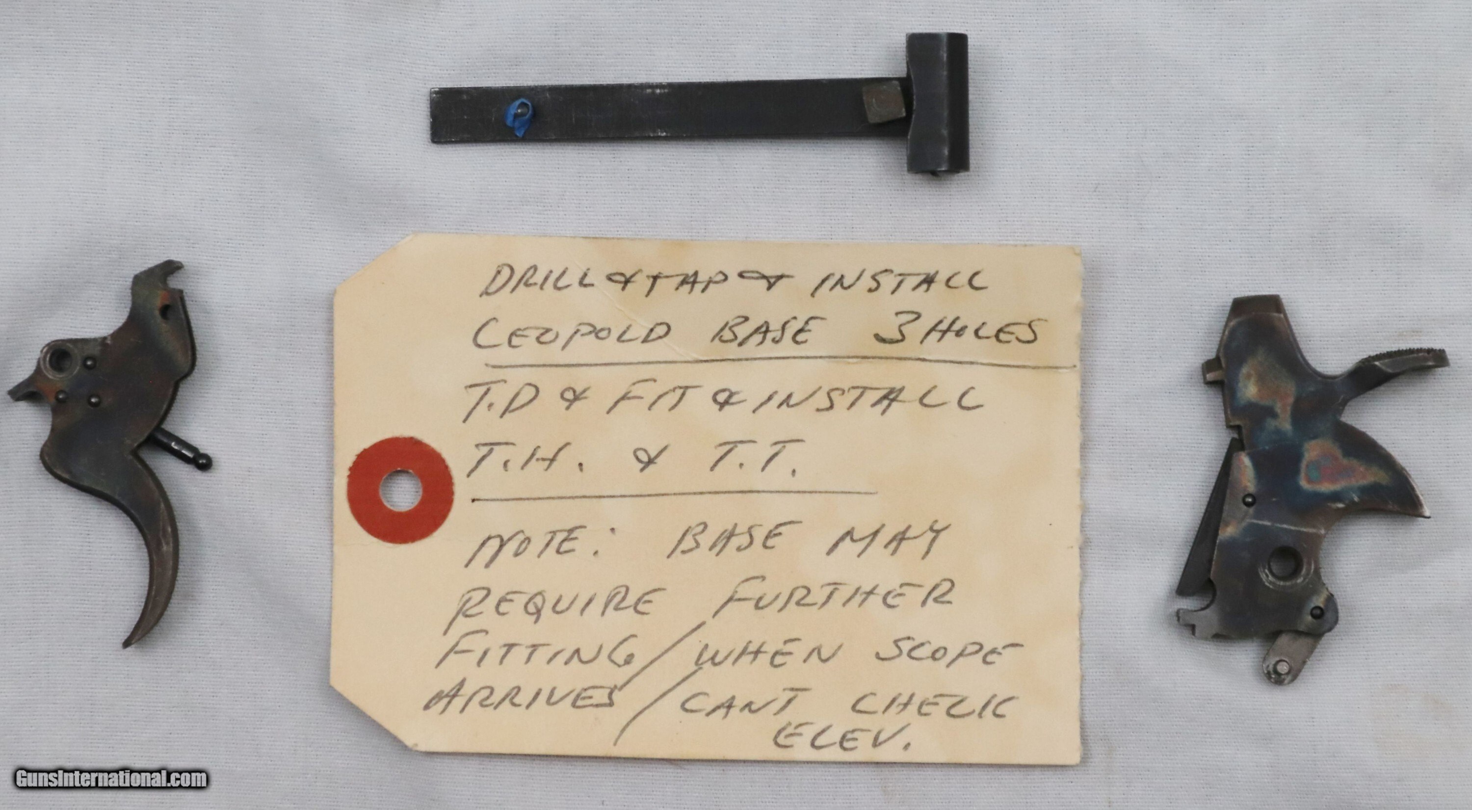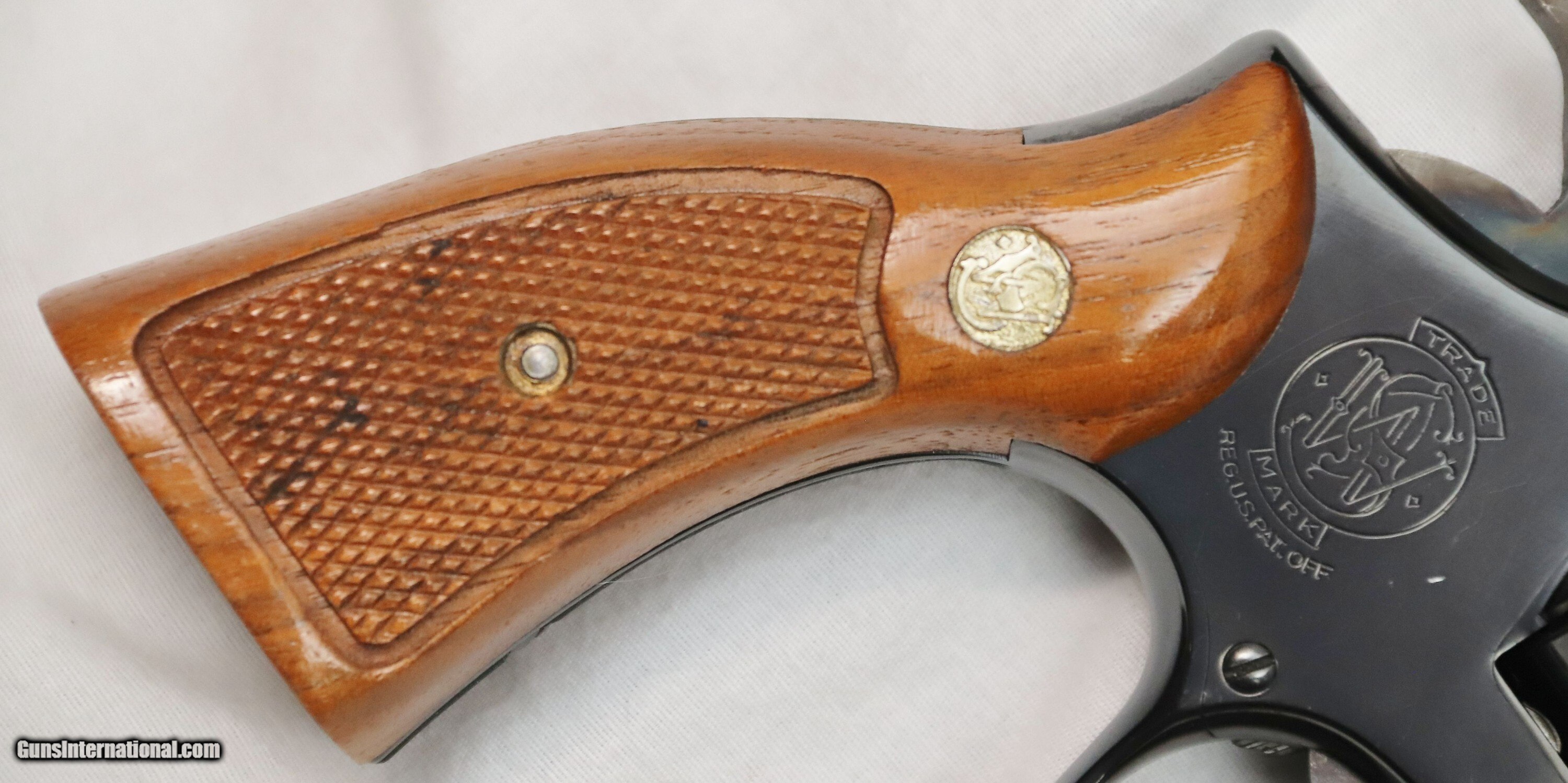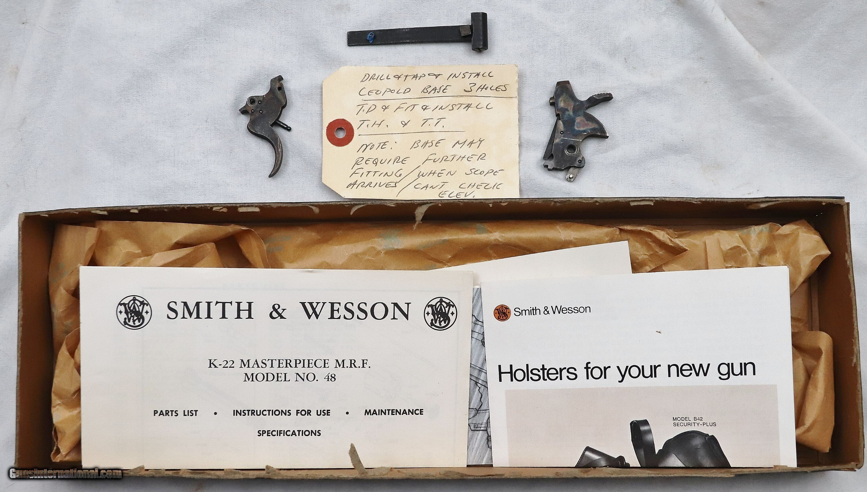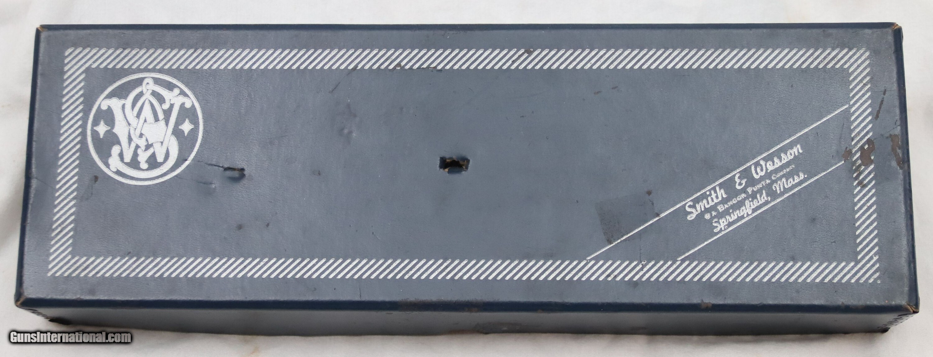 This S&W revolver has been upgraded with a target hammer and trigger an action job and a Burris 4X Scope. The scope optics are clear with a fine cross hair. The original trigger, hammer and sight have been saved and are included. The original box and all paperwork are included as well. Obviously, the revolver with the scope mounted will not fit in the box. Three holes have been drilled in the top strap to mount the scope; I don’t know if the original sight will cover them.