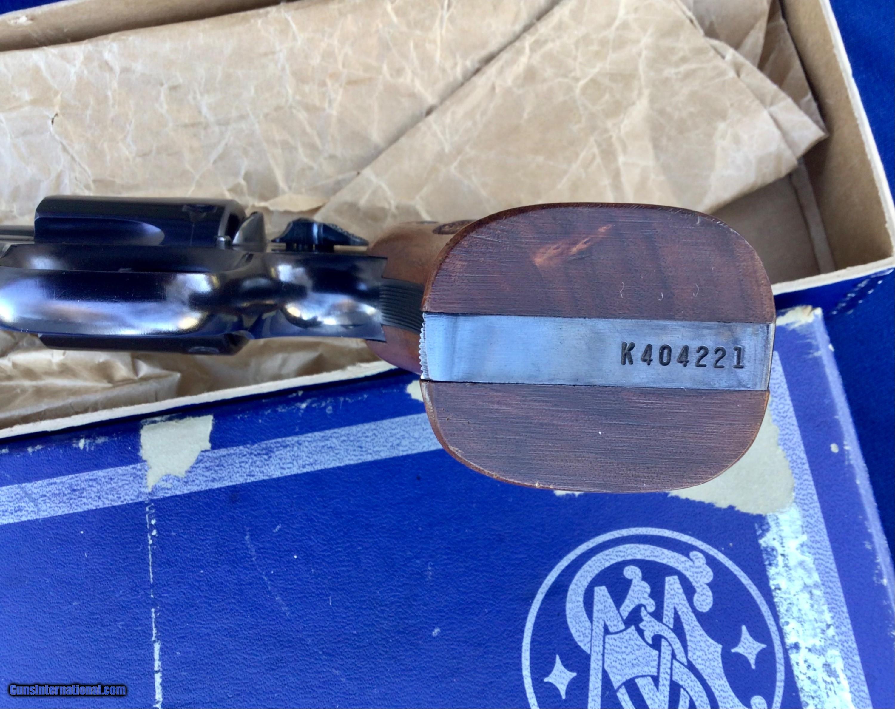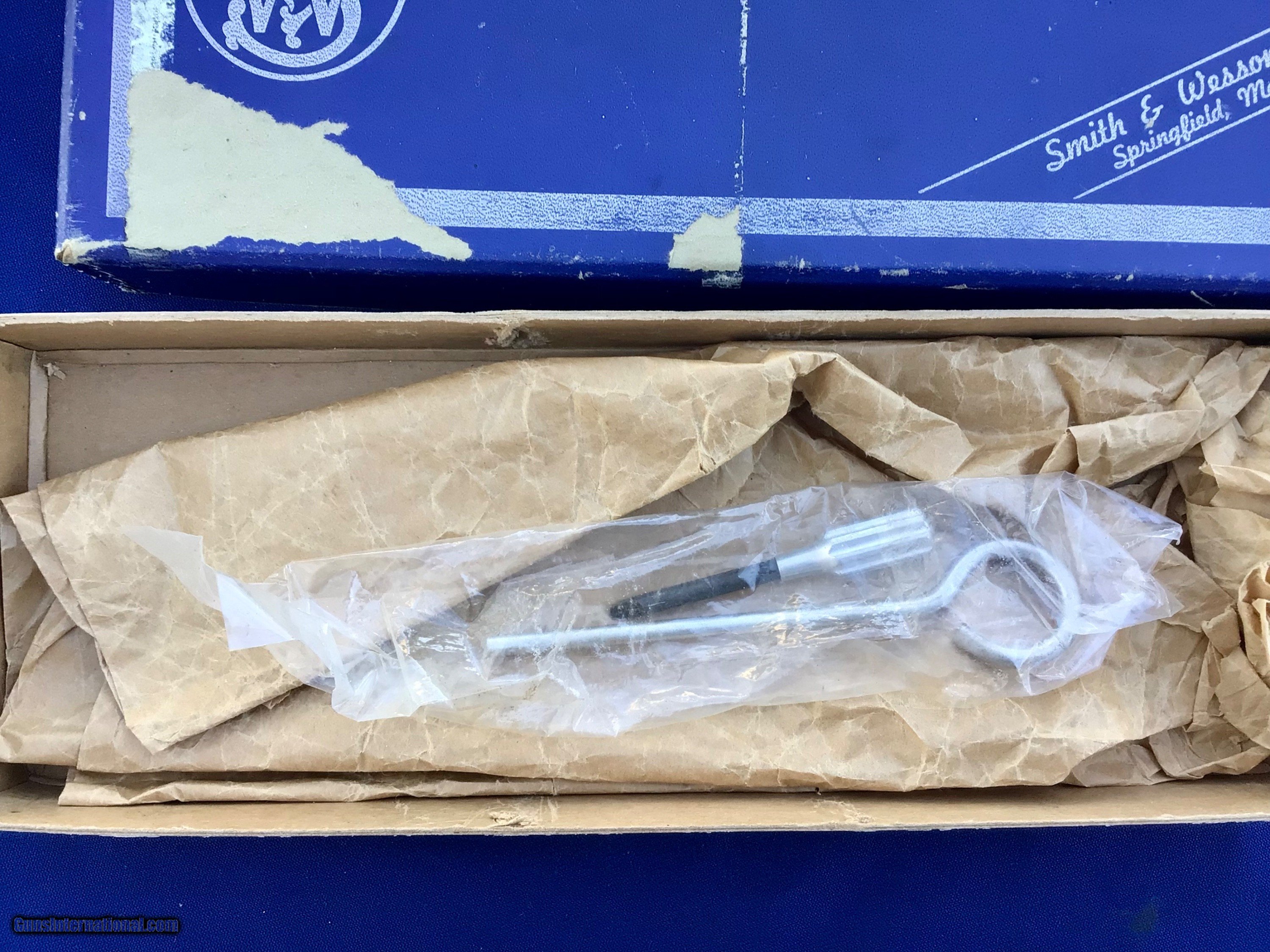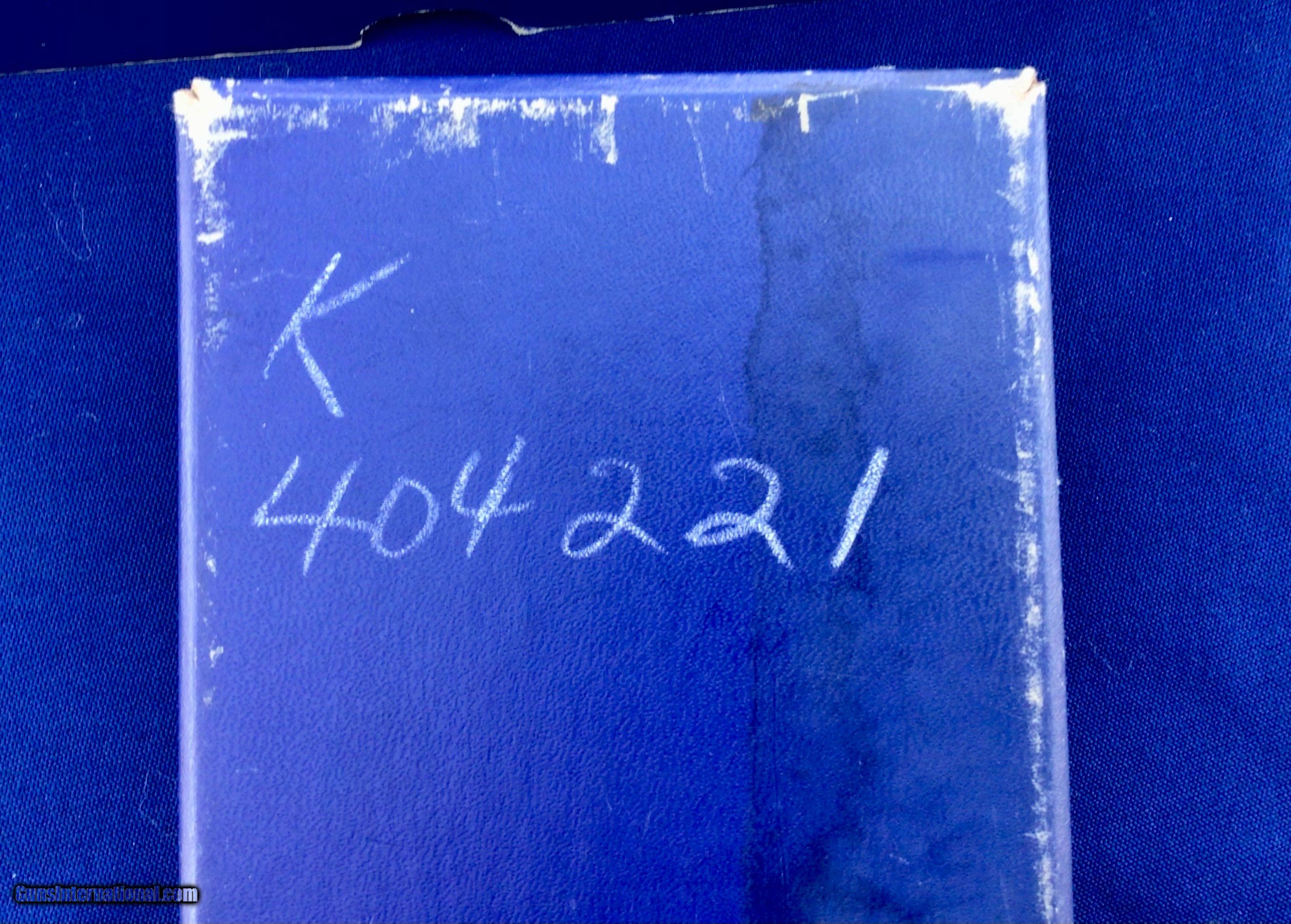 Description: Smith & Wesson model 48 .22 magnum, first year production (approximately 1959) with the four screw frame and 6" barrel, original bright blue finish, and walnut diamond magna stocks with matching number. Included is the factory numbered matching box with tools. Overall it retains 99% of the original blue finish showing only a faint turn line and little to no evidence of firing. The stocks show minor handling evidence. This is an investment grade Smith & Wesson. Please contact me via email, and I will respond promptly. References provided upon request. SOLD Curio/Relic: Yes |